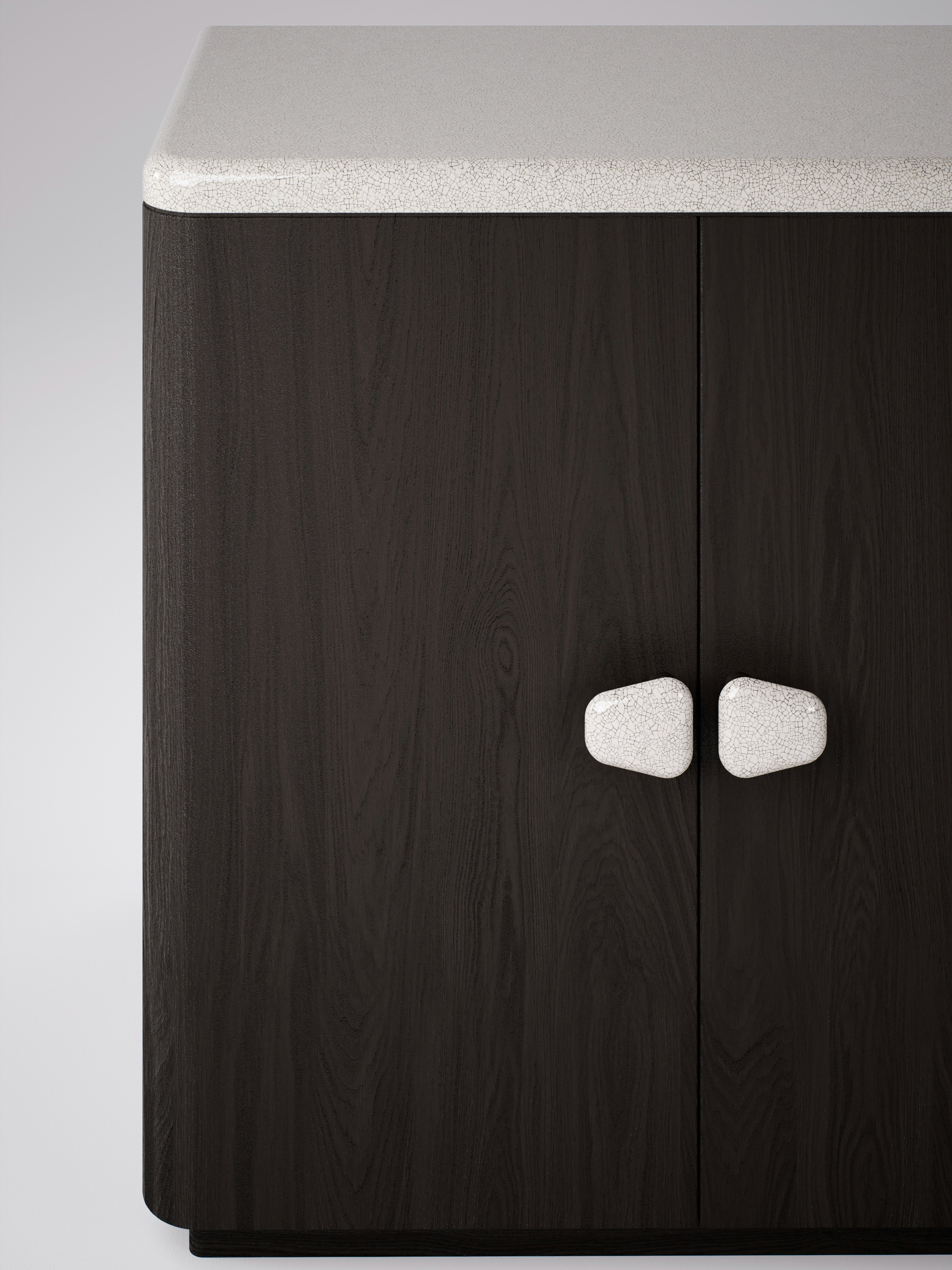 Console table pictured in black oak with a Lava Stone Crème brûlée tabletop.