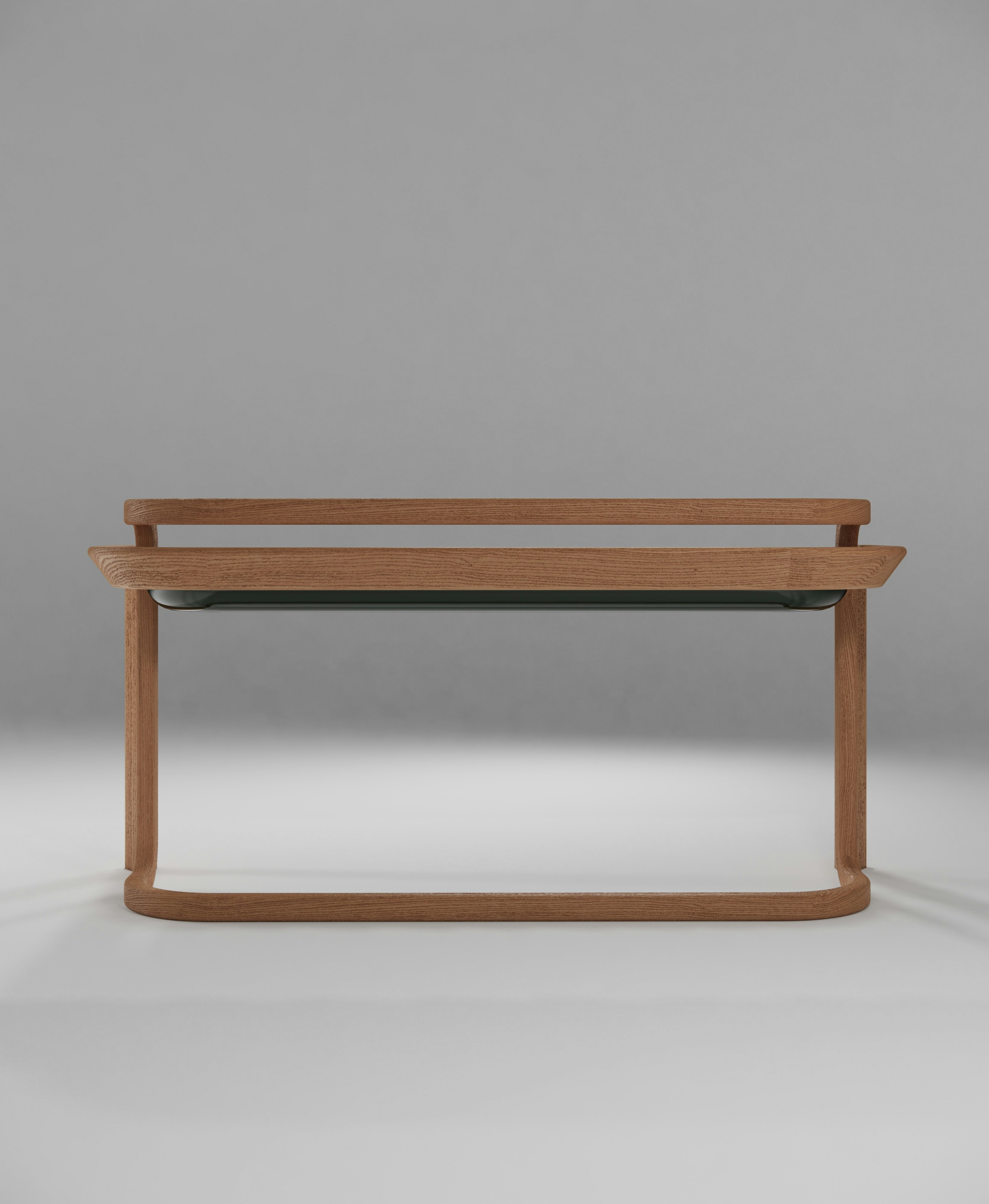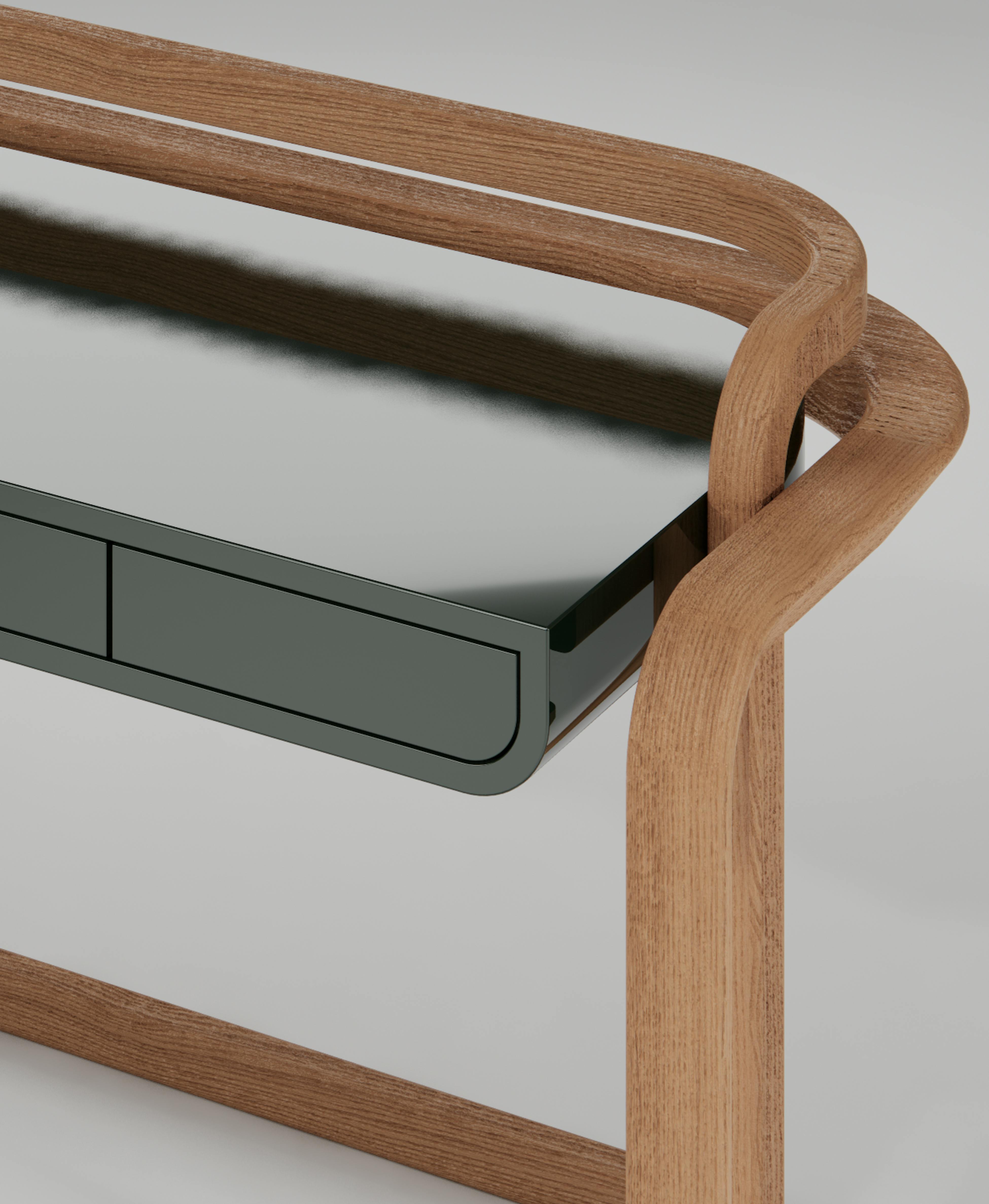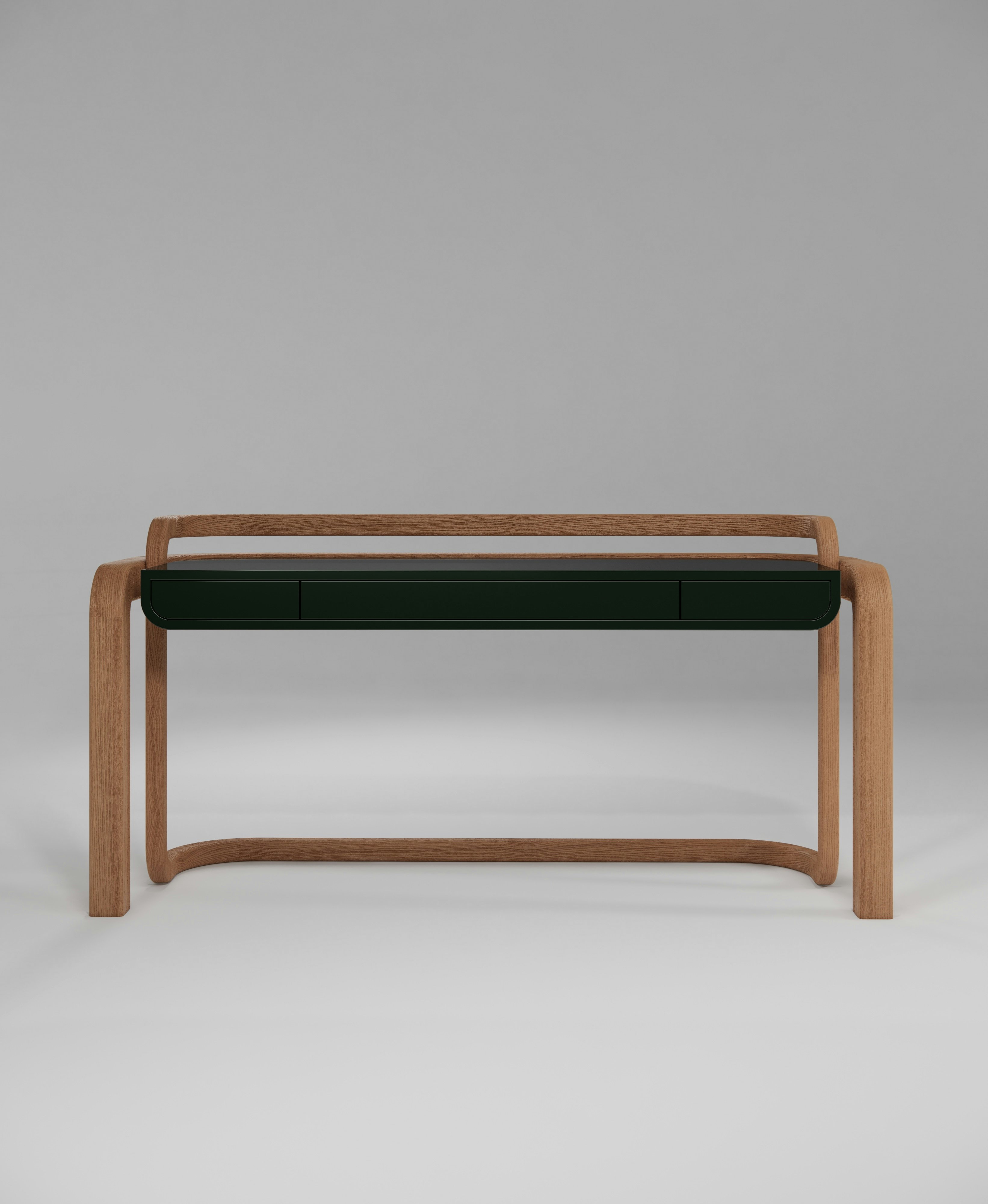 Desk/Console pictured with a natural oak body and a fir green lacquer tabletop.