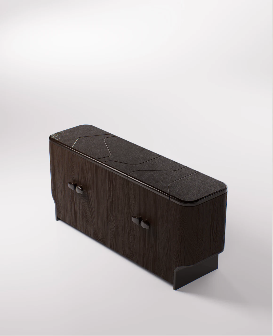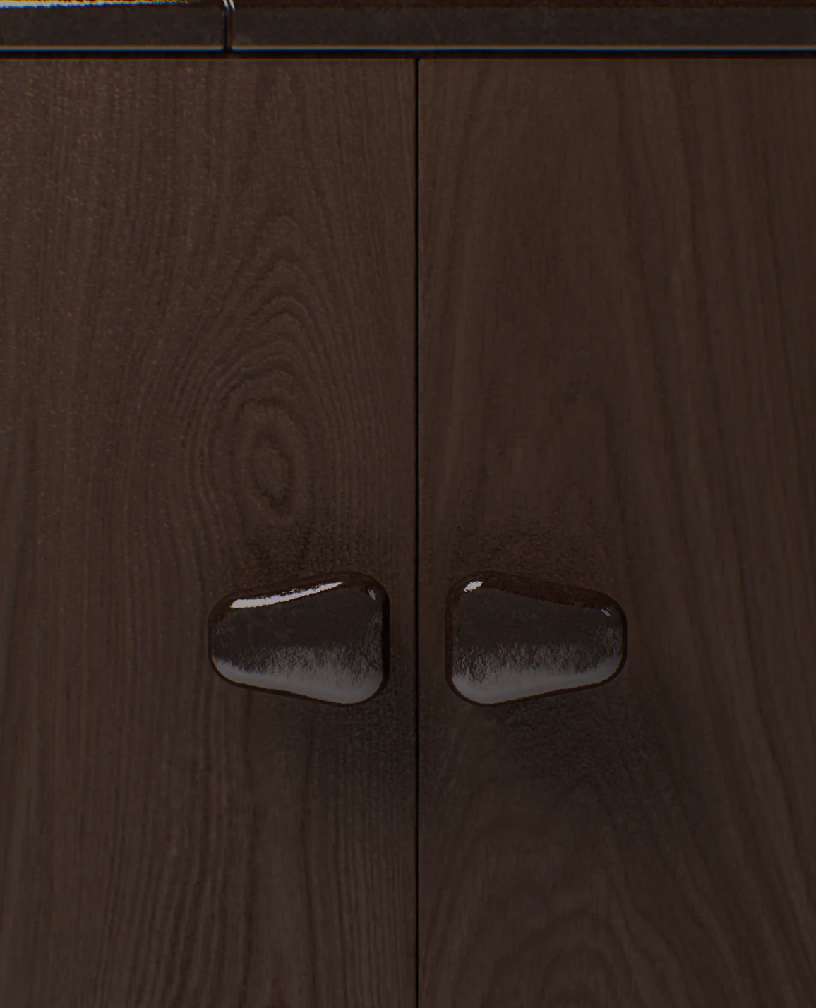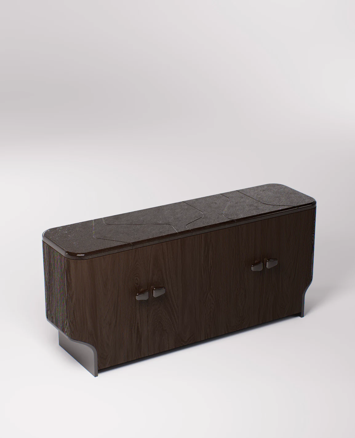 Cabinet pictured in light brown oak with handles and top in lava stone.