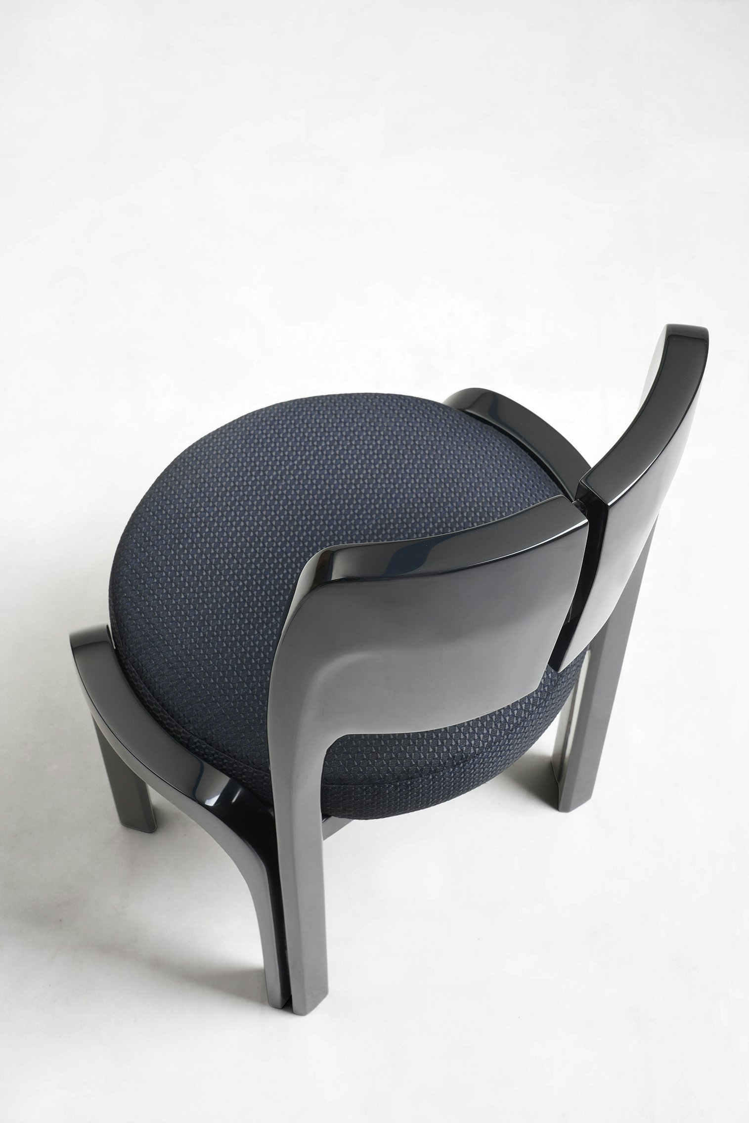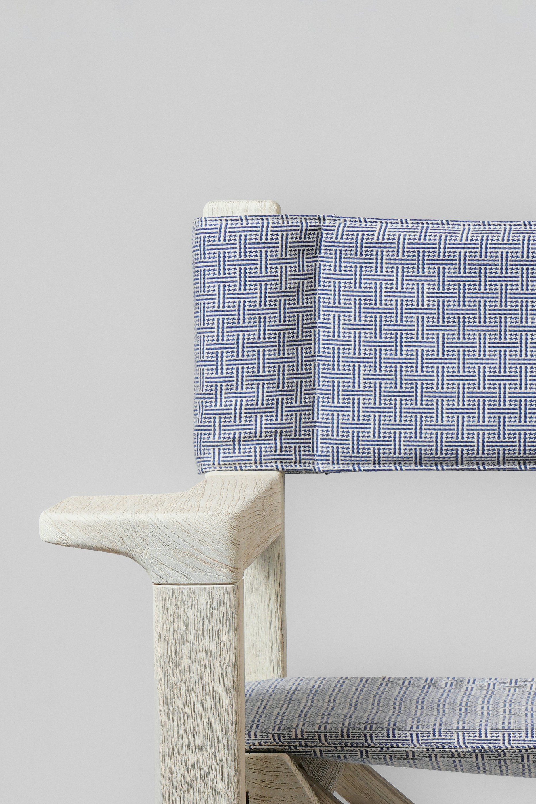 The back and seat are upholstered with Brickell by Schumacher.