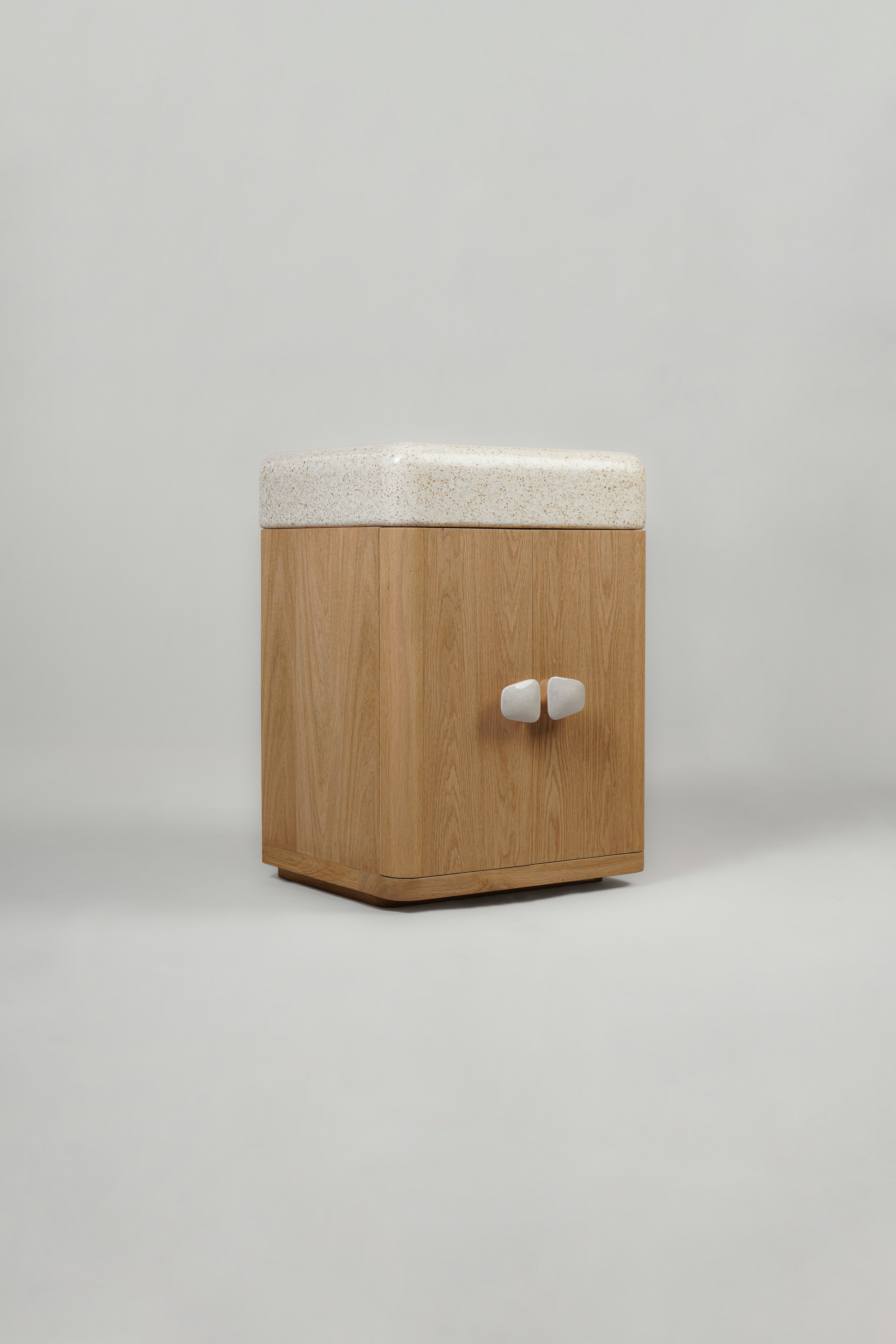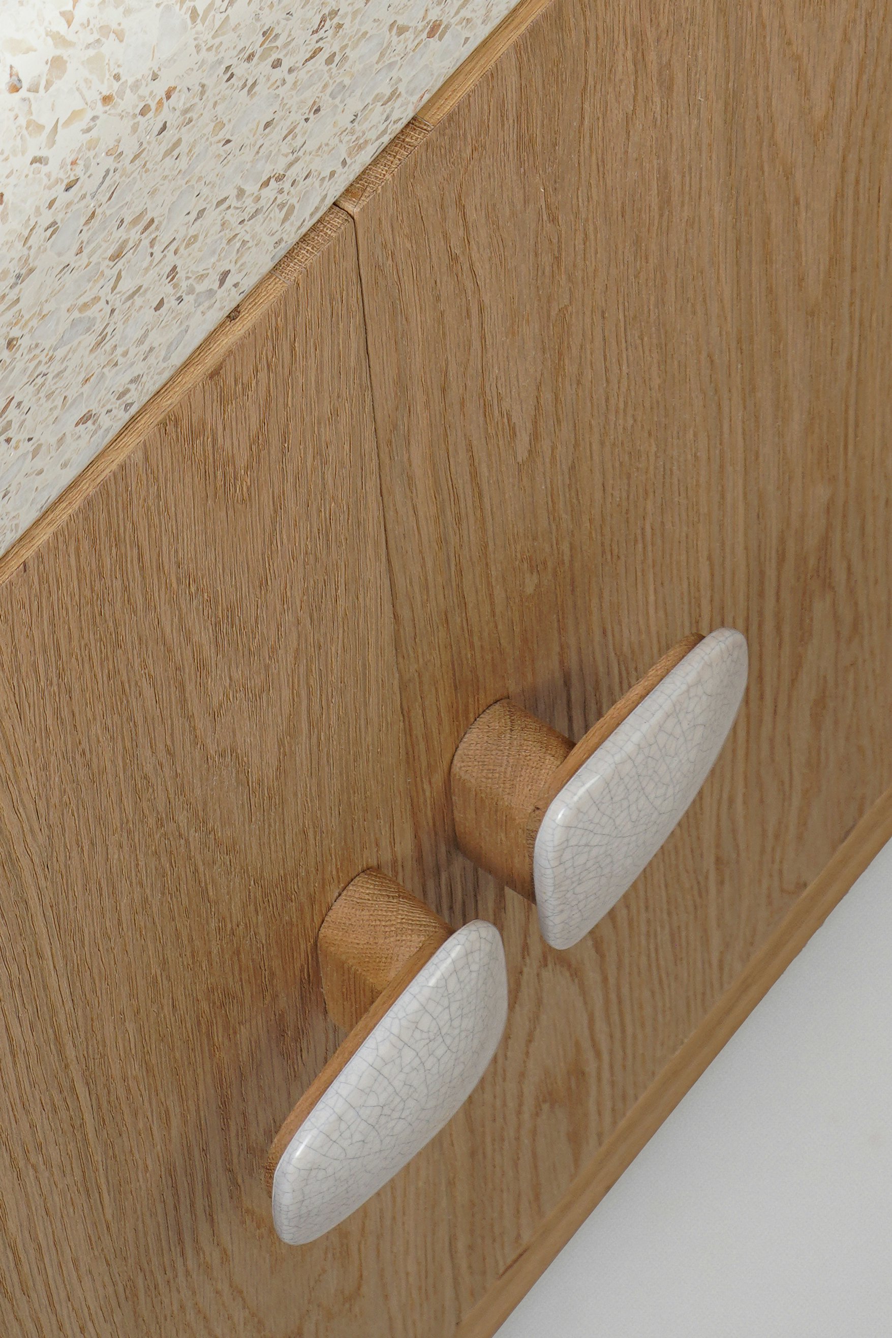 Vanity sink pictured in natural oak with a terrazzo sink and lava stone white crackle handles.