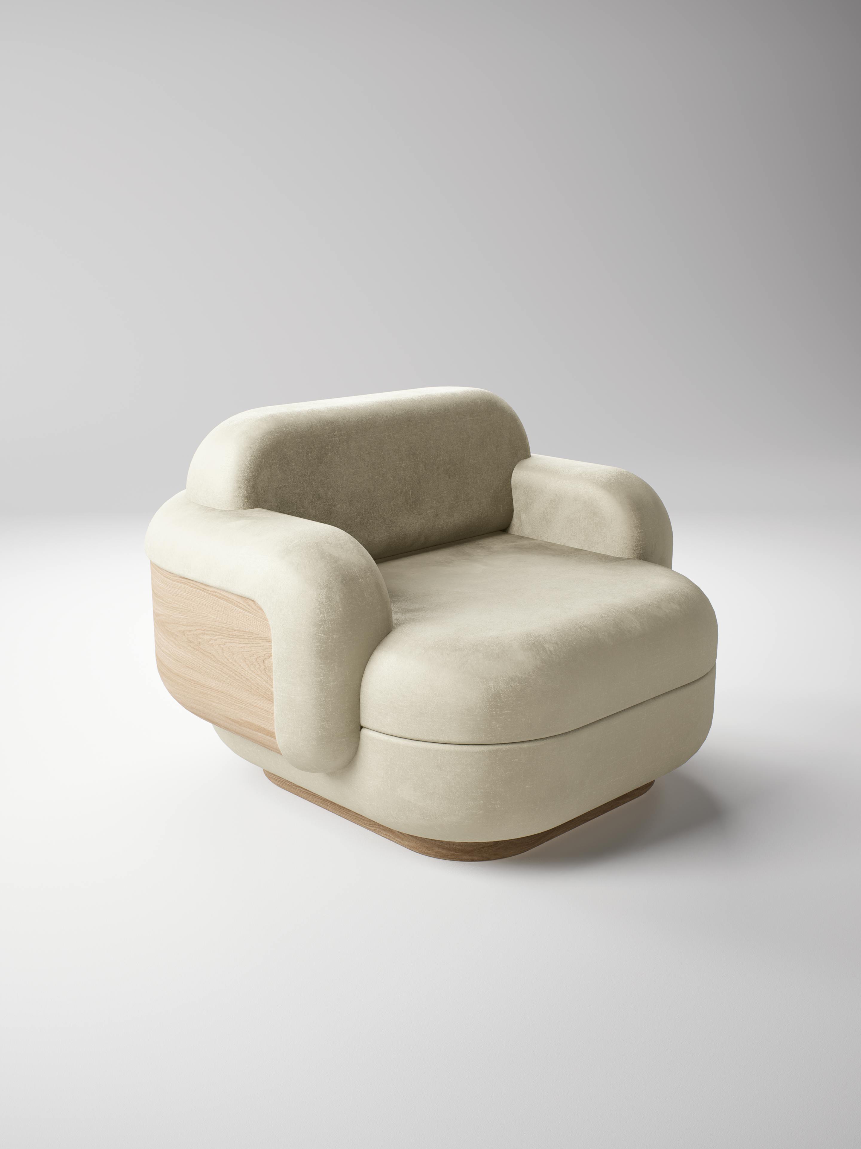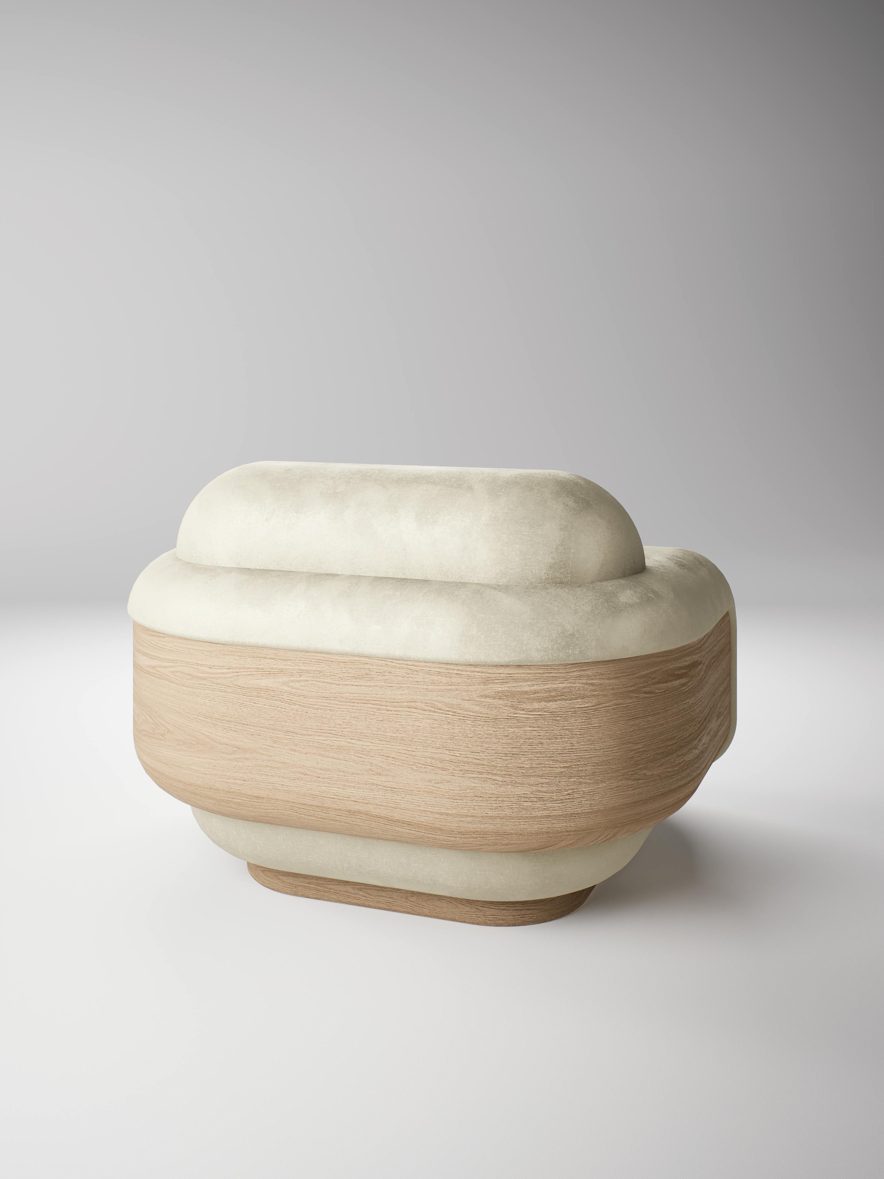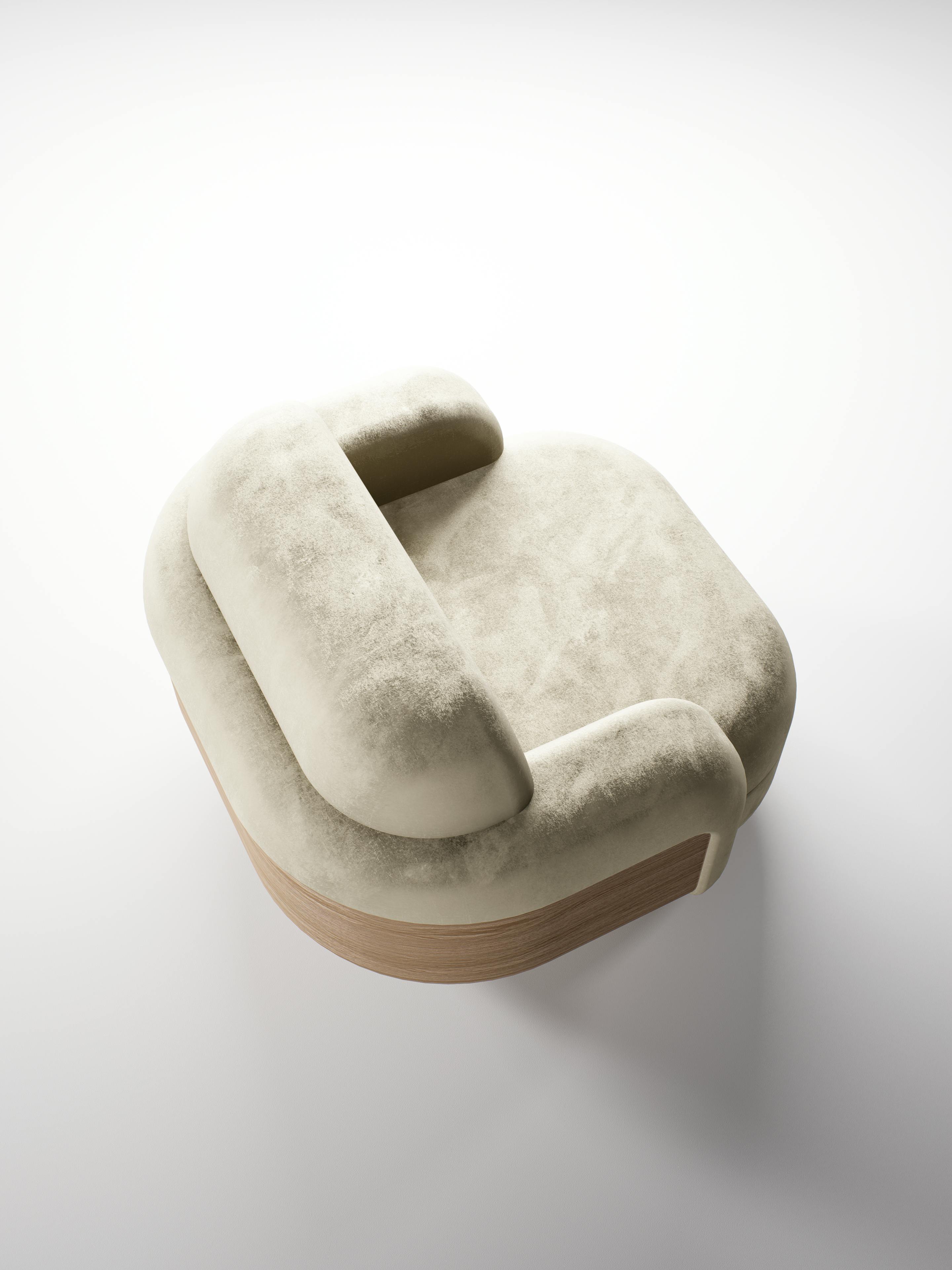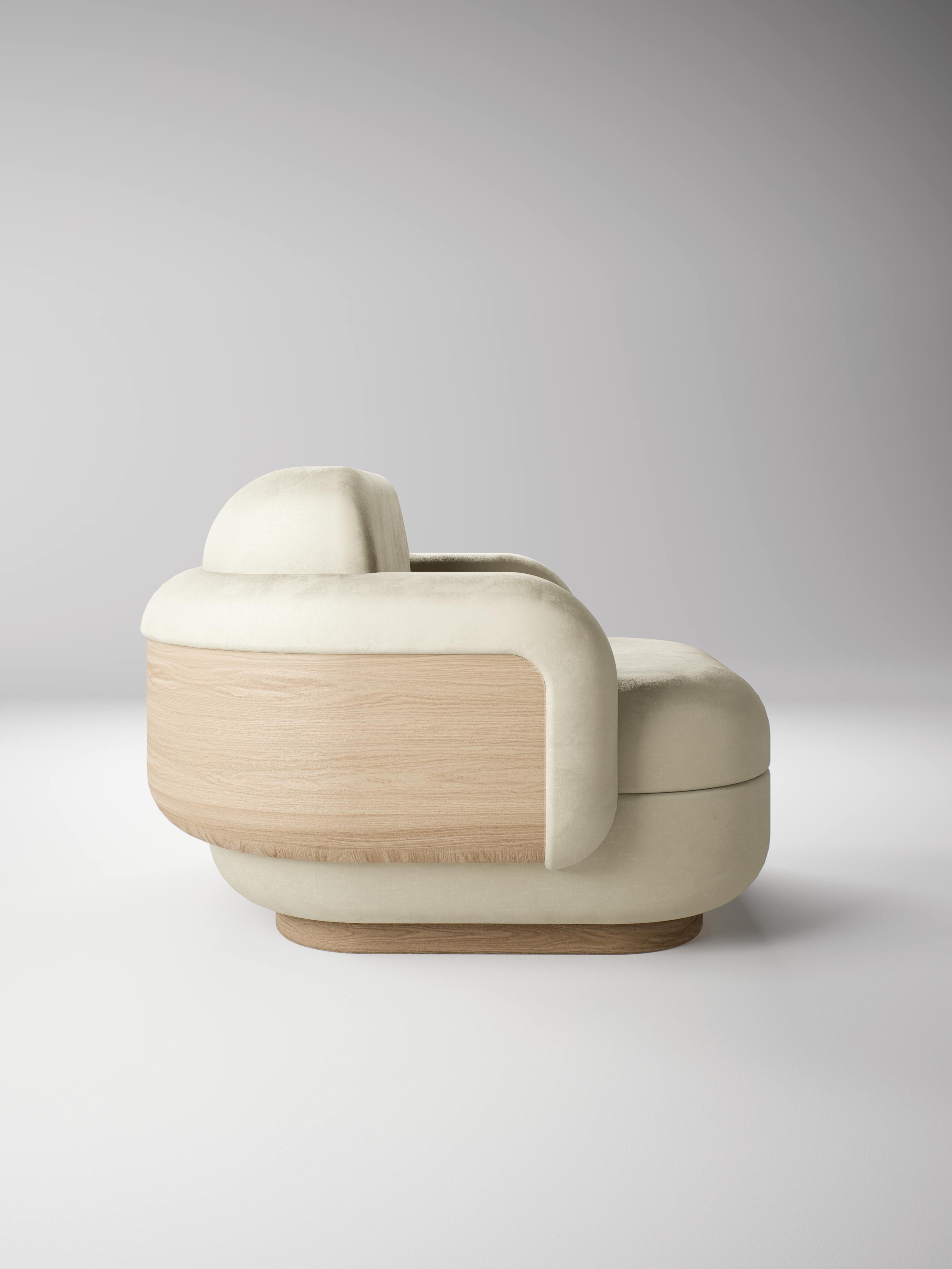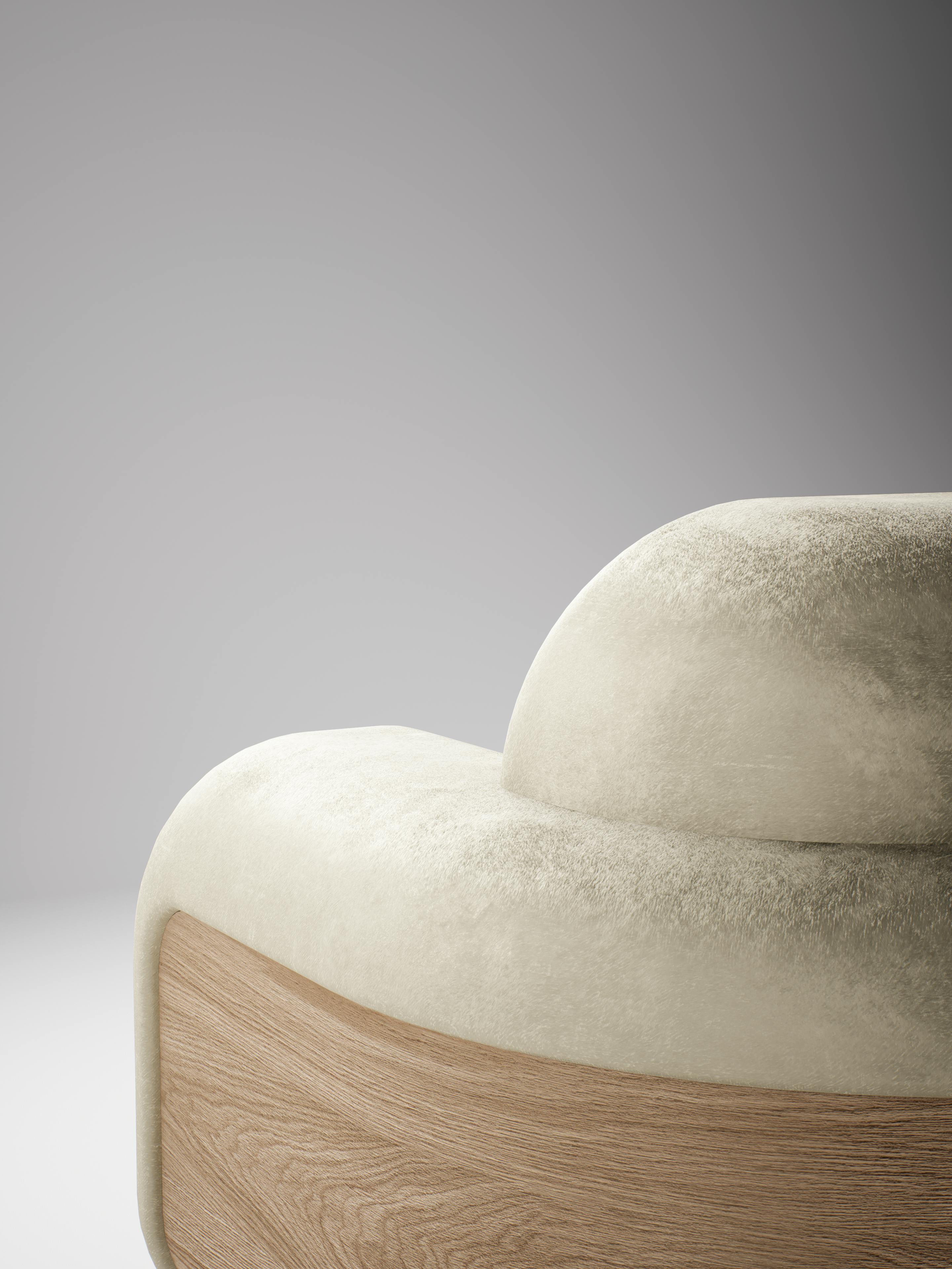 The back and seat are upholstered with Adorabile Alpaca Banguise by Dedar.