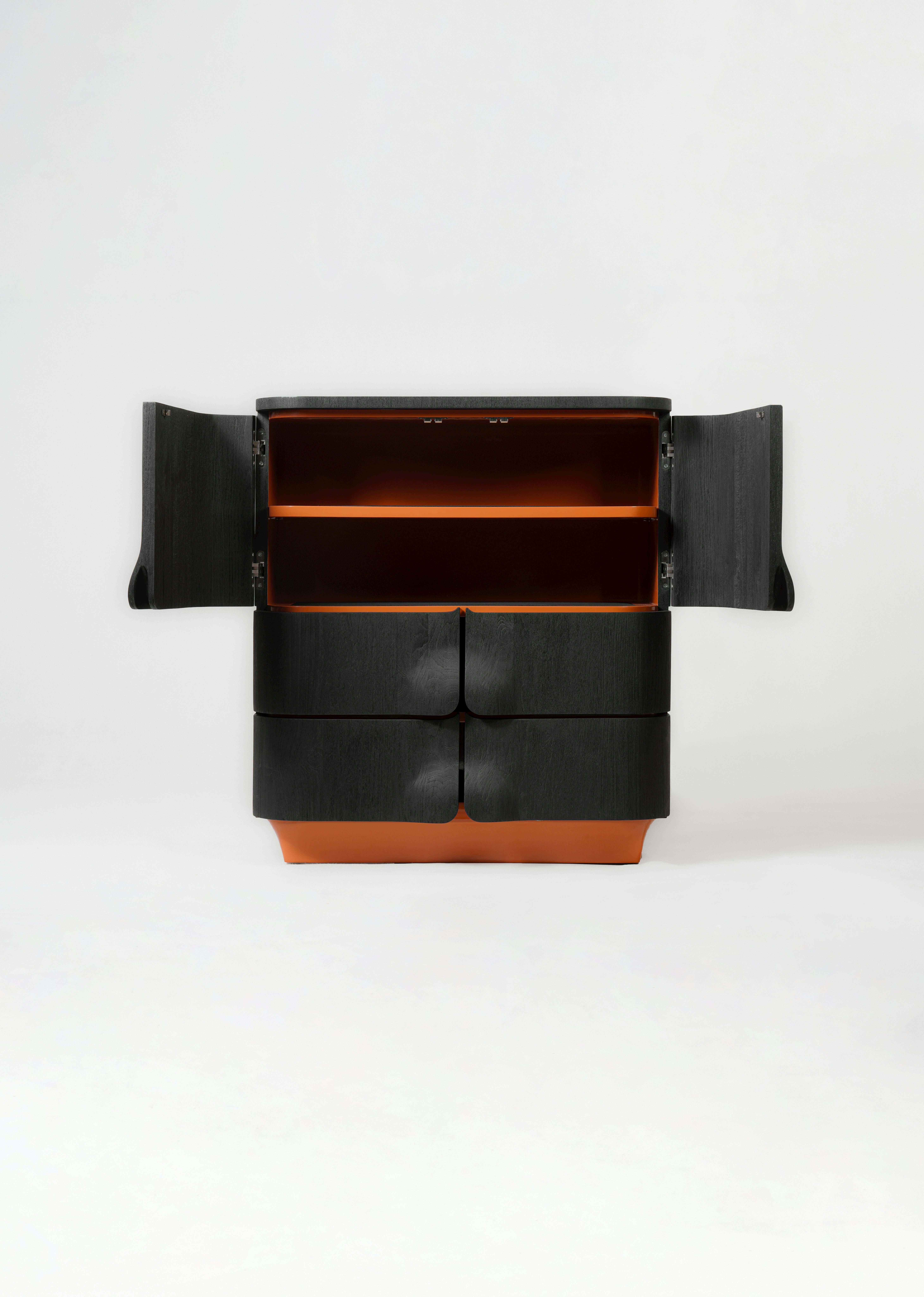Cabinet pictured in black teak with an orange lacquer leg and interior.