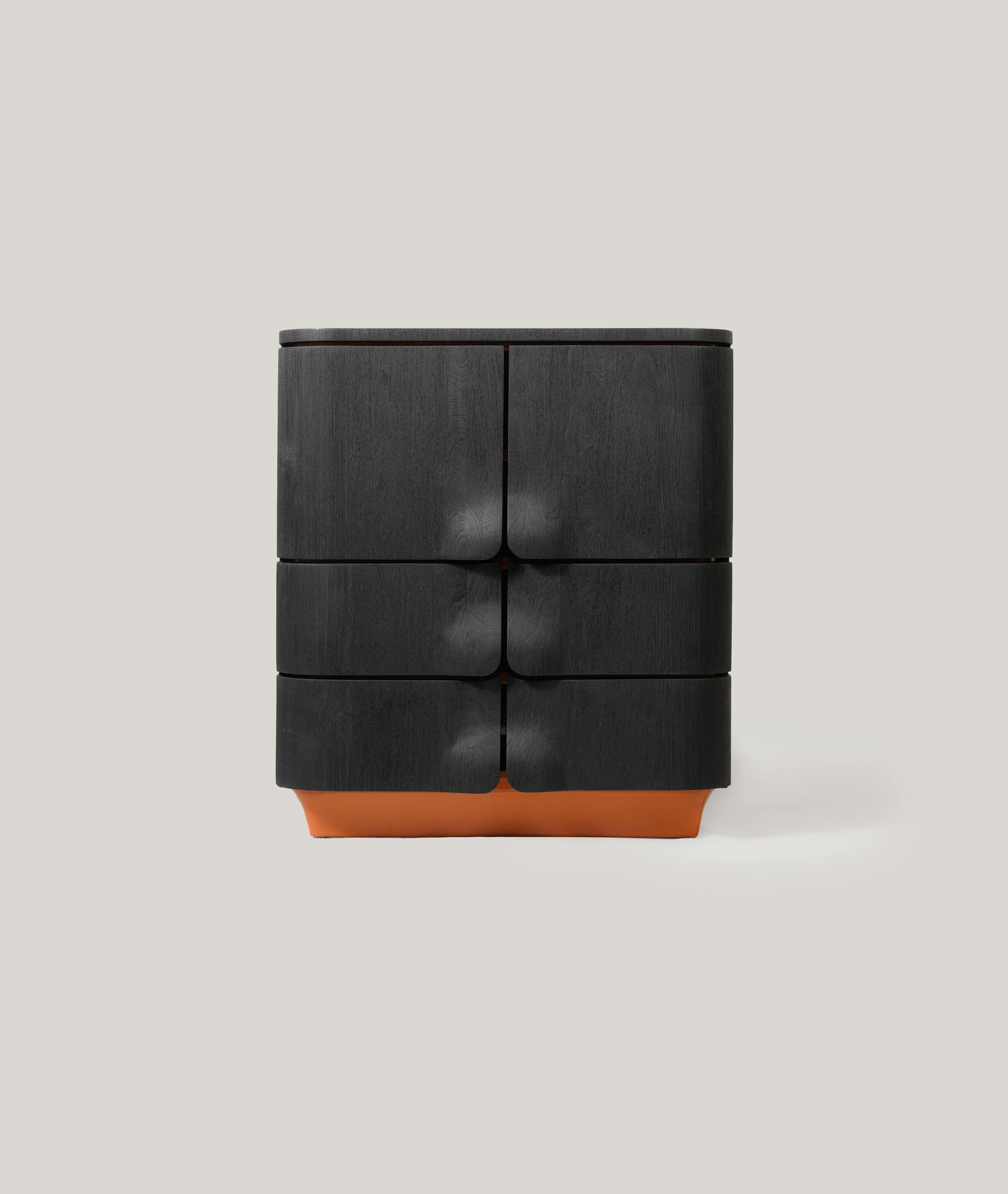 Cabinet pictured in dark brown oak with an interior in yellow lacquer.