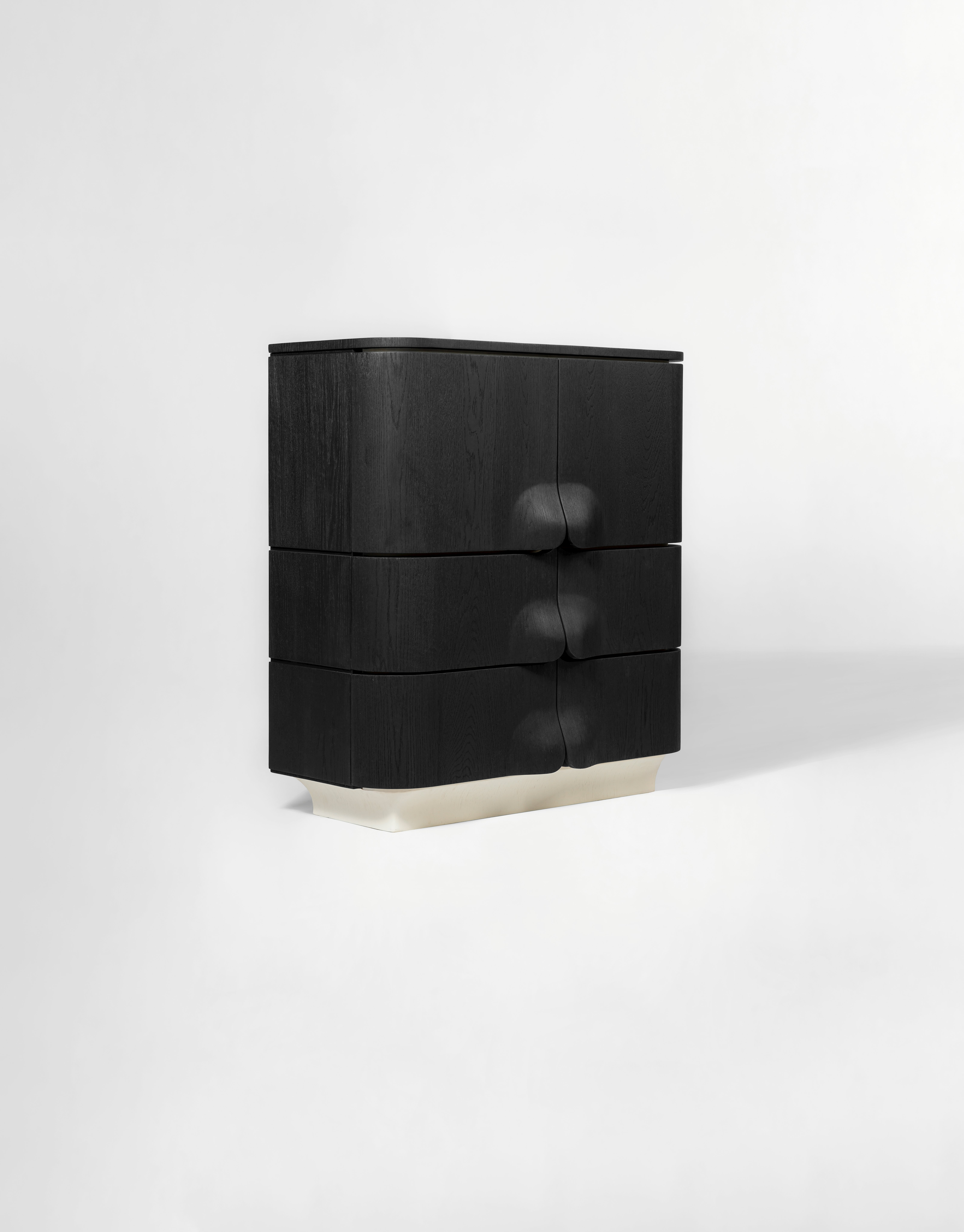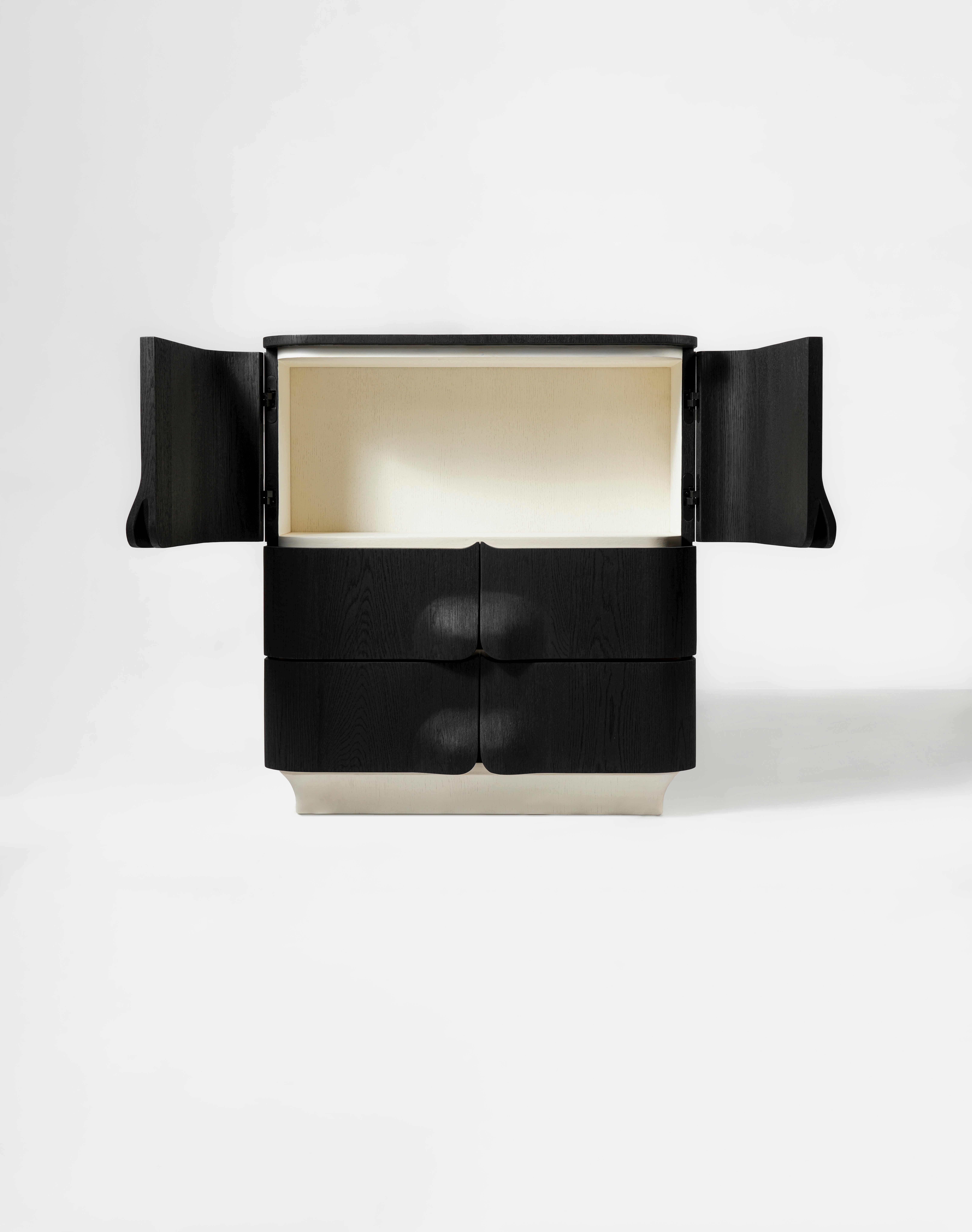 Cabinet pictured in black oak with white-washed oak leg and interior.
