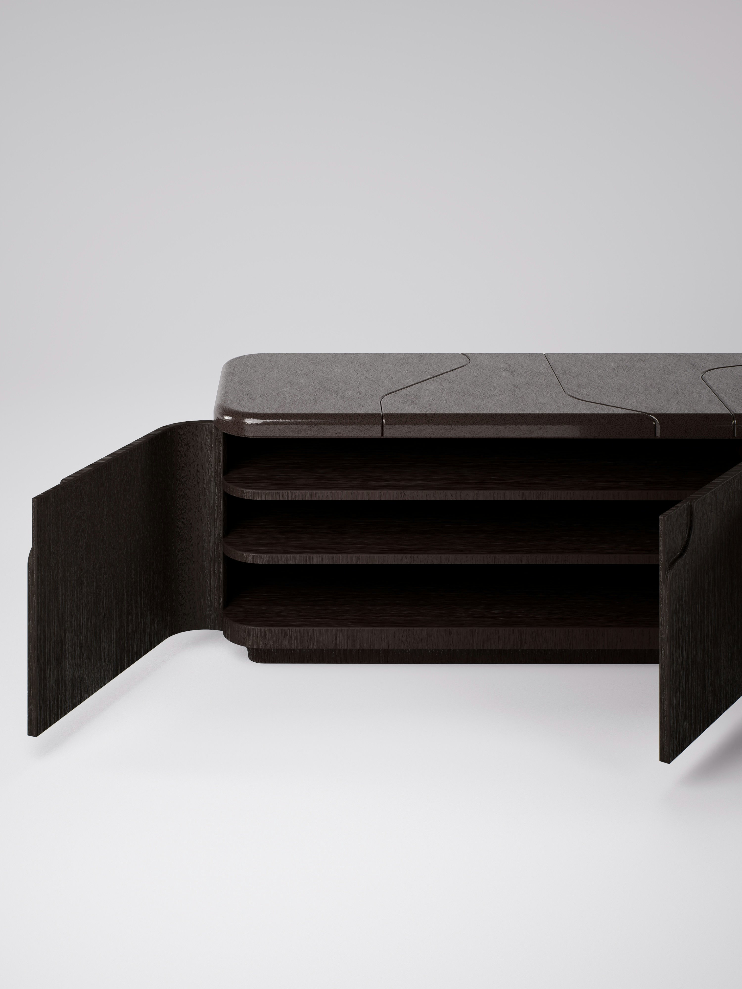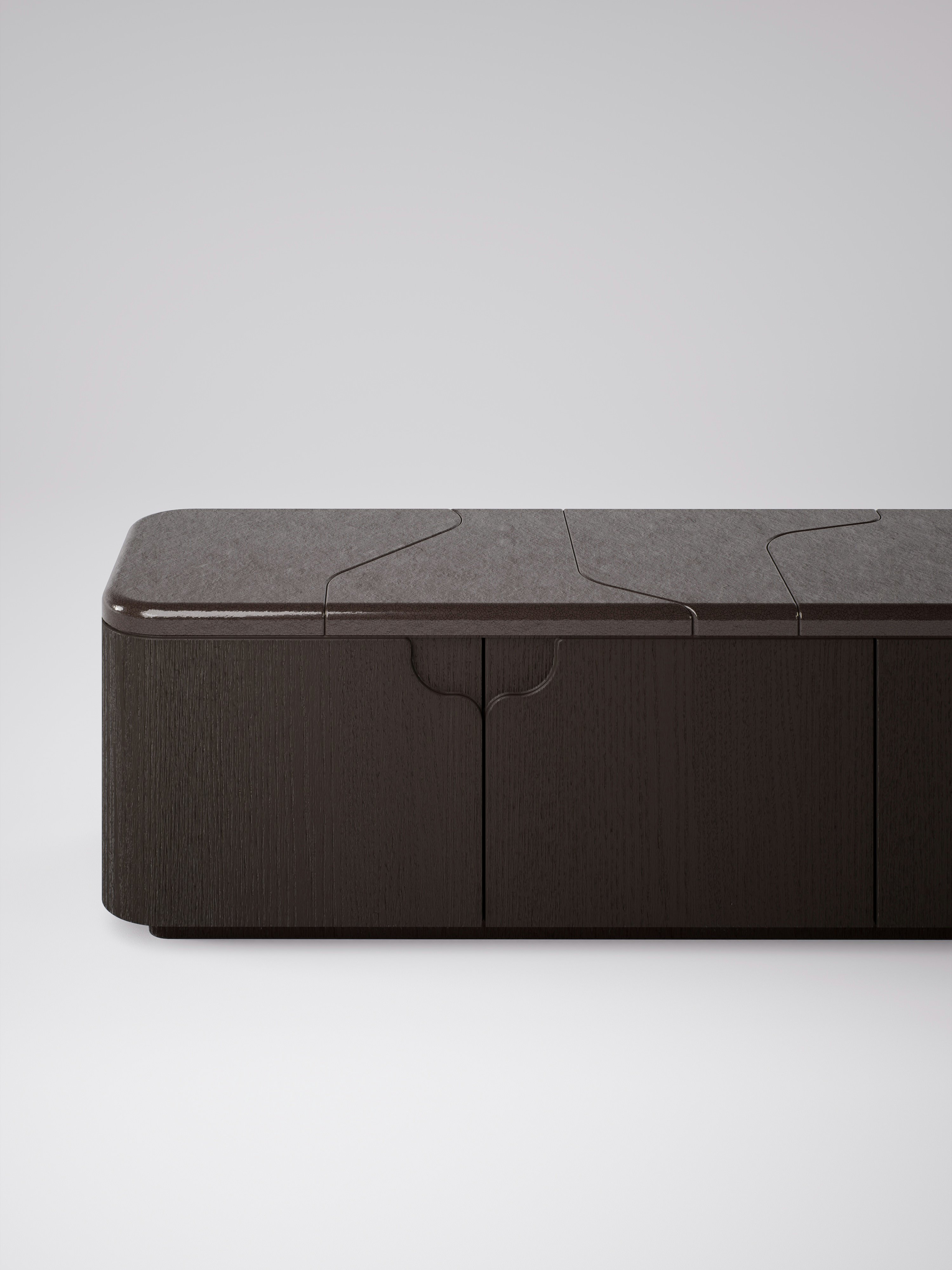 Cabinet pictured in light brown oak with a lava stone crème brulée tabletop.