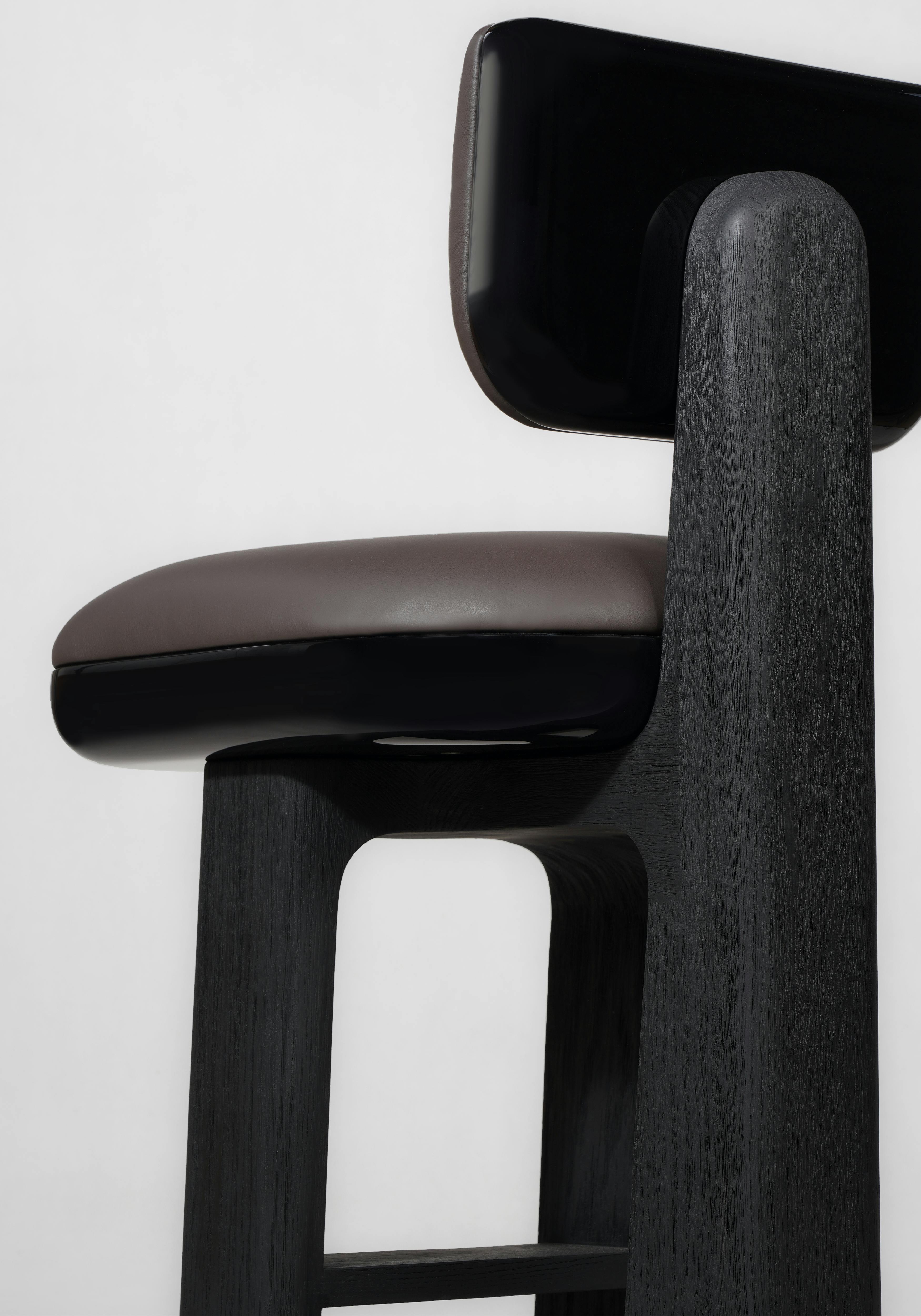 Bar chair pictured in black oak with black lacquer edging under the seat and behind the back, upholstered with COM fabric.