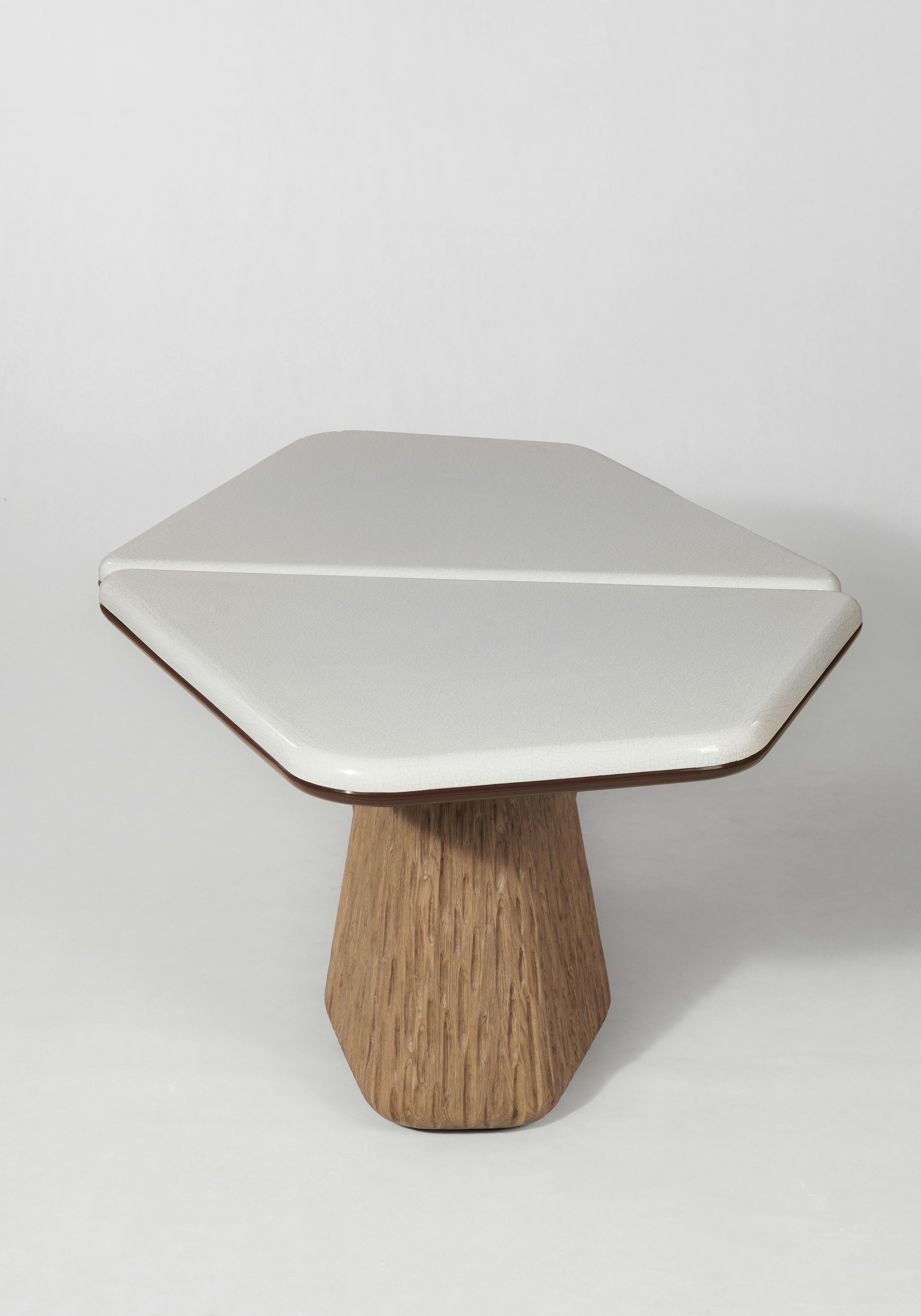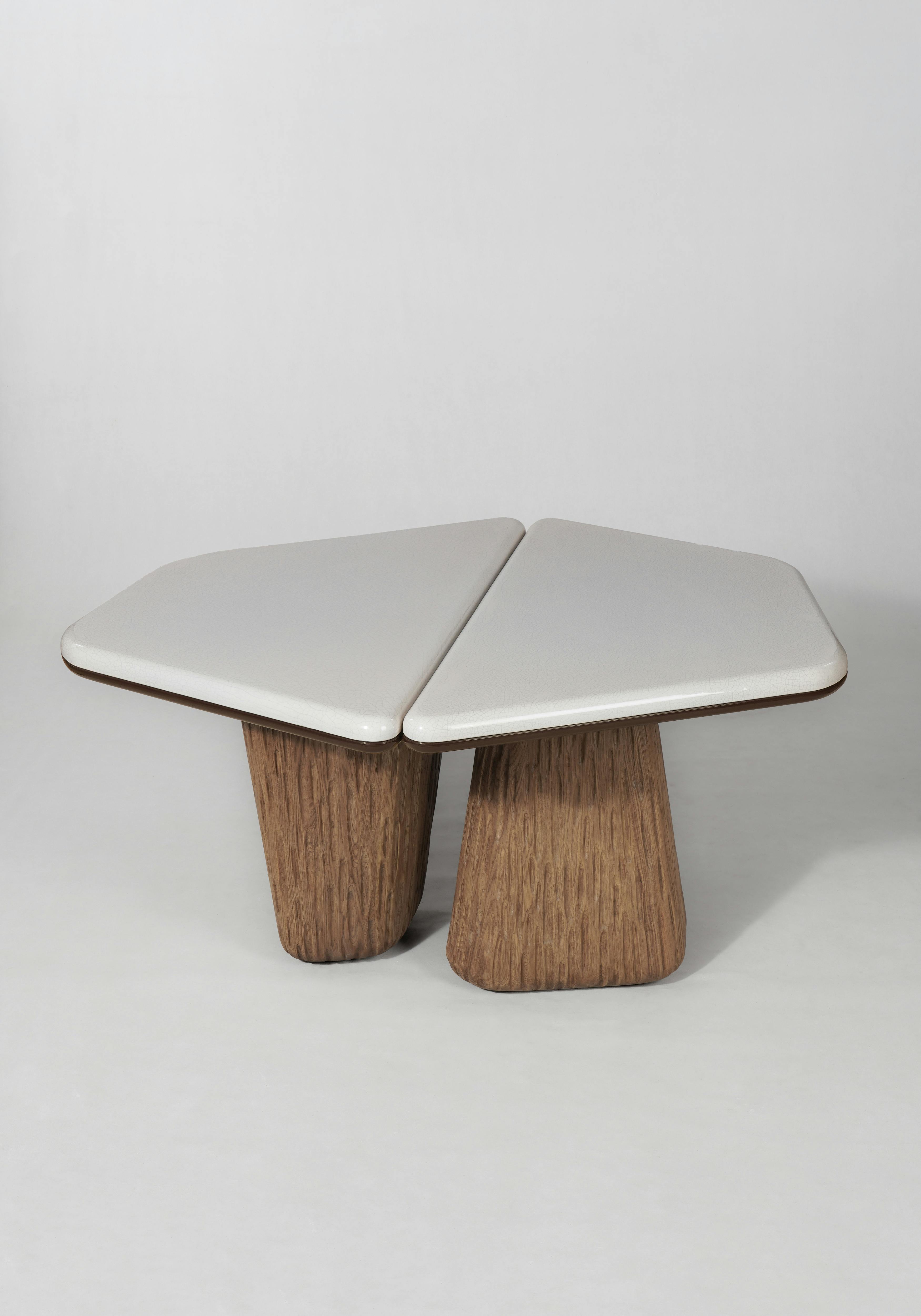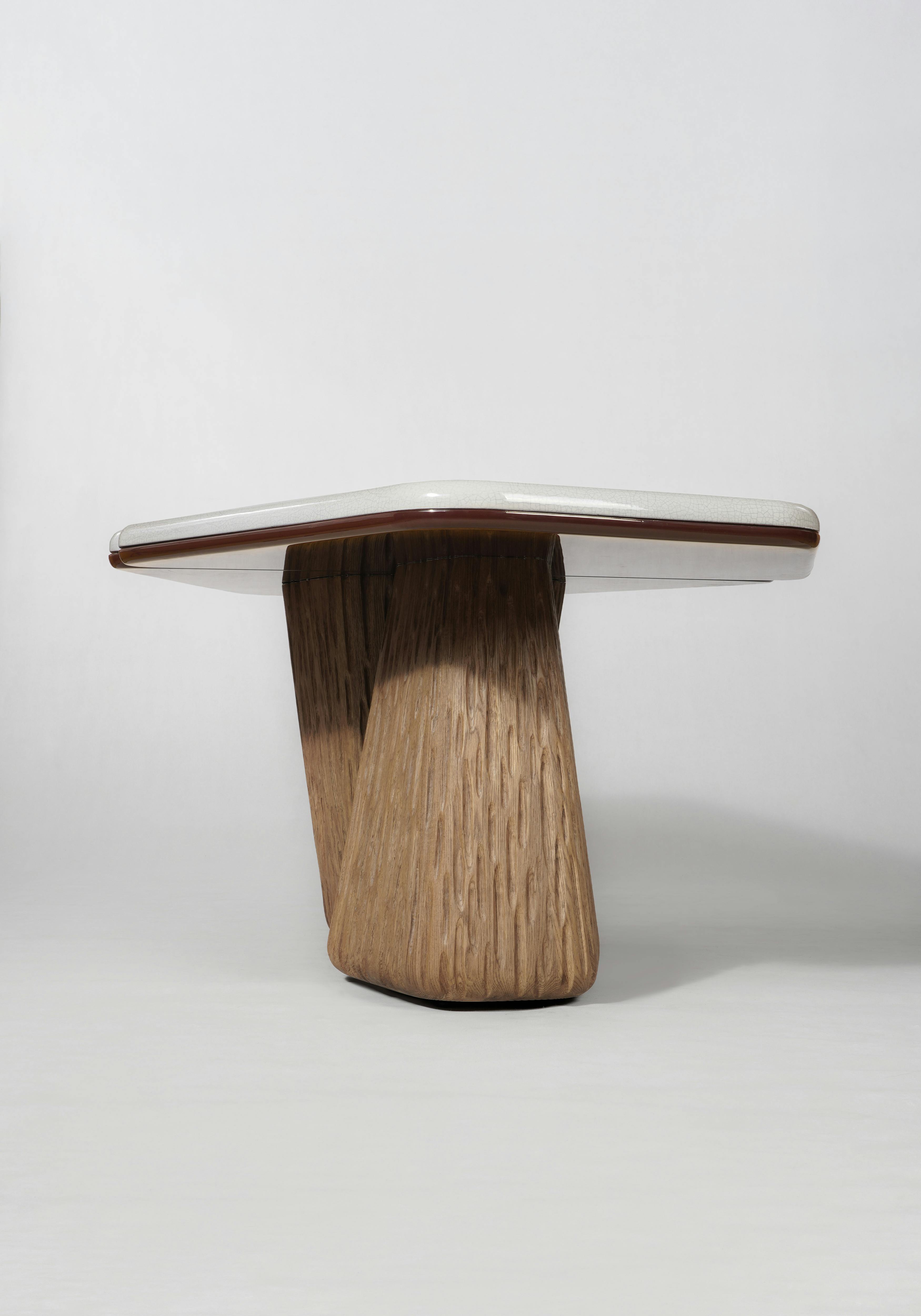 Coffee table pictured in natural oak with an oxide red lacquer edging and tabletop in lava stone Full Glazed Crackle.