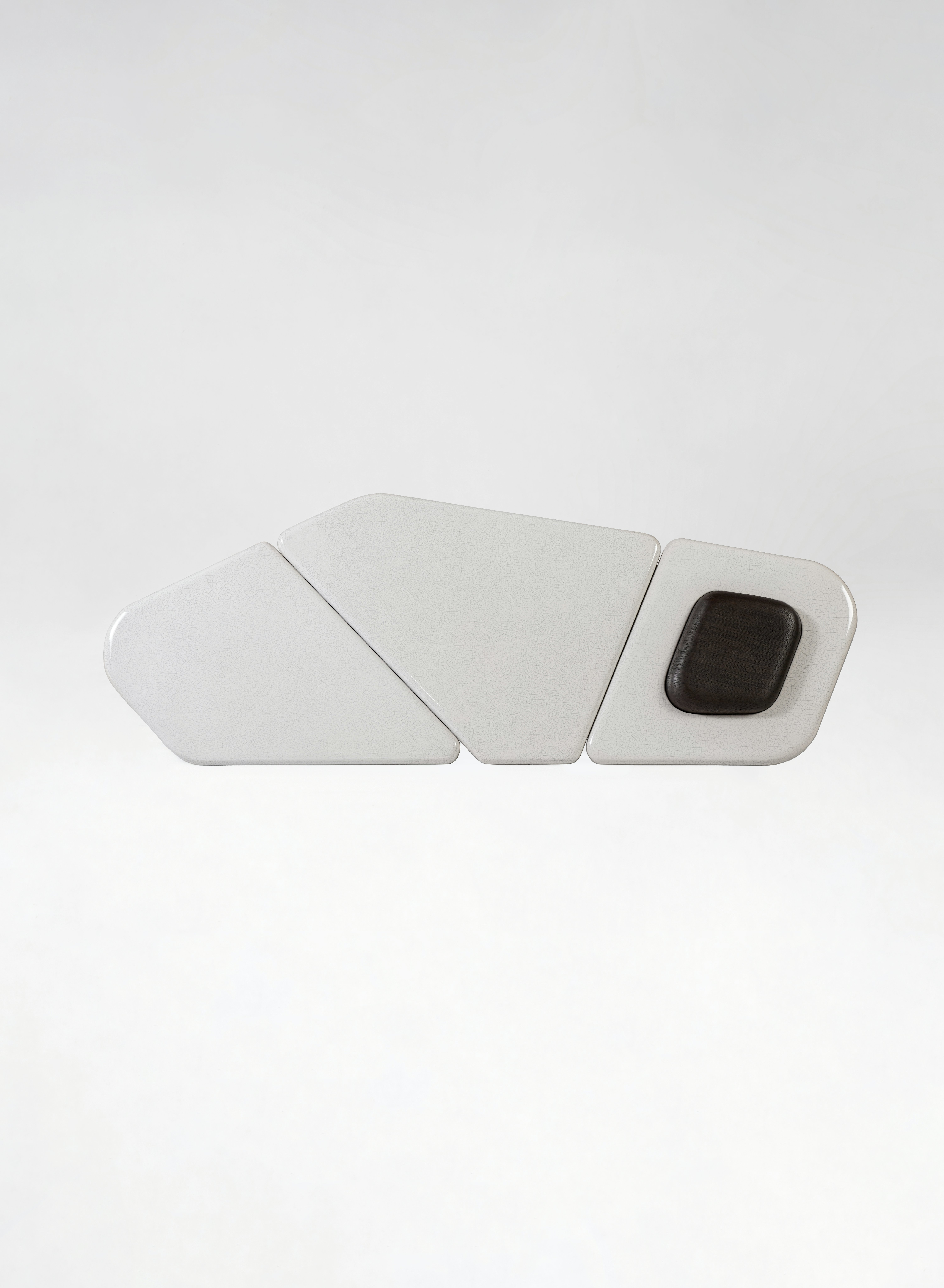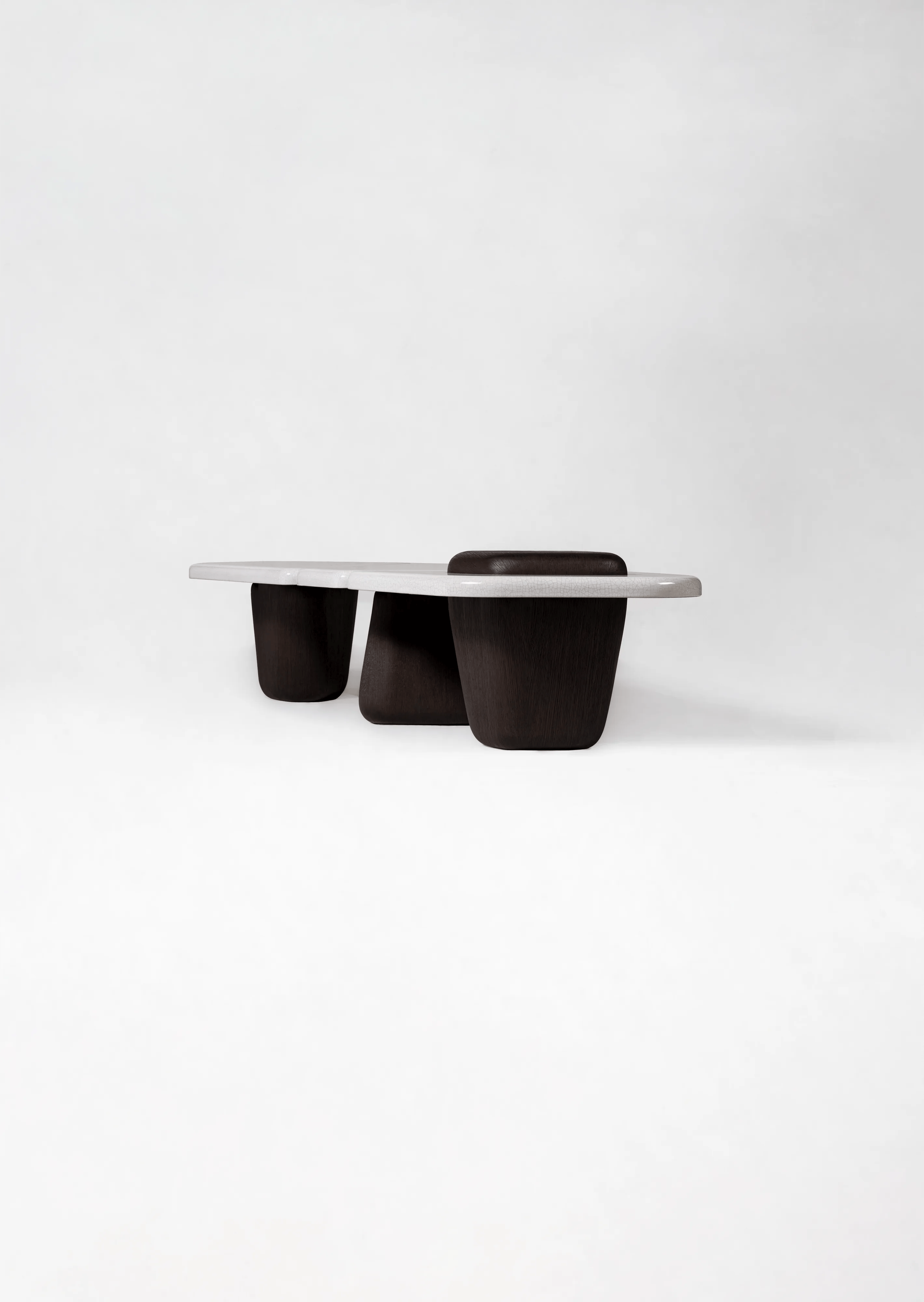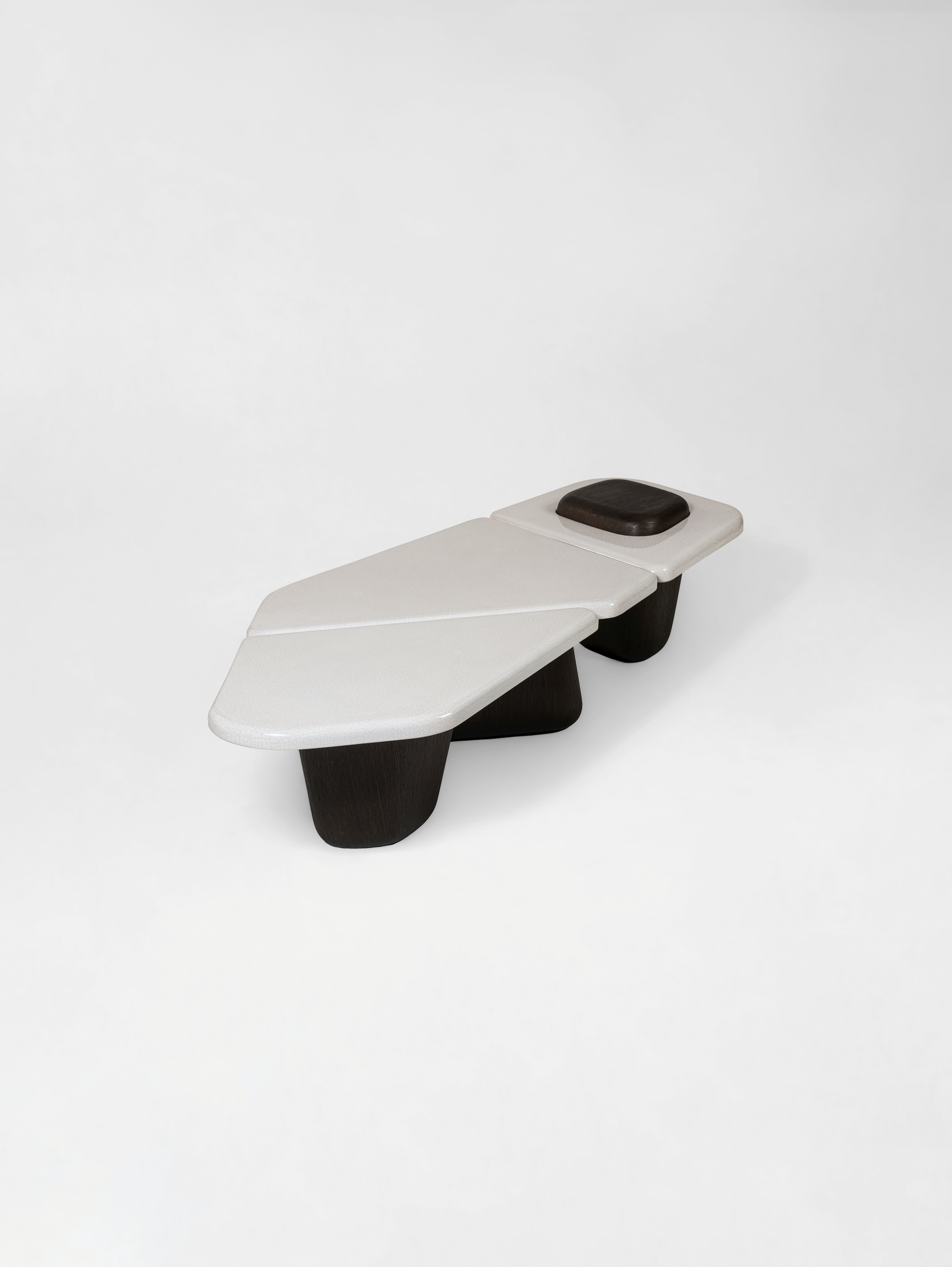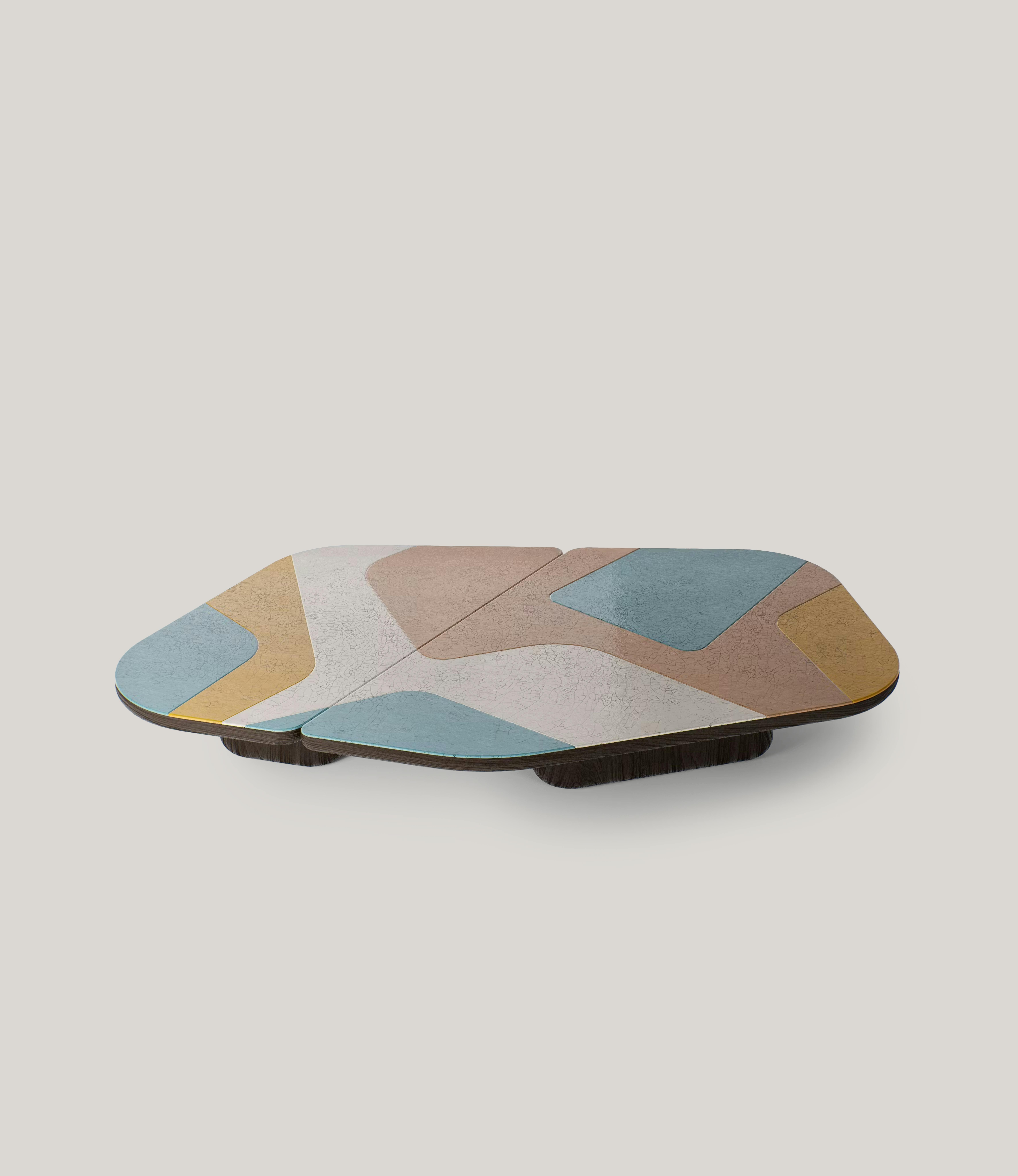 Coffee table pictured in light brown oak with a full glazed crackled lava stone tabletop.