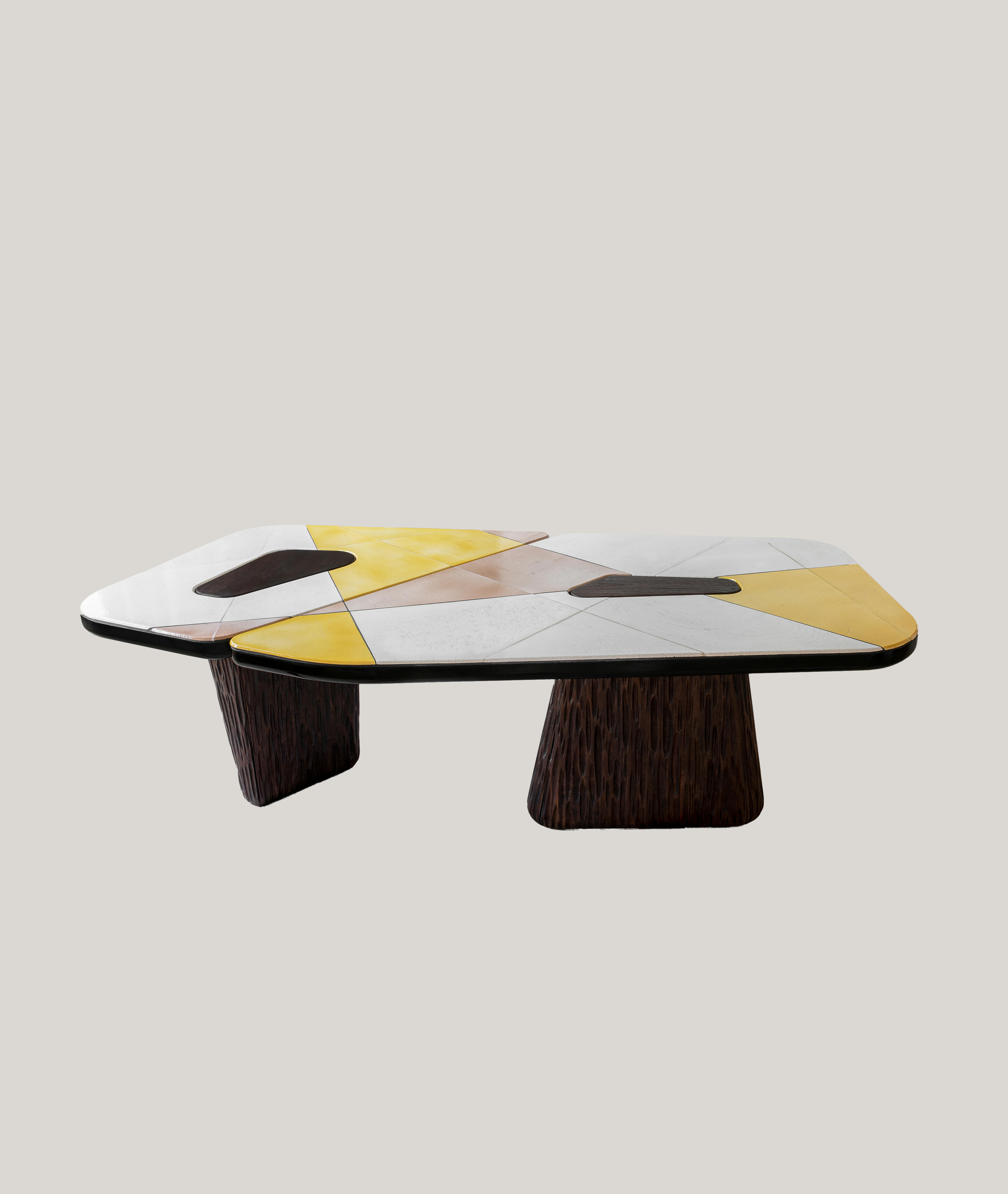 Dining table pictured in hand-carved light brown oak with a tabletop in blanc écru, vieux rose and ochre raku.