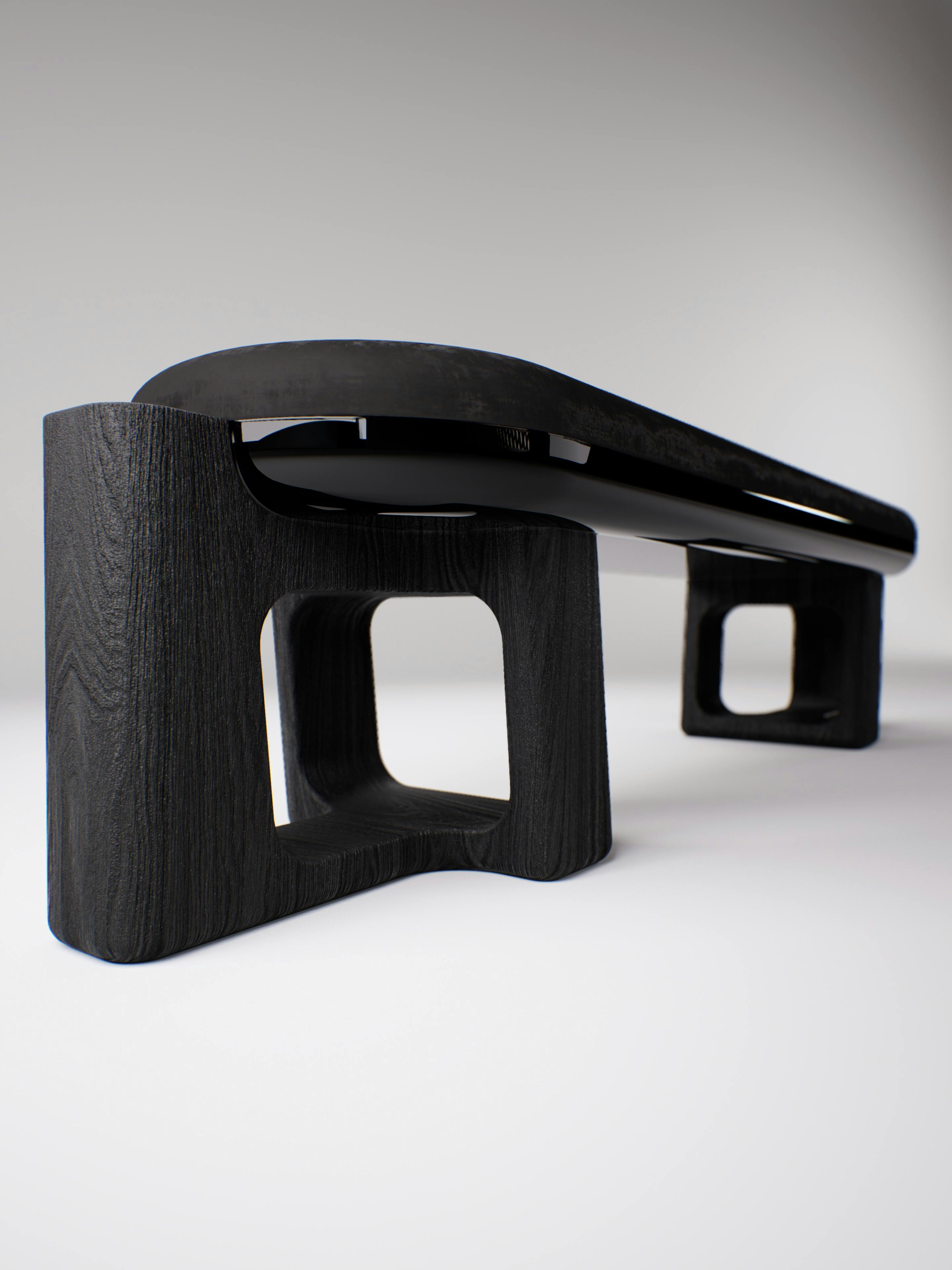 Bench pictured in black oak with an edging in black lacquer. The seat is upholstered with black velvet.