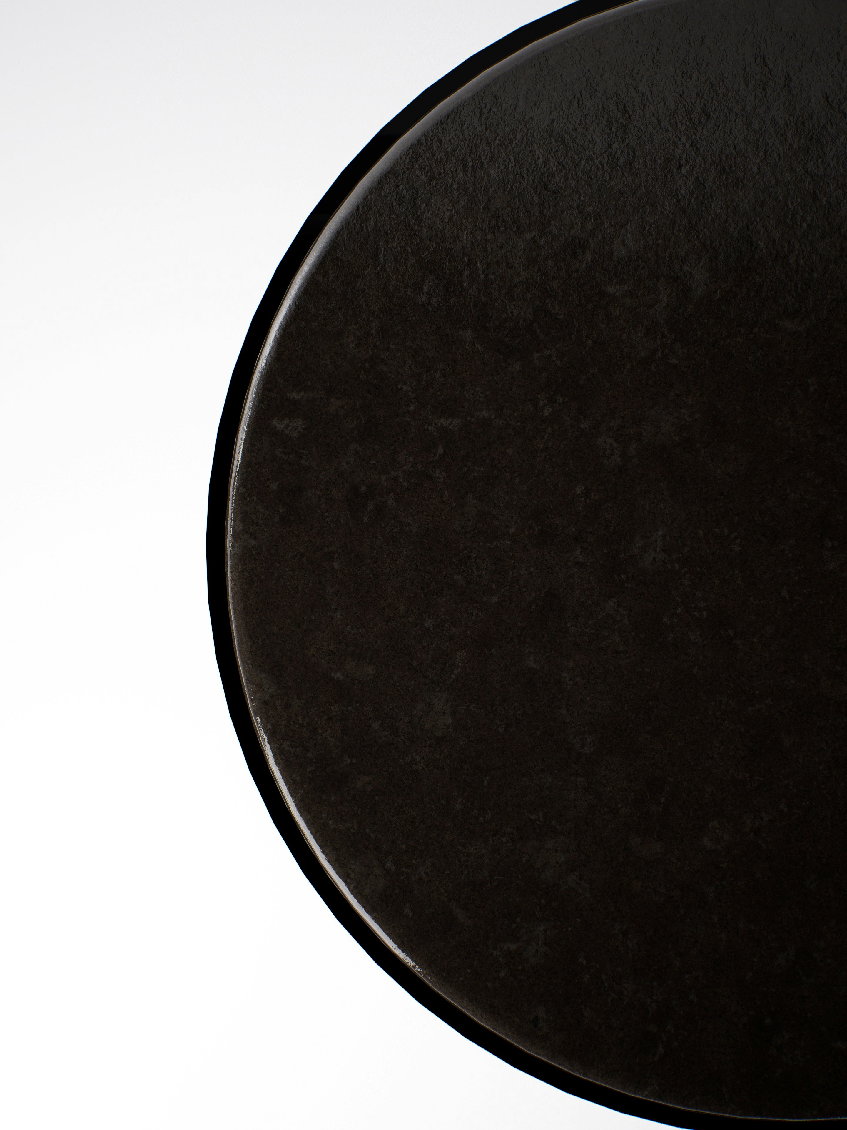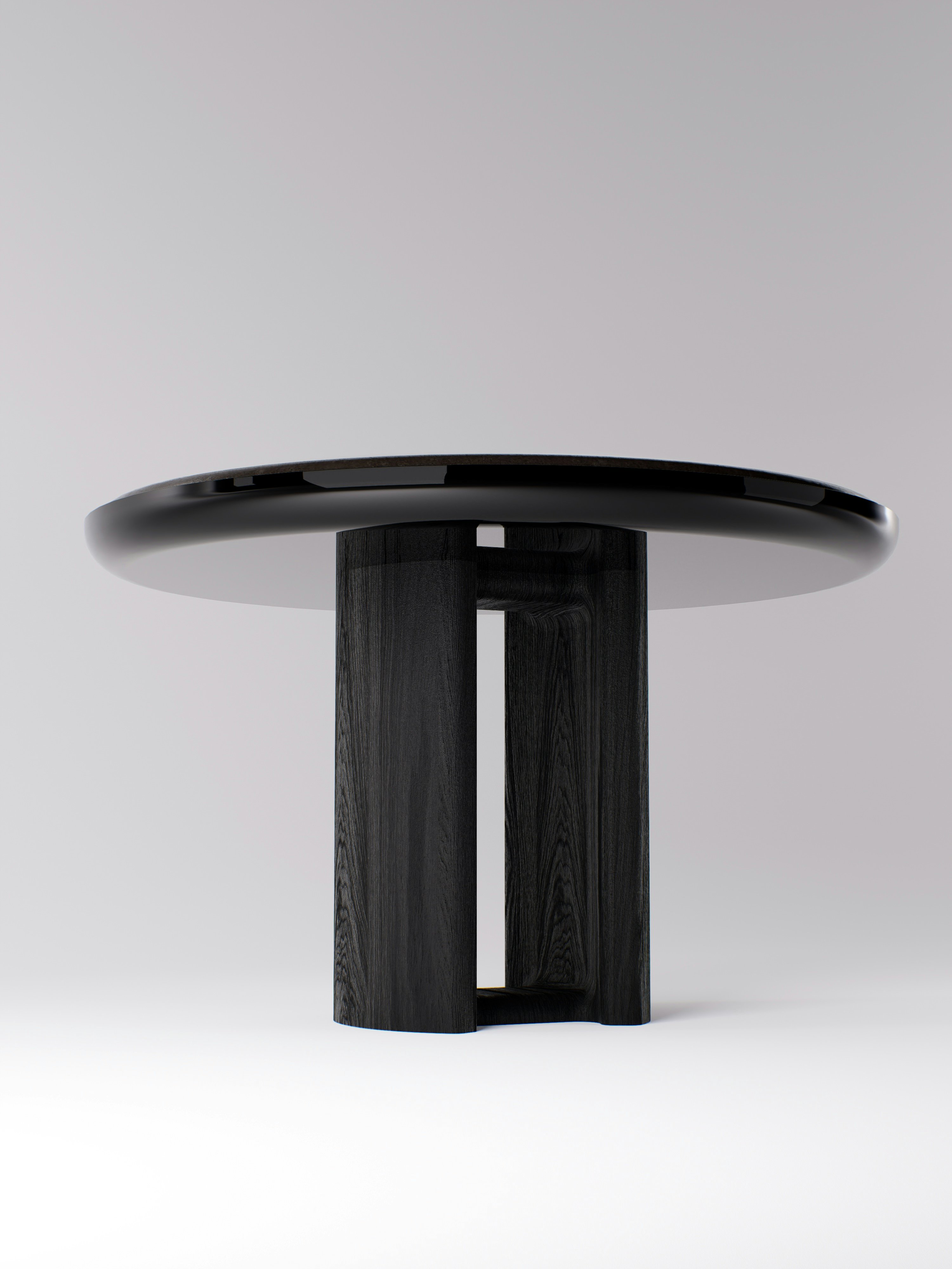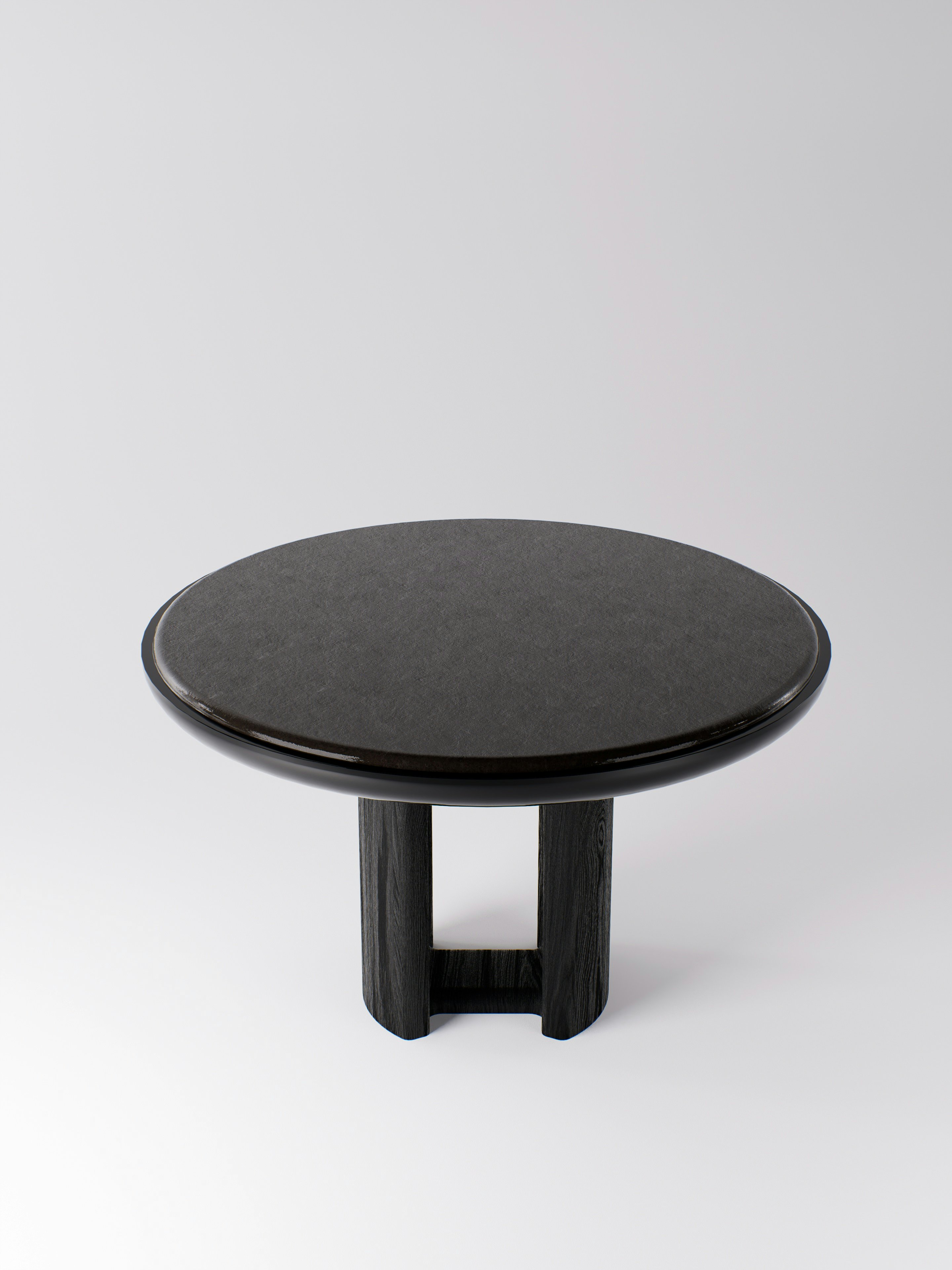 Circular dining table pictured in black oak with a black lacquer edging and a black crème brûlée lava stone tabletop.
