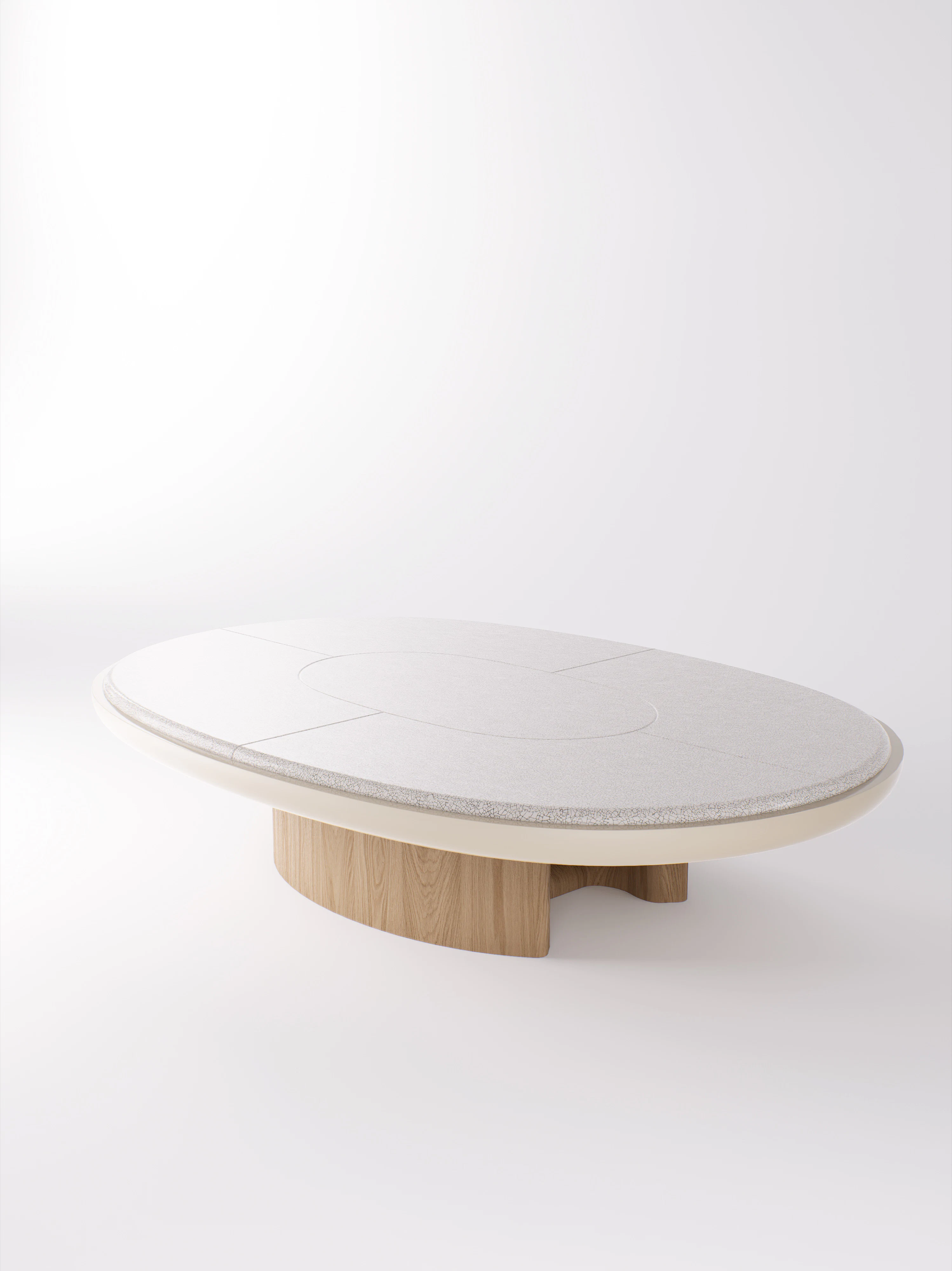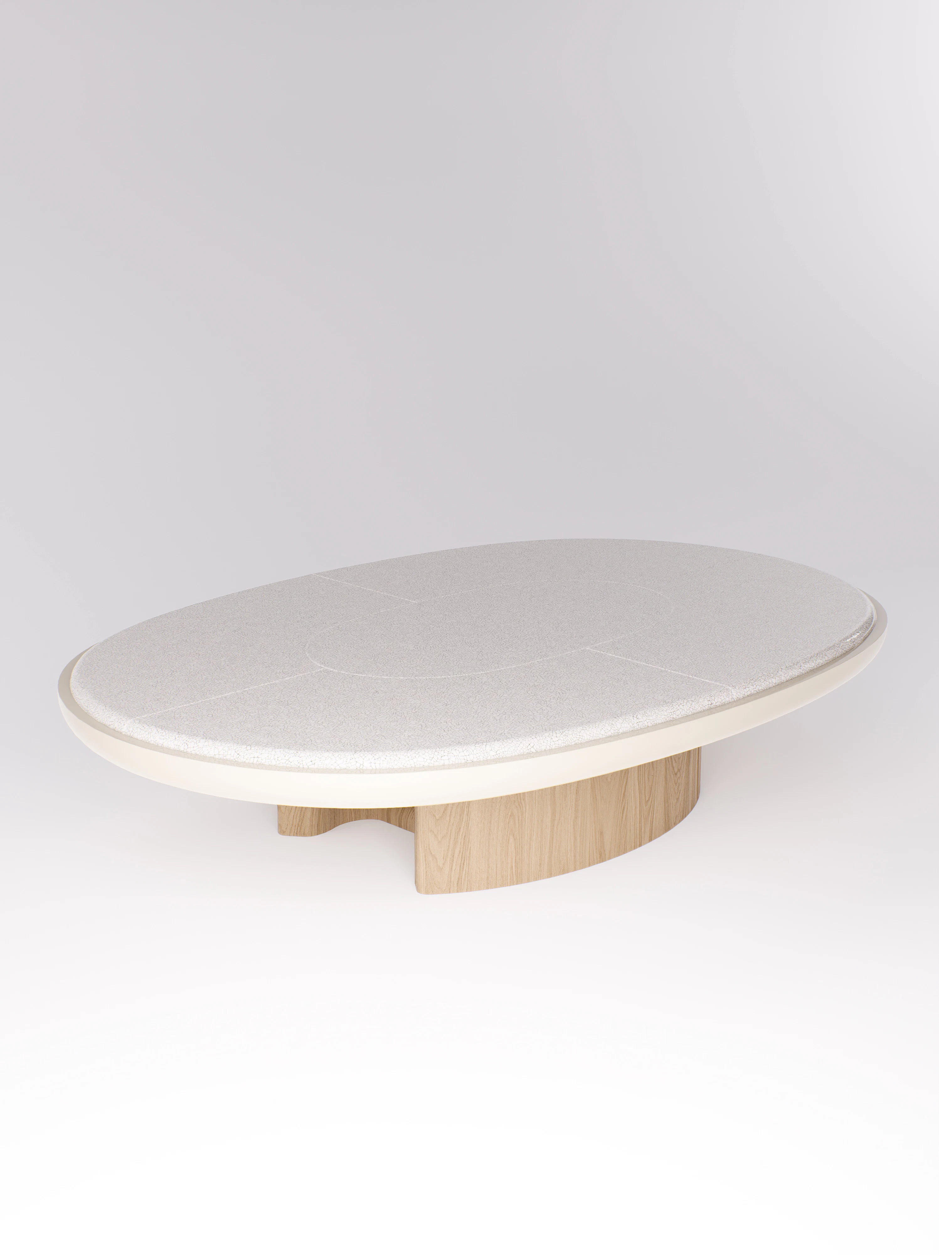 Coffee table pictured in natural oak with a white lacquer edging and a raku blanc écru tabletop.