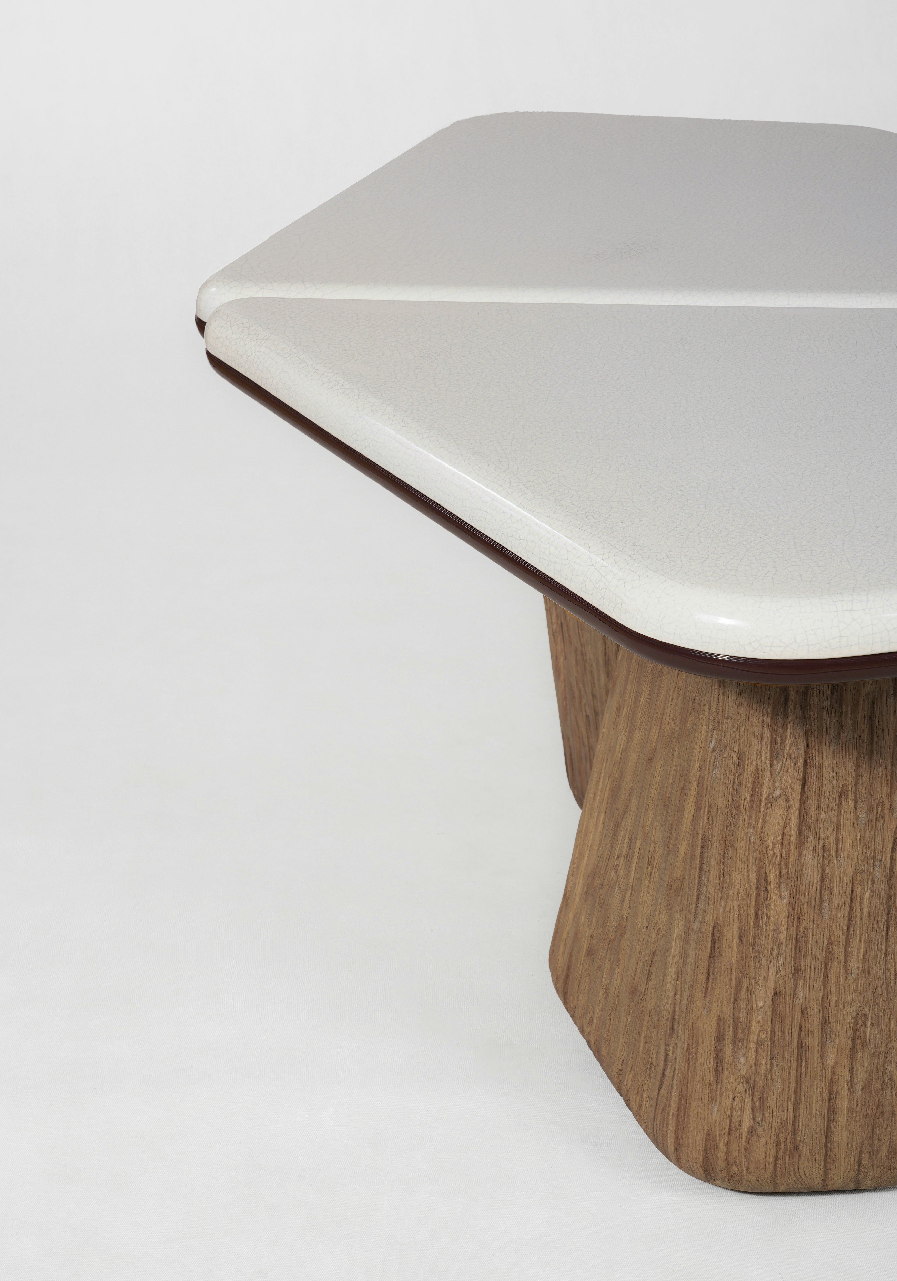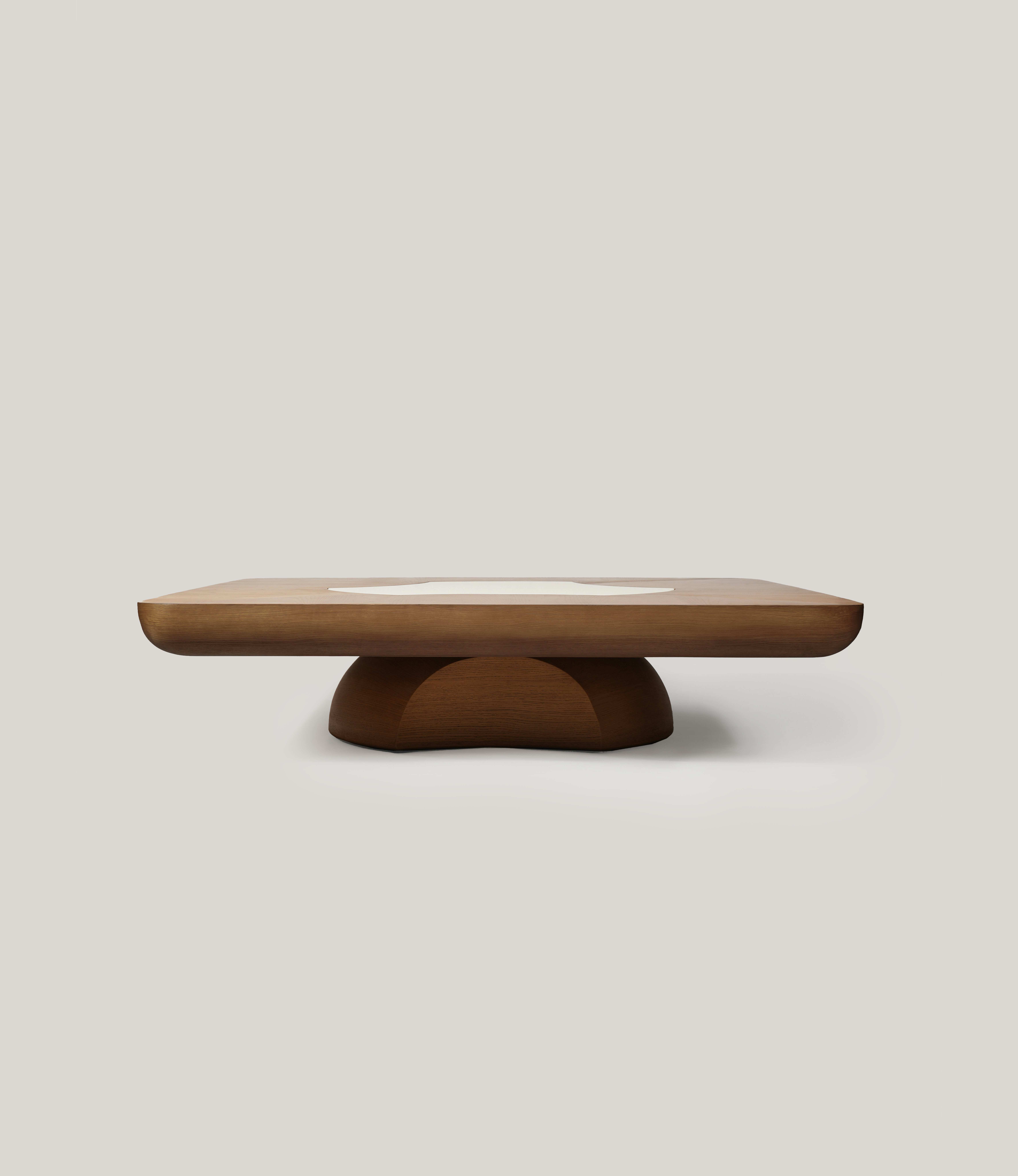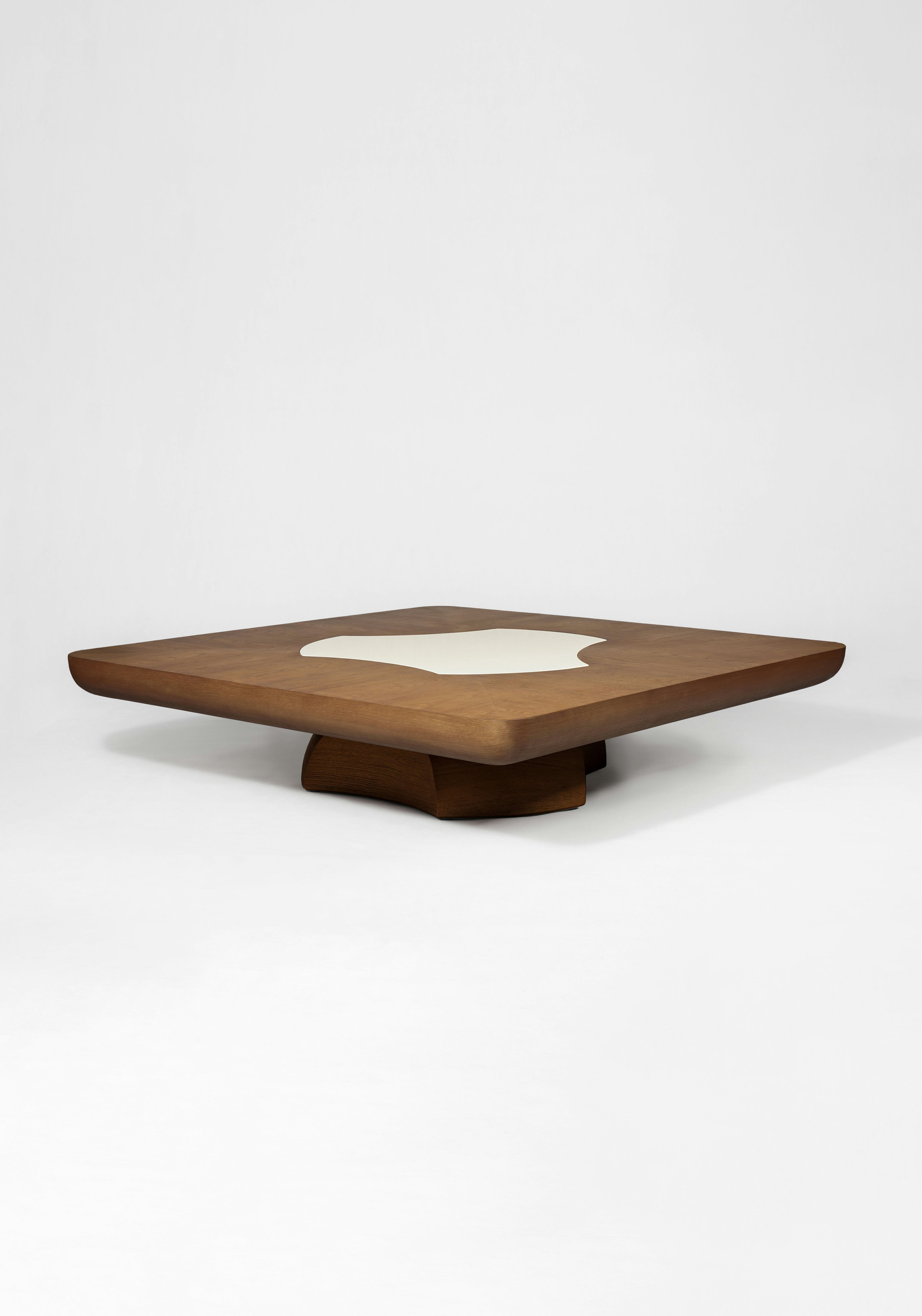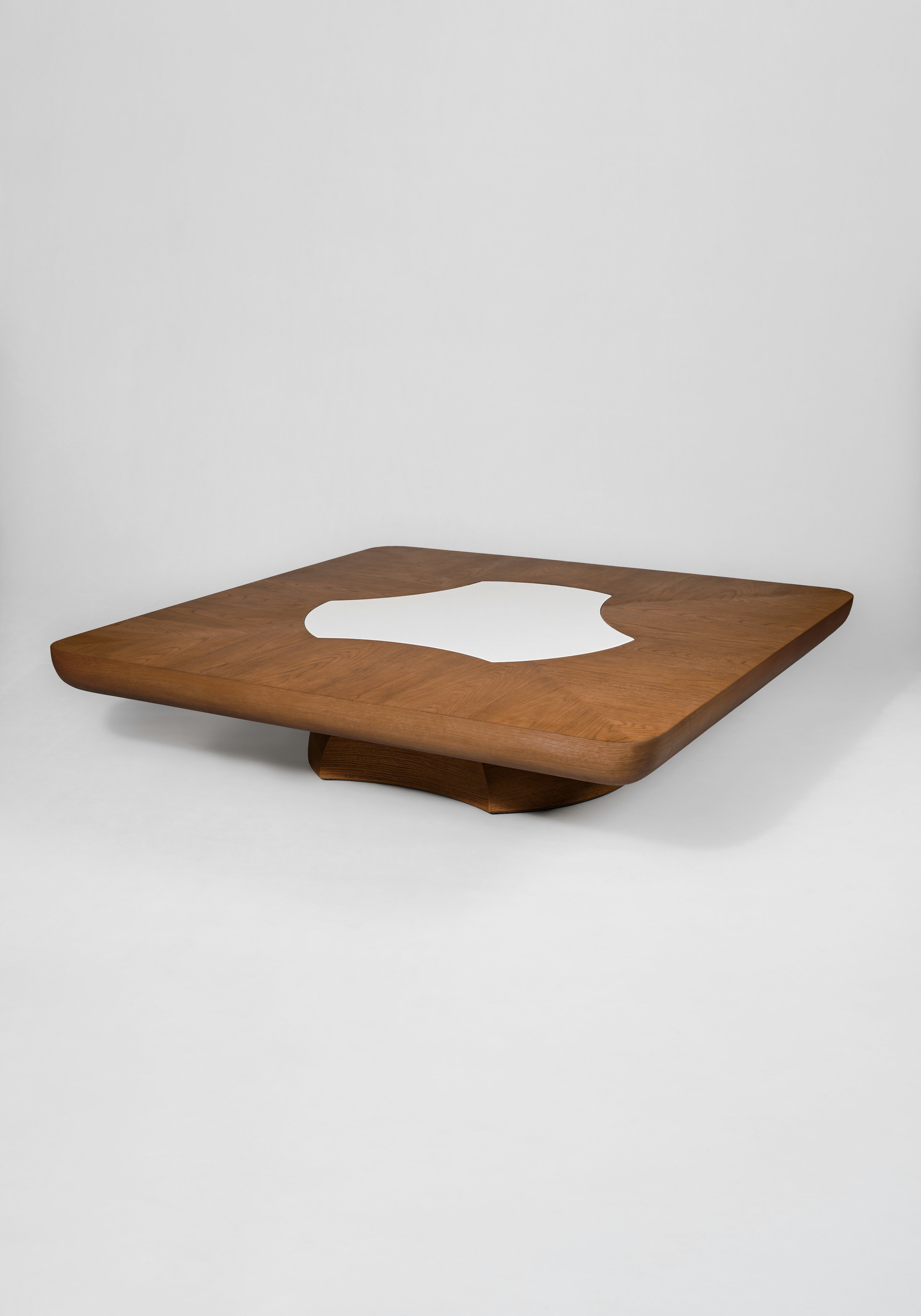 Coffee table pictured in natural oak with an inlay of white lacquer at the center of the tabletop.