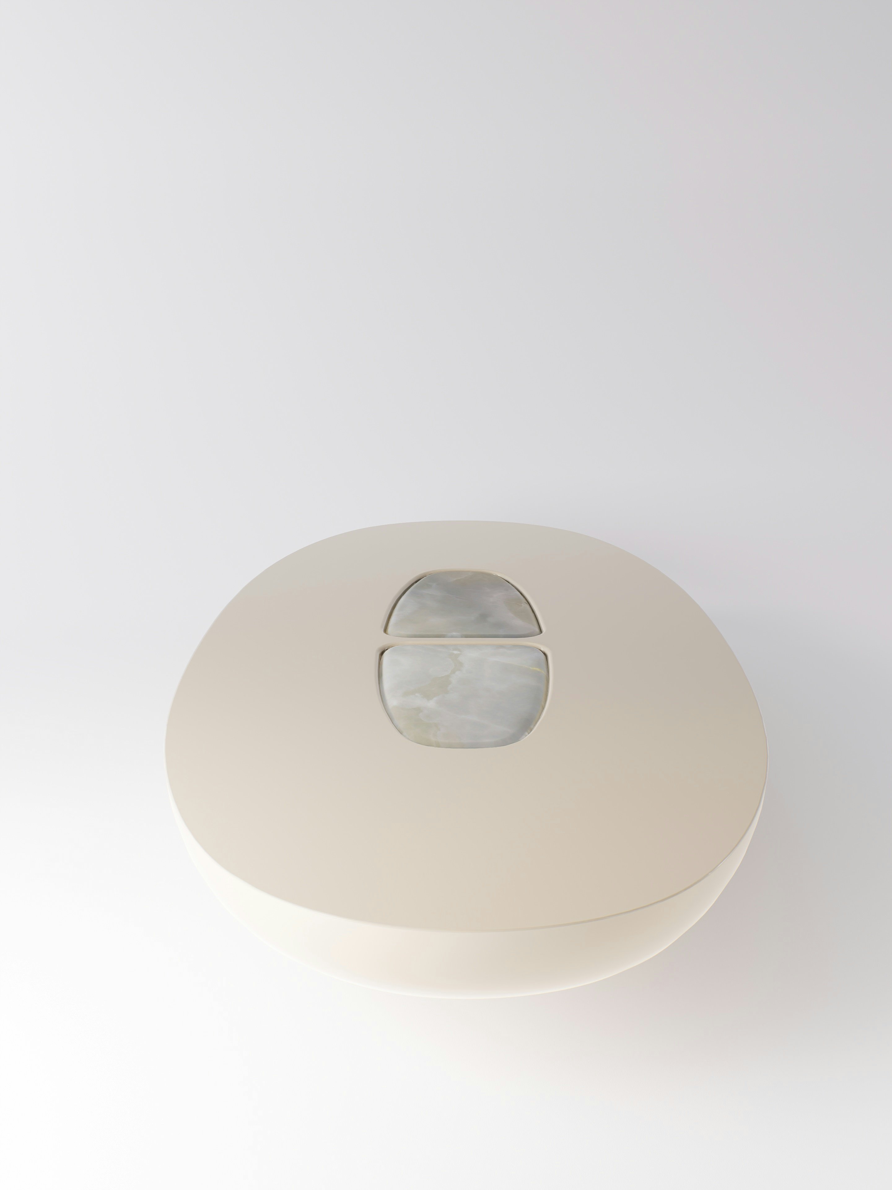 Coffee table pictured in white oak with a tabletop in white lacquer and inlays of marble.