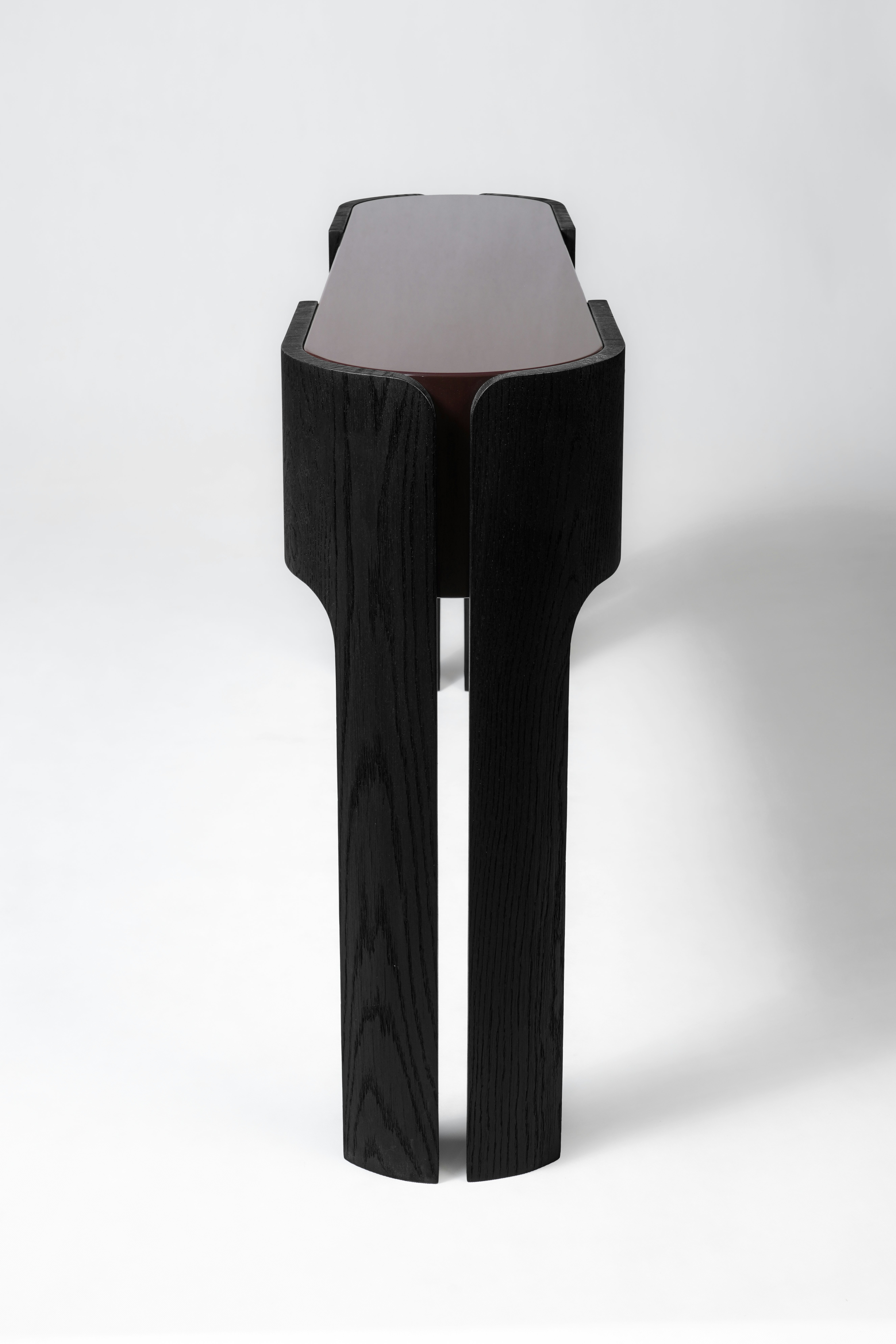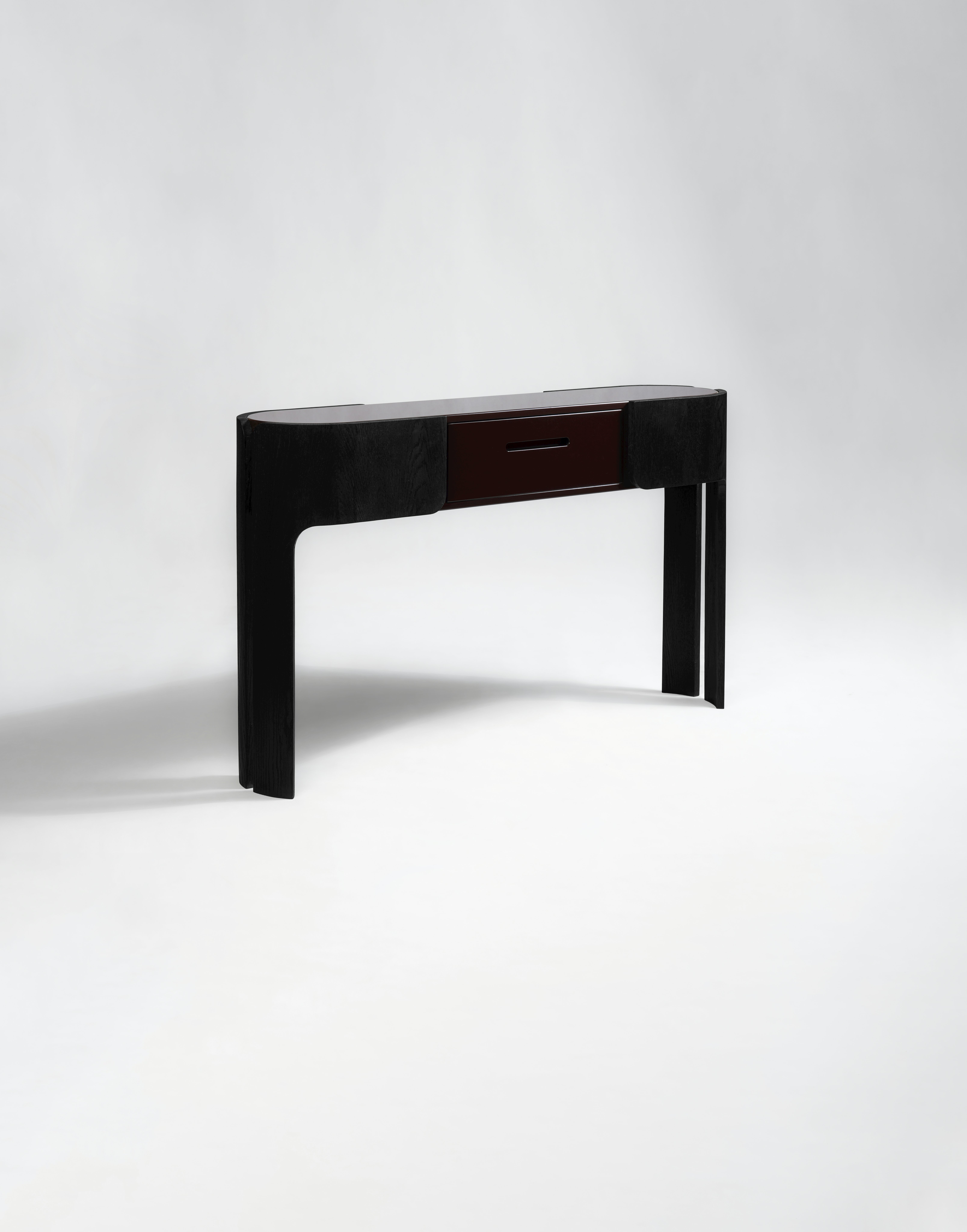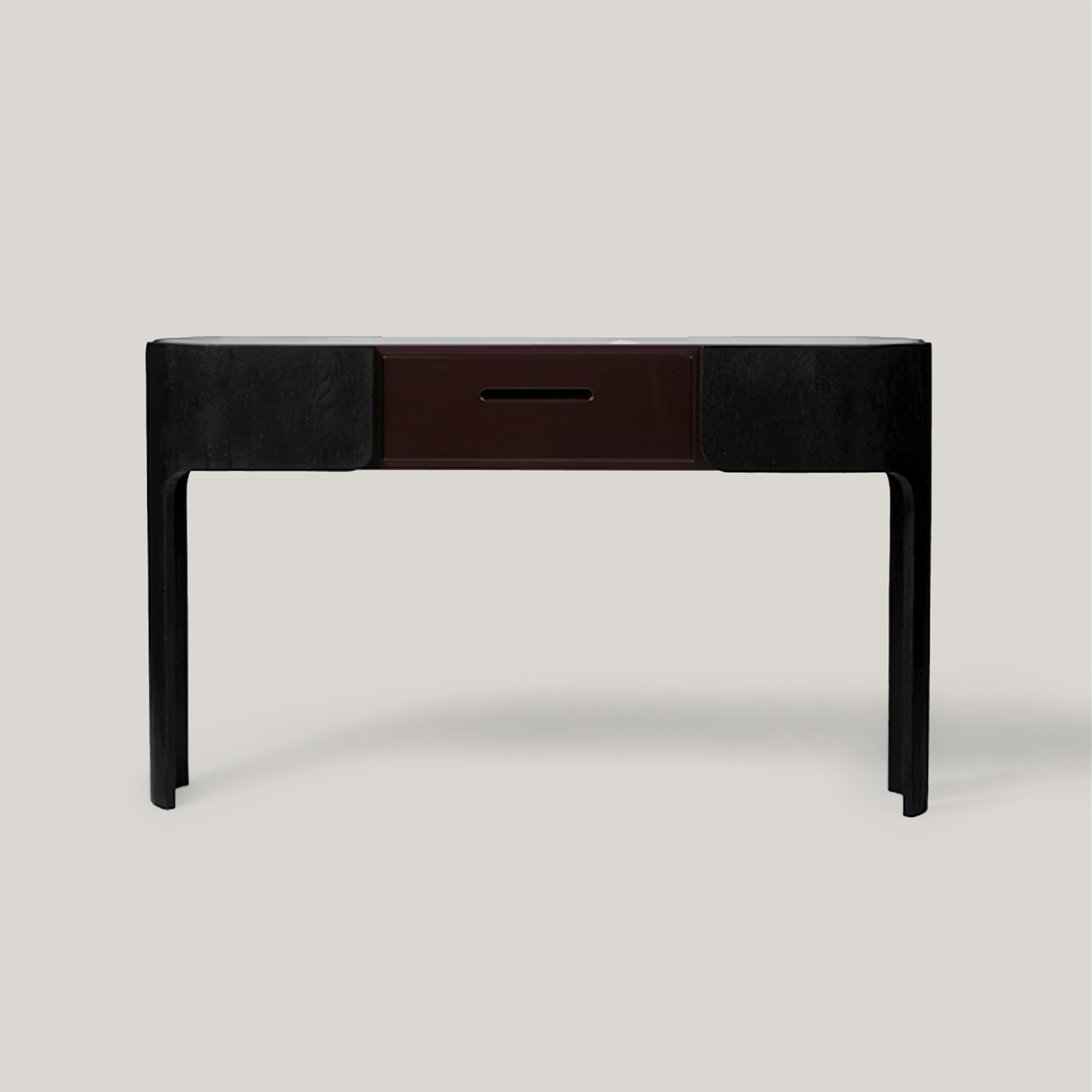 Console pictured in black oak with an oxide red lacquer drawer and tabletop.