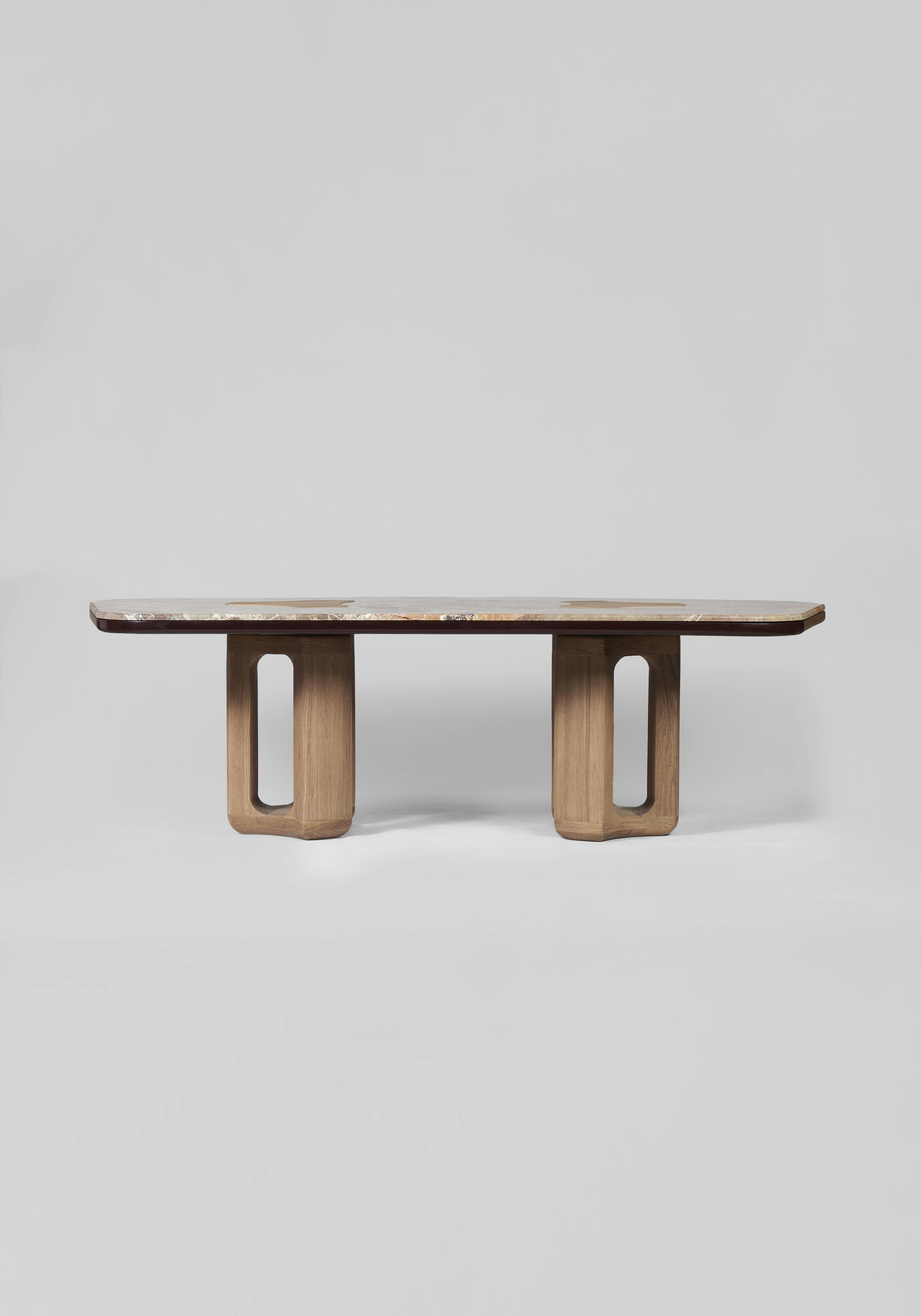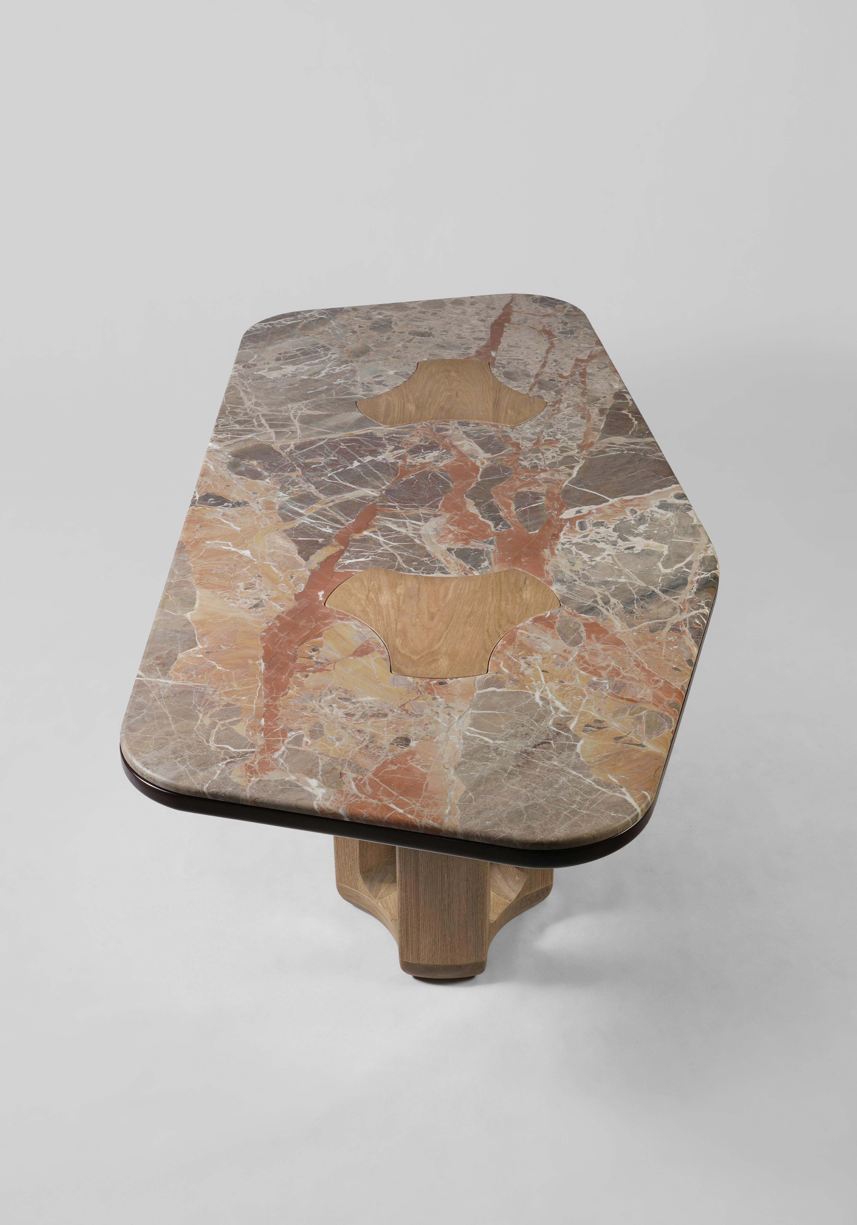 Curved dining table pictured in natural oak with an oxide red lacquer edging and a Laguetta marble tabletop.