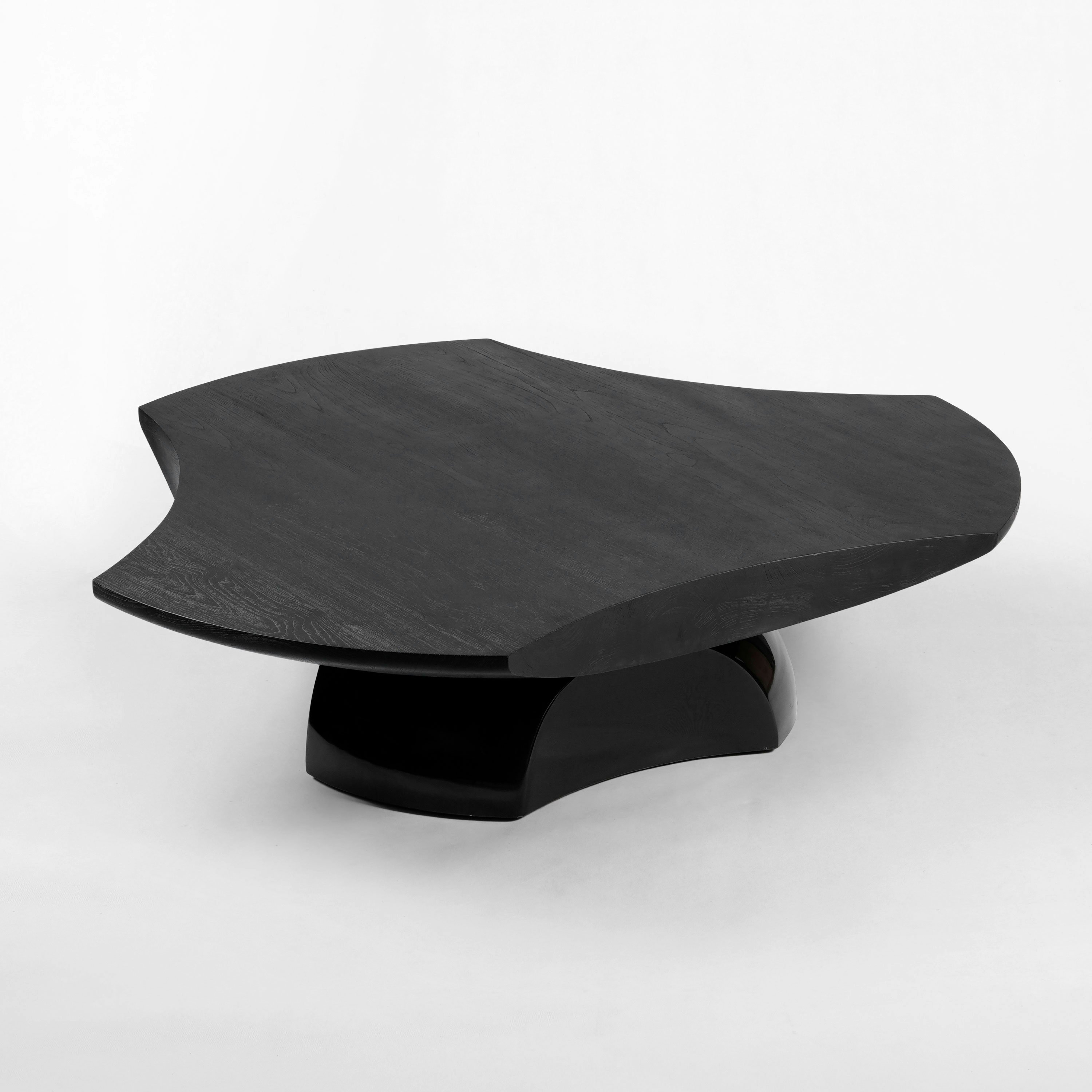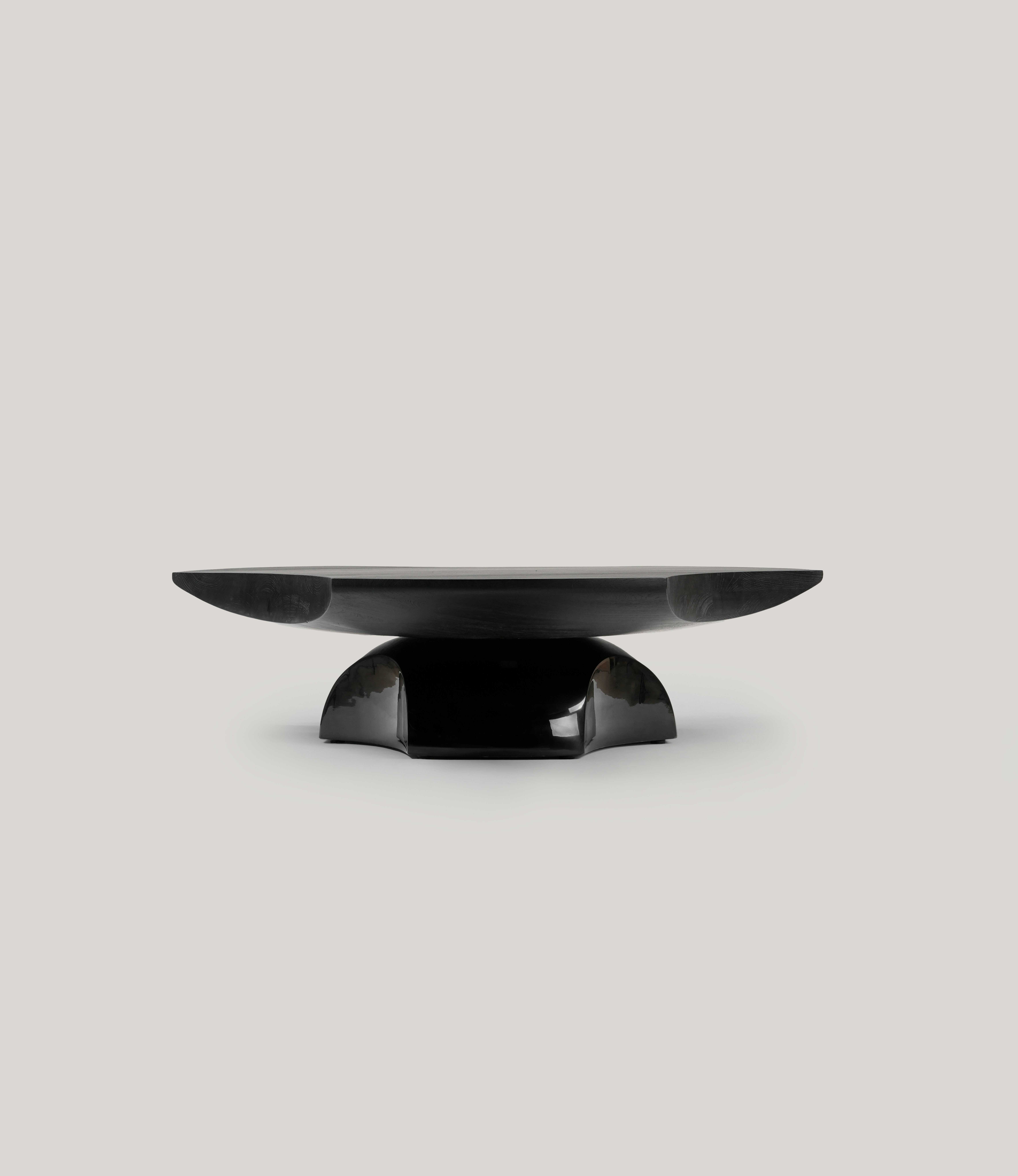Coffee table pictured with a black lacquer leg and a tabletop in black teak.
