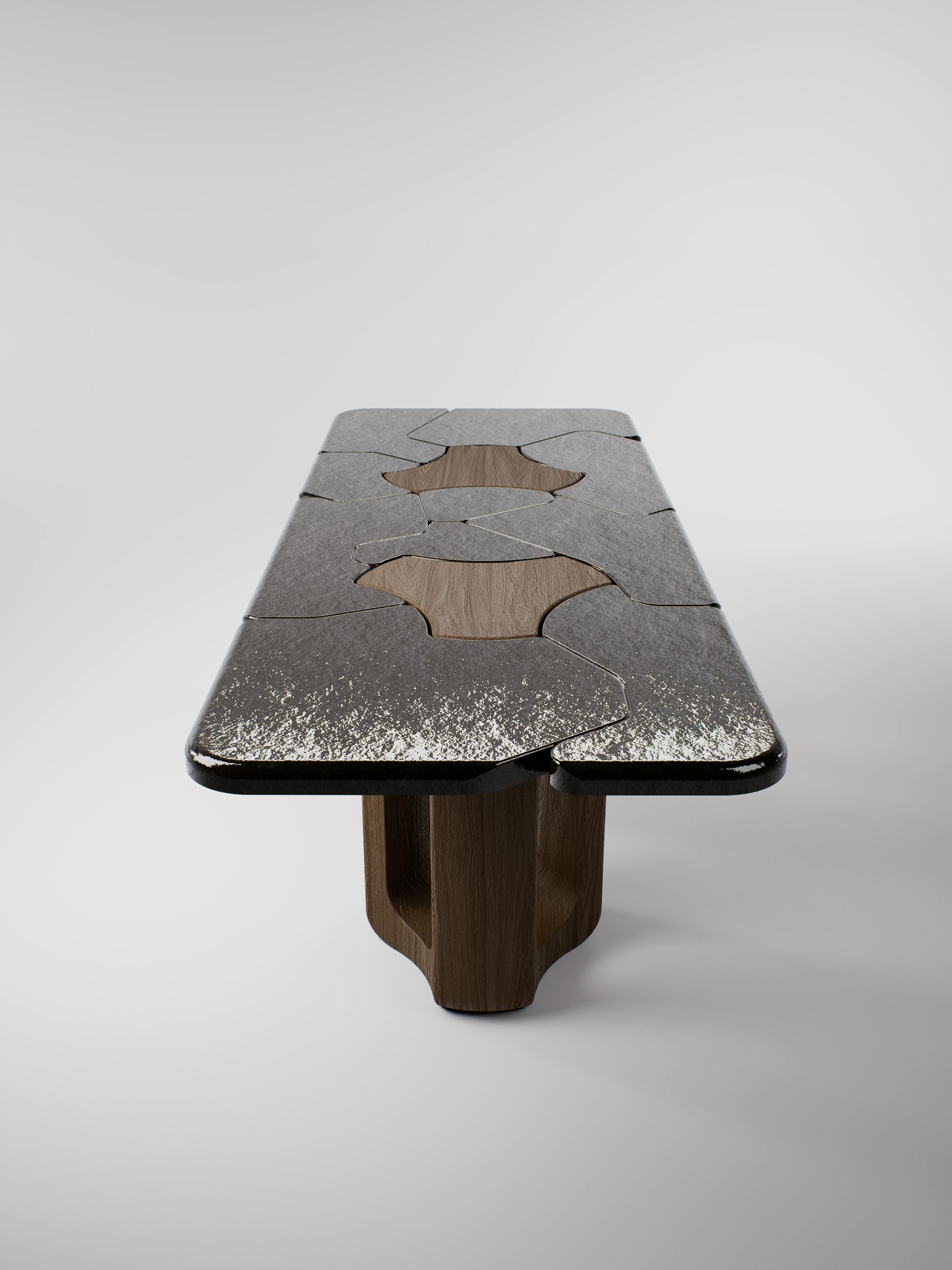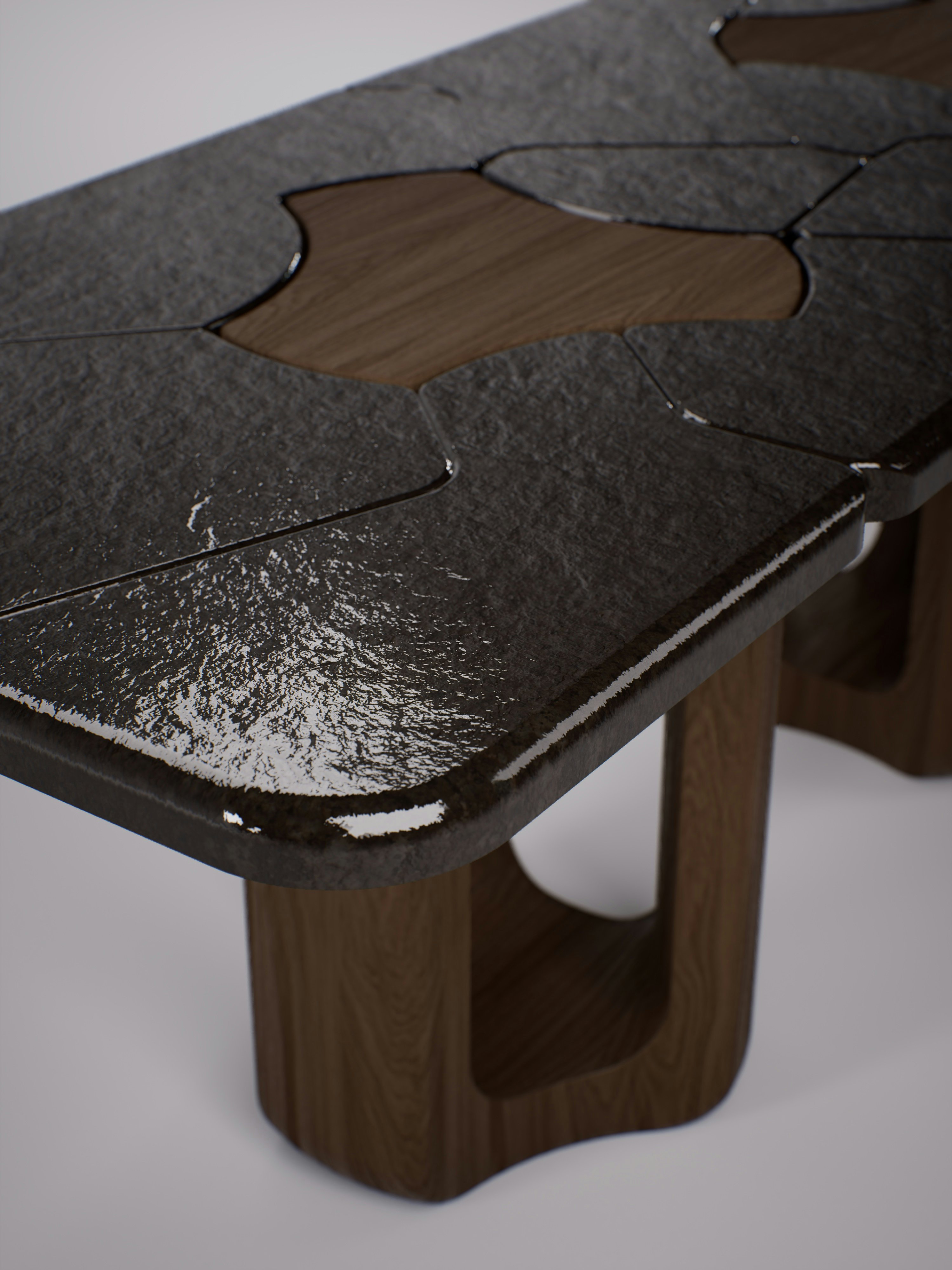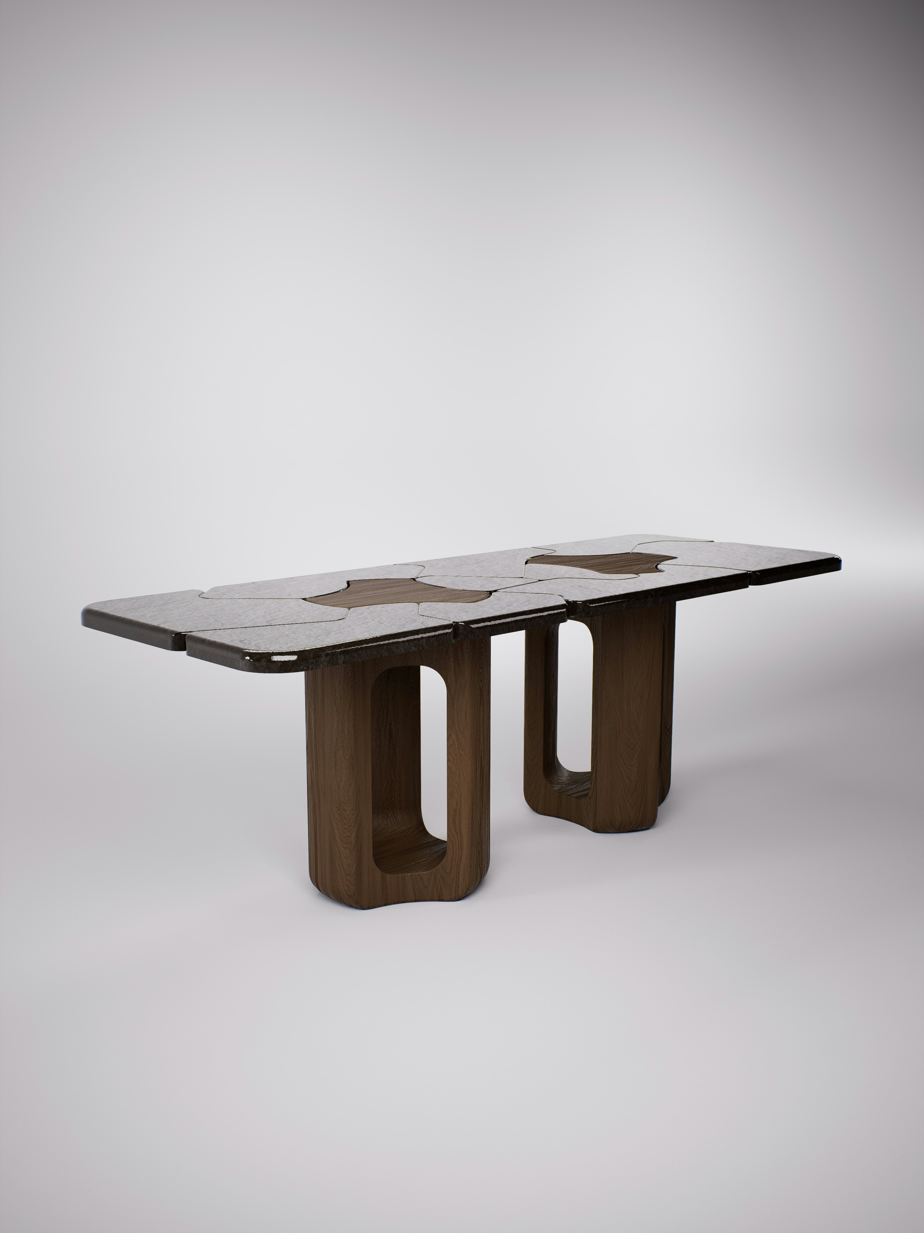 Console table pictured in dark oak with a lava stone black crème brûlée tabletop.