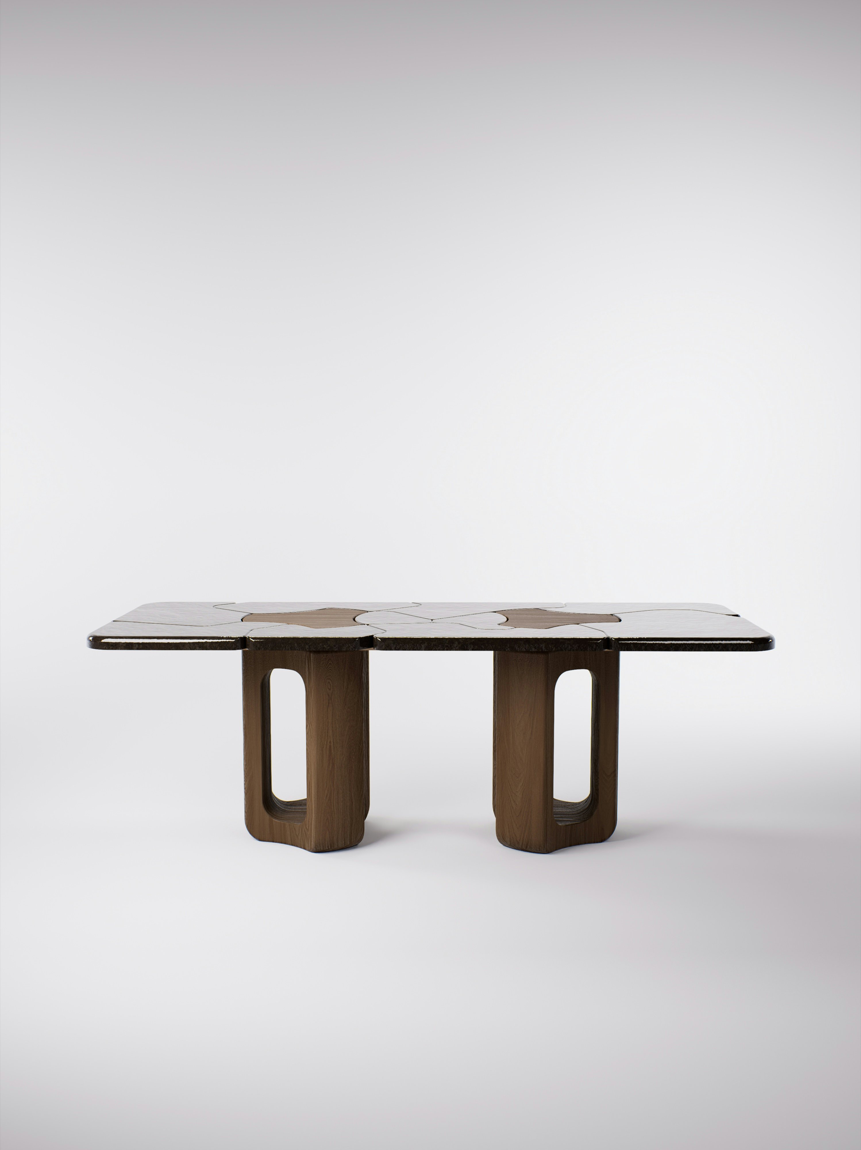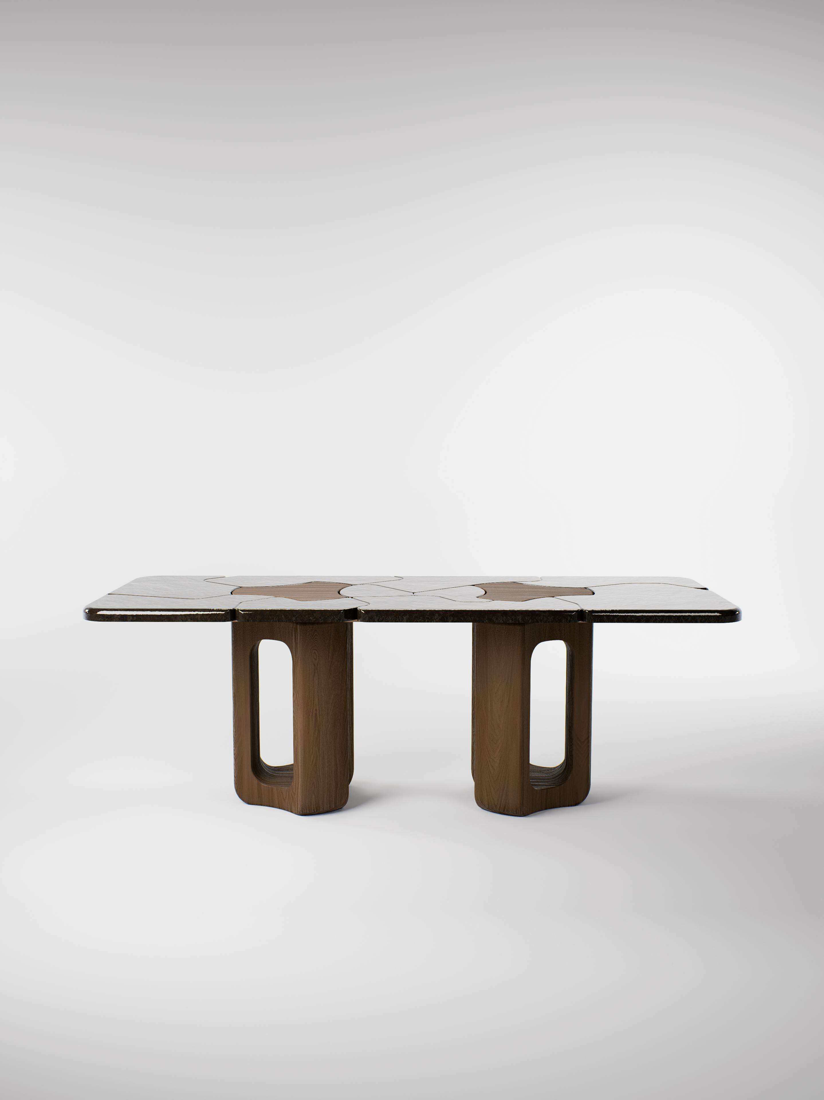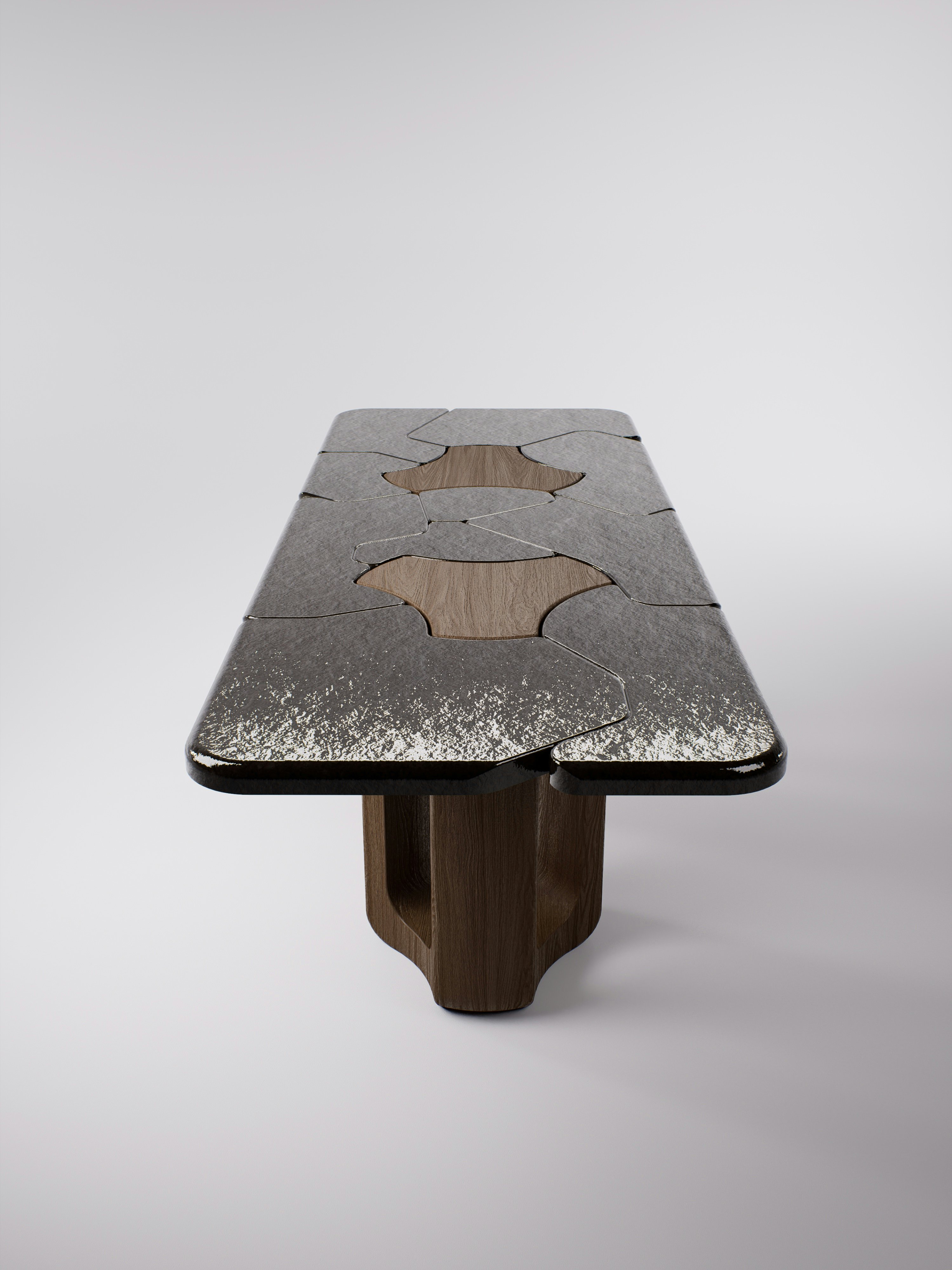 Console table pictured in dark oak with a lava stone black crème brûlée tabletop.