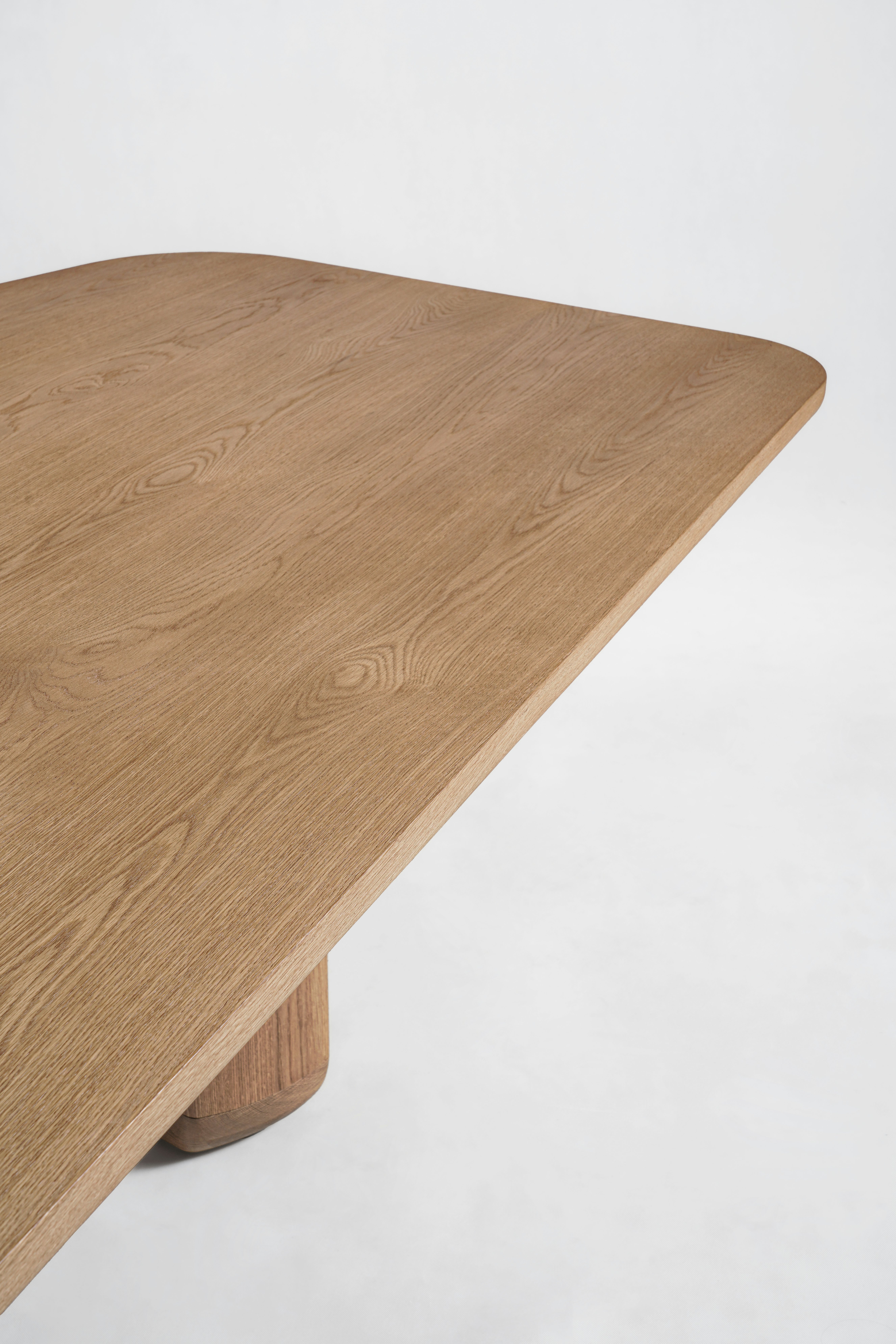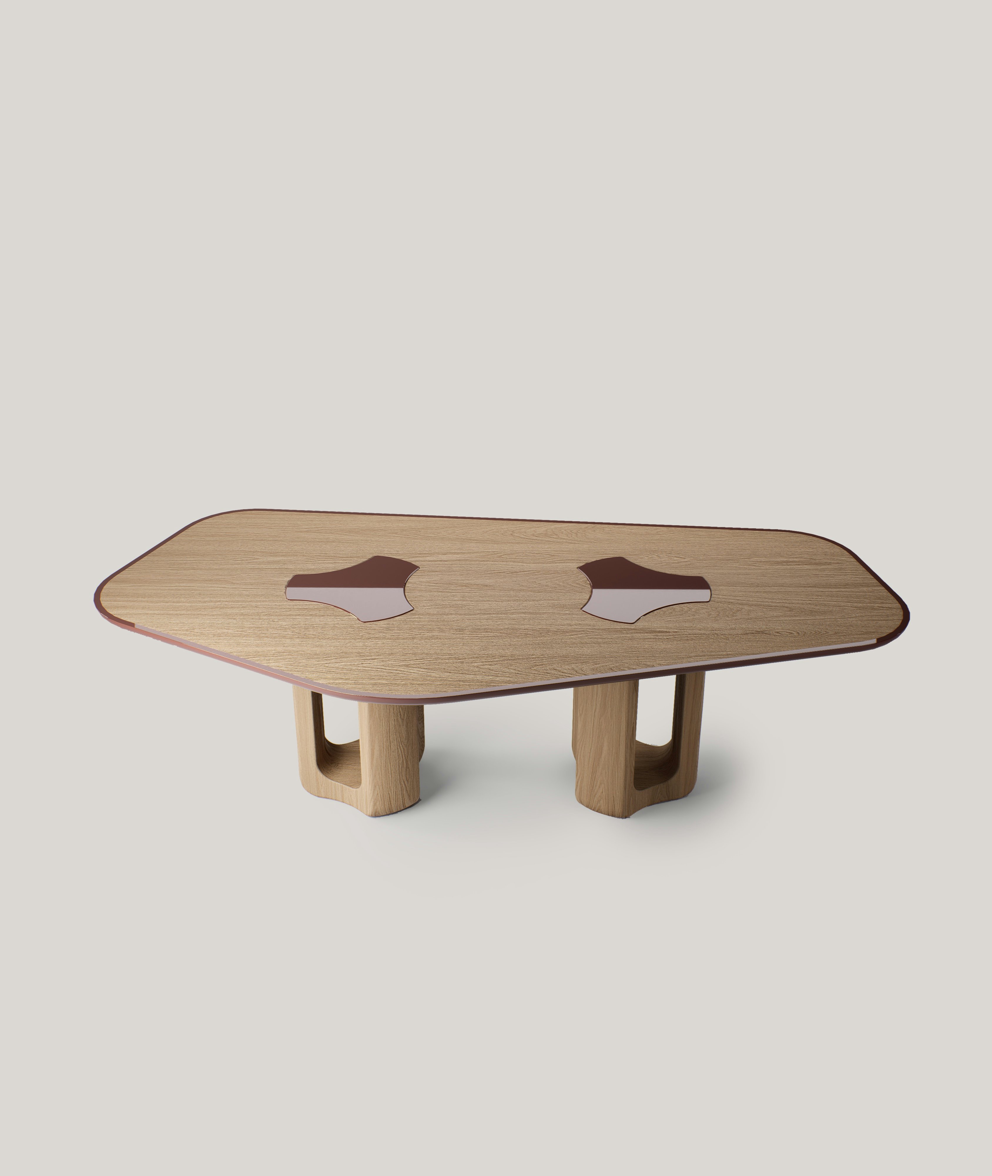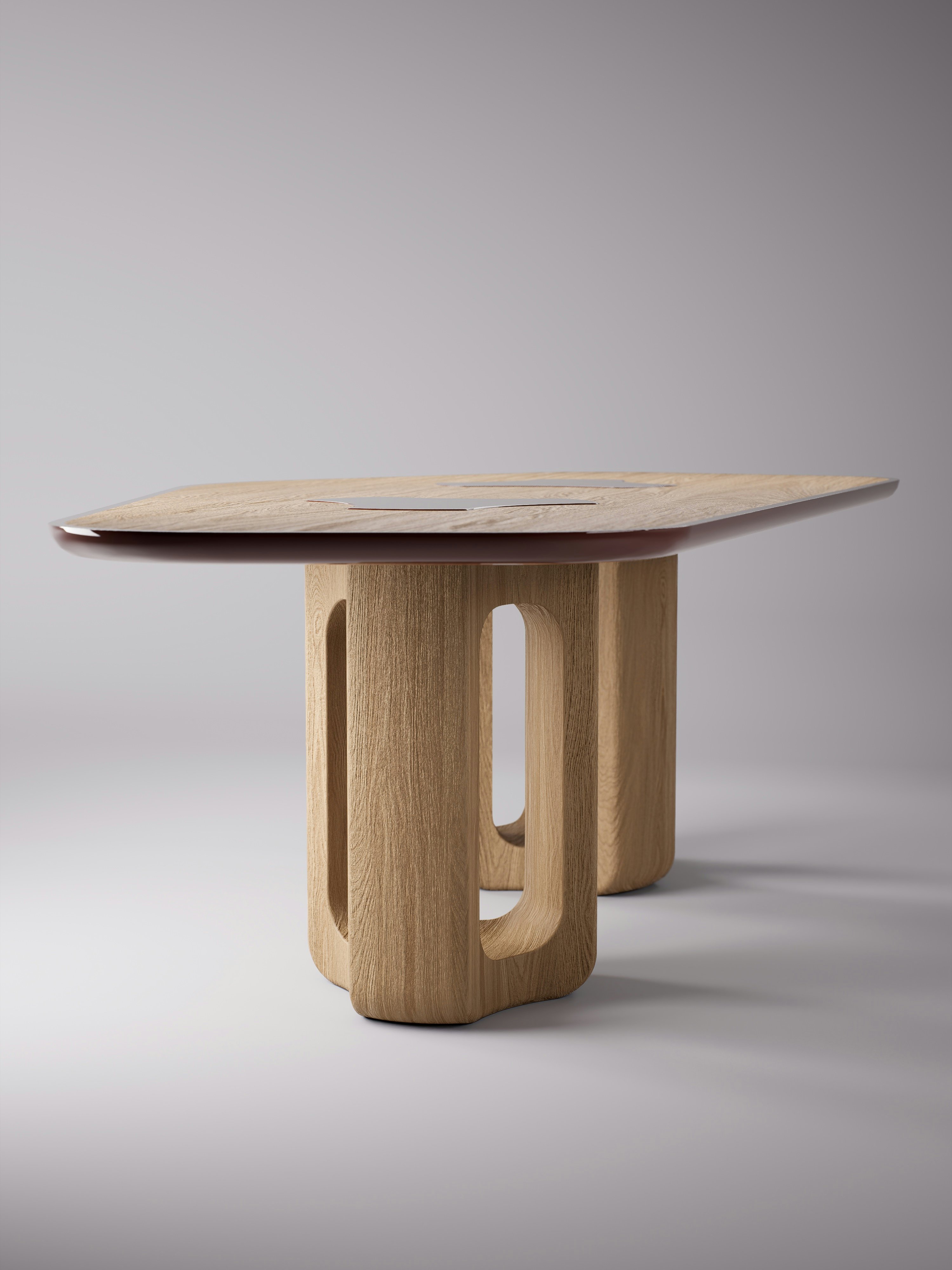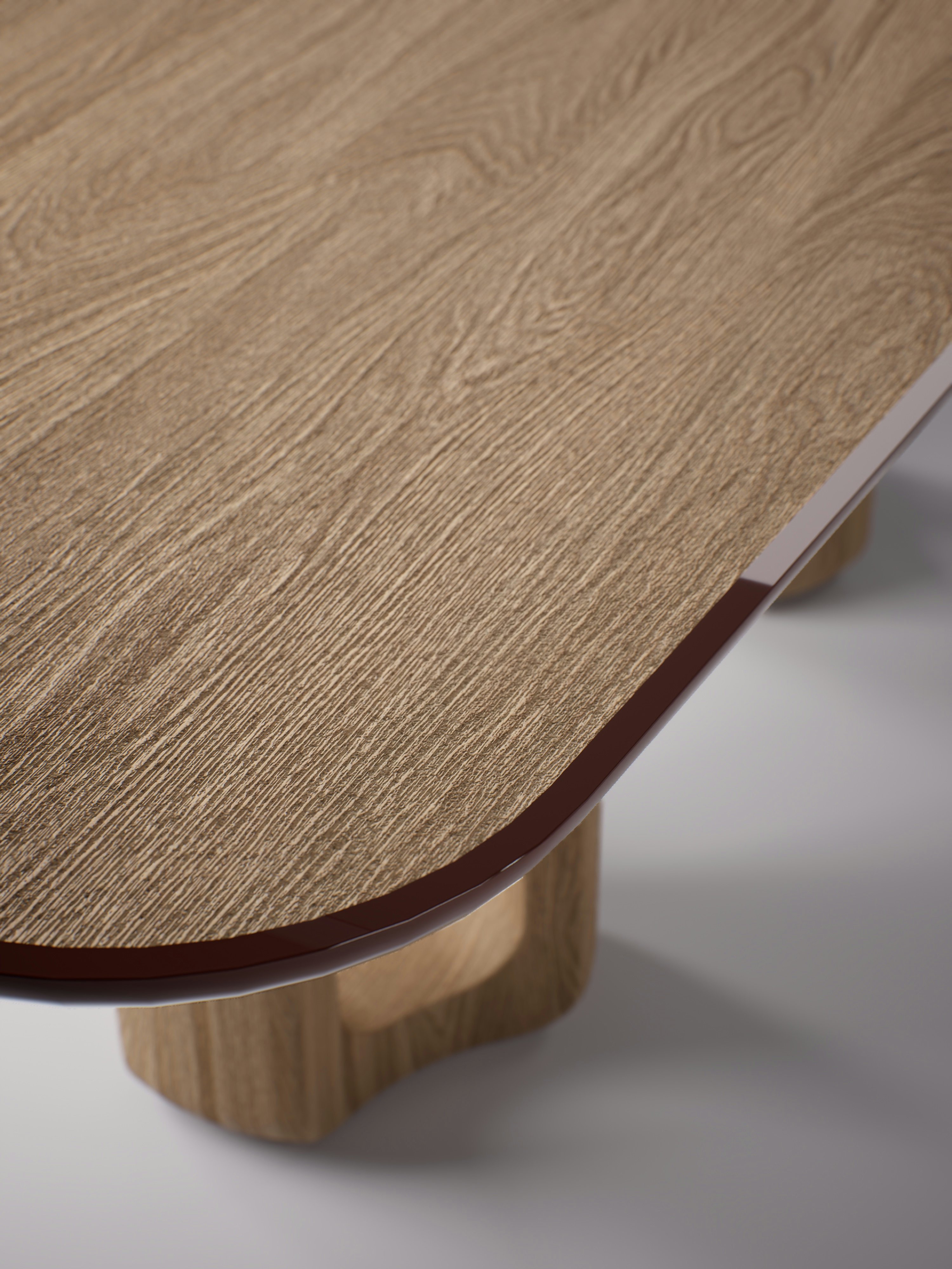 Curved dining table pictured in natural oak with edging and inlays in oxide red lacquer.