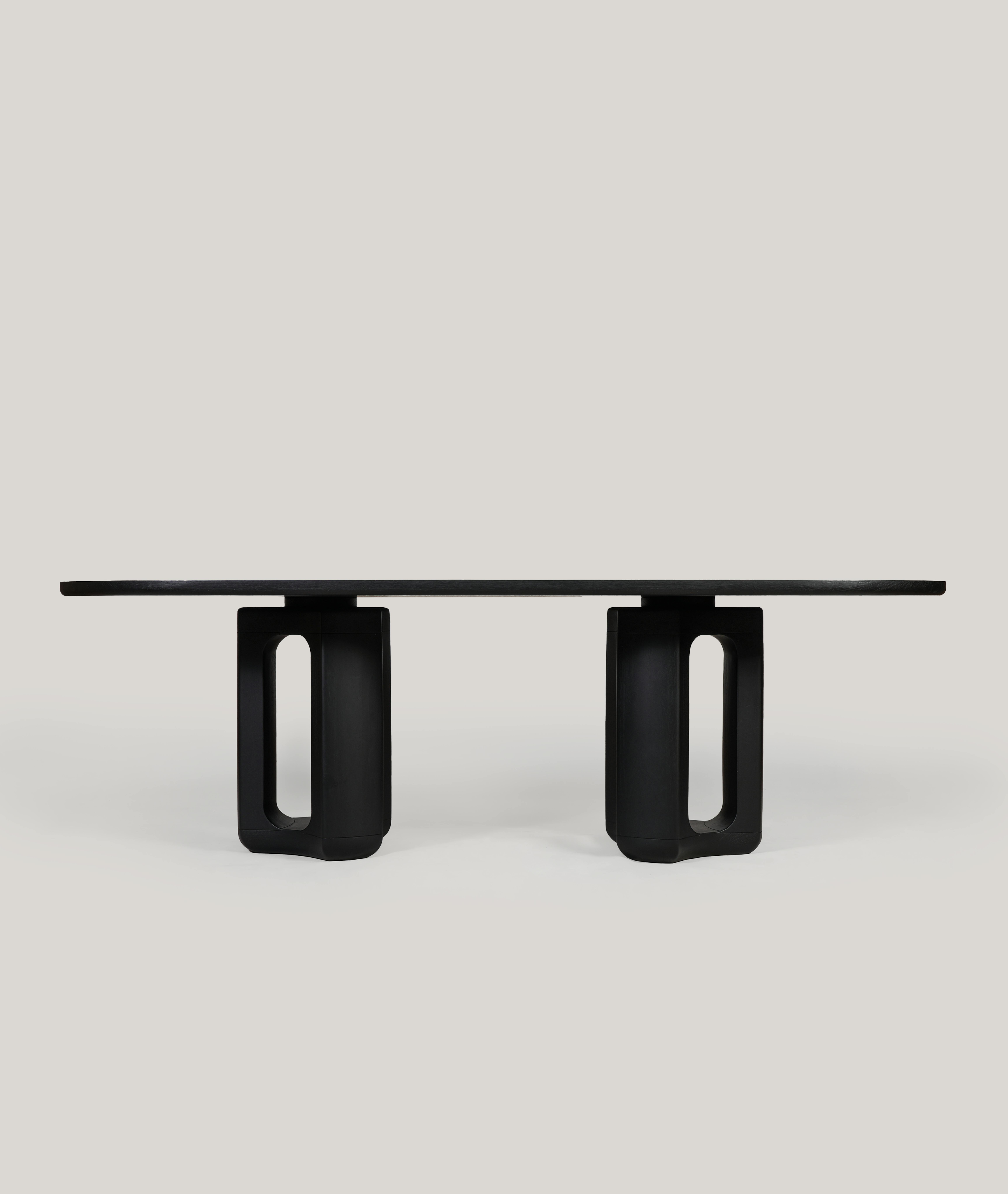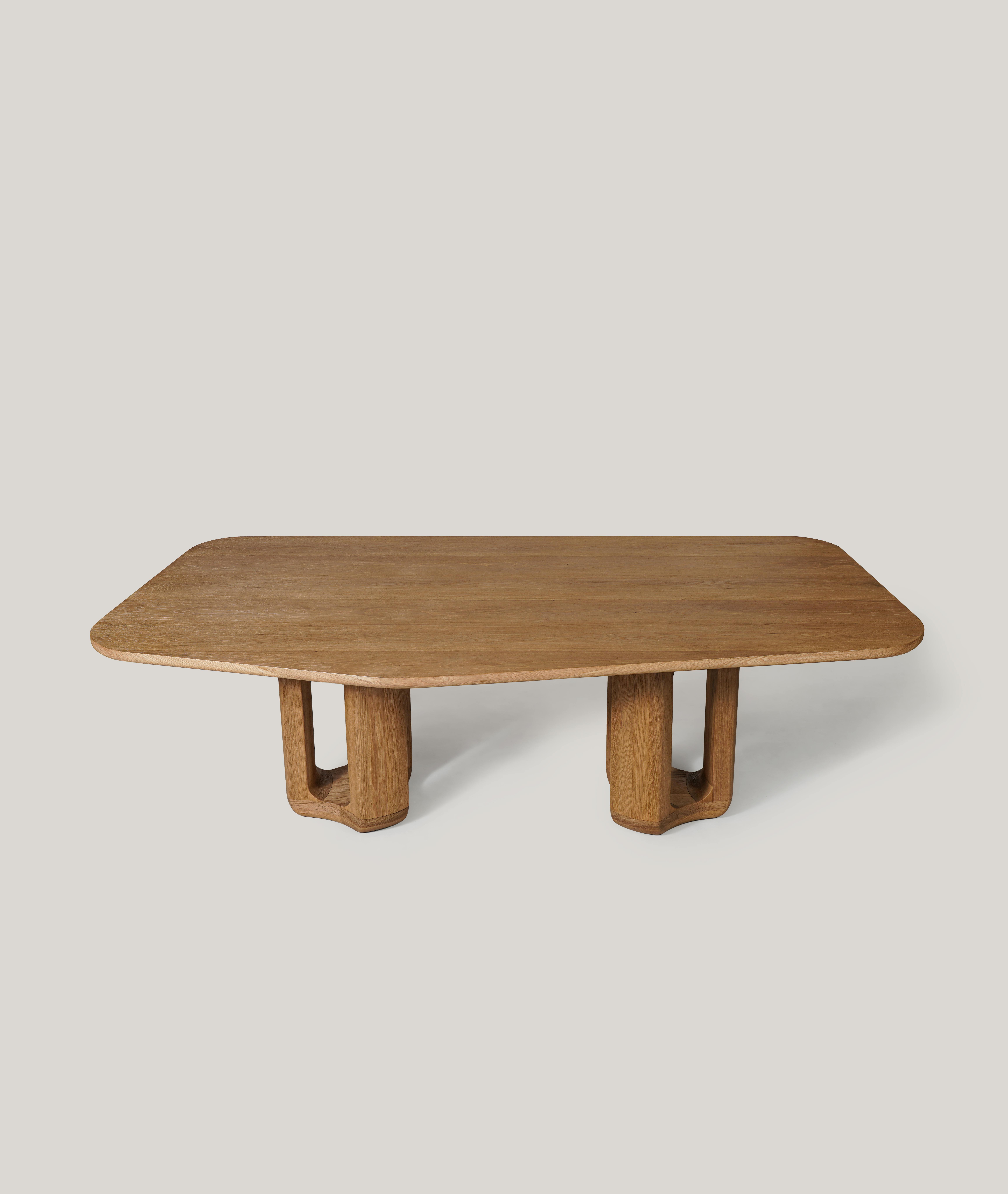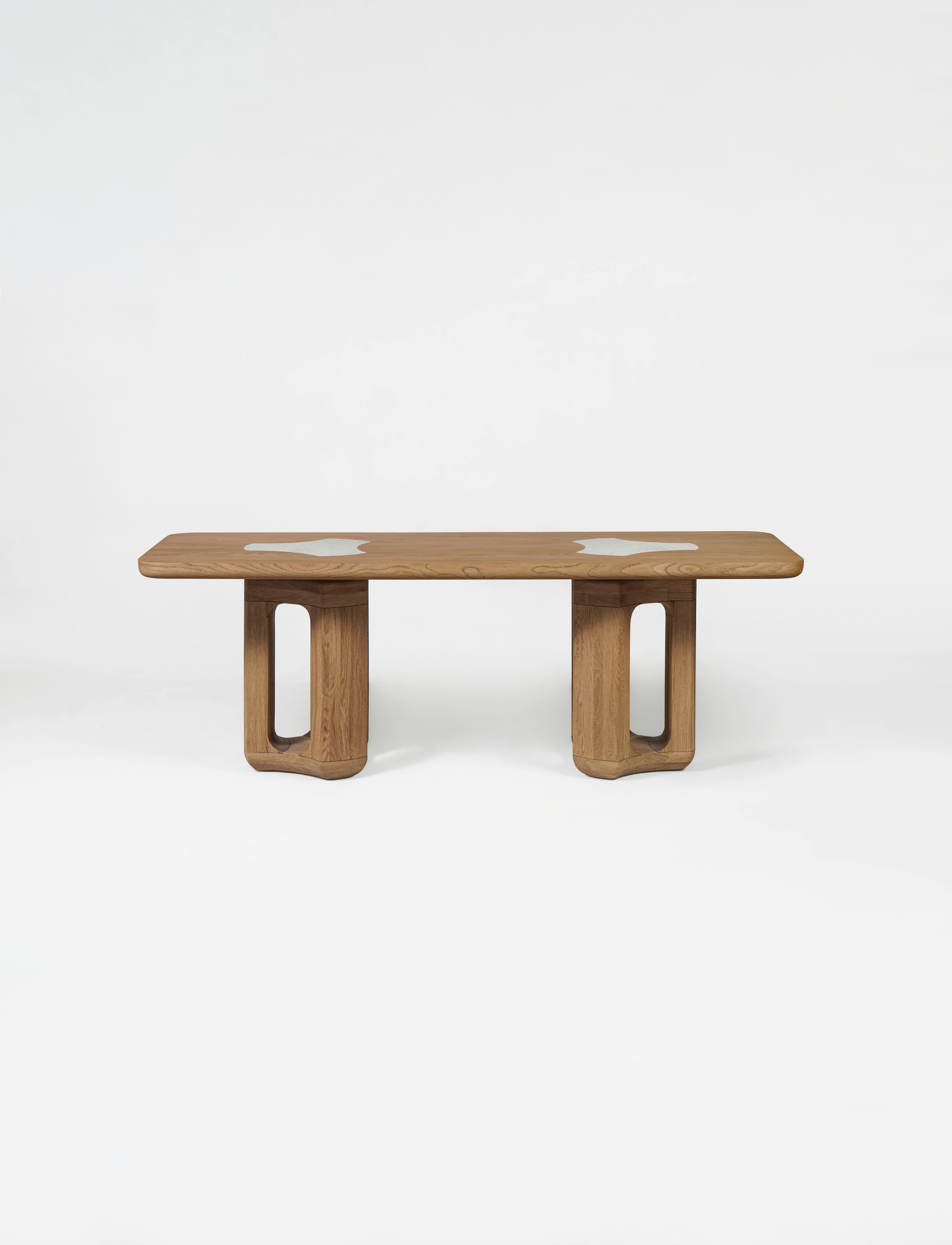Deepah dining table pictured in natural oak with an inlay of raku blanc écru at the center of the tabletop.