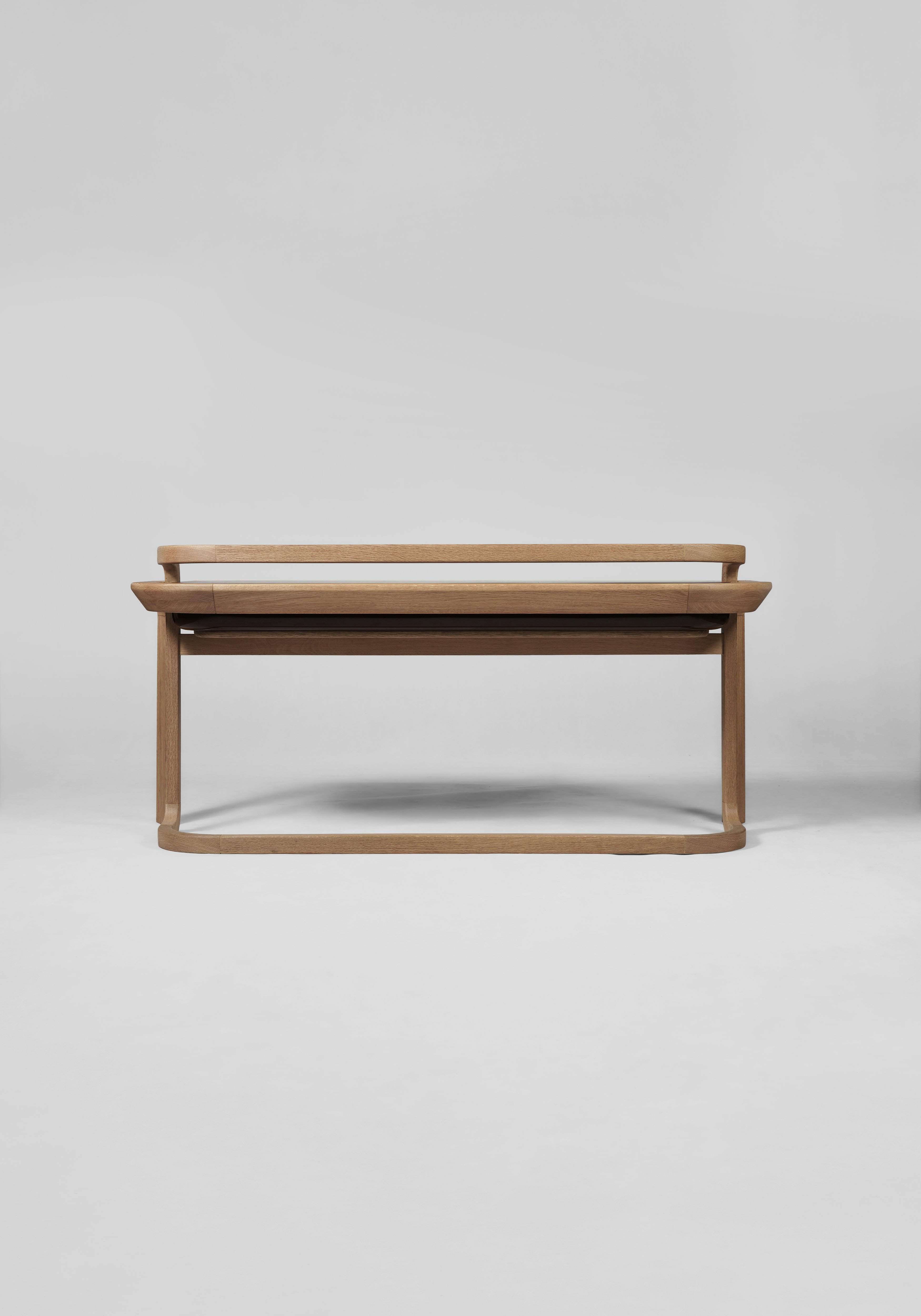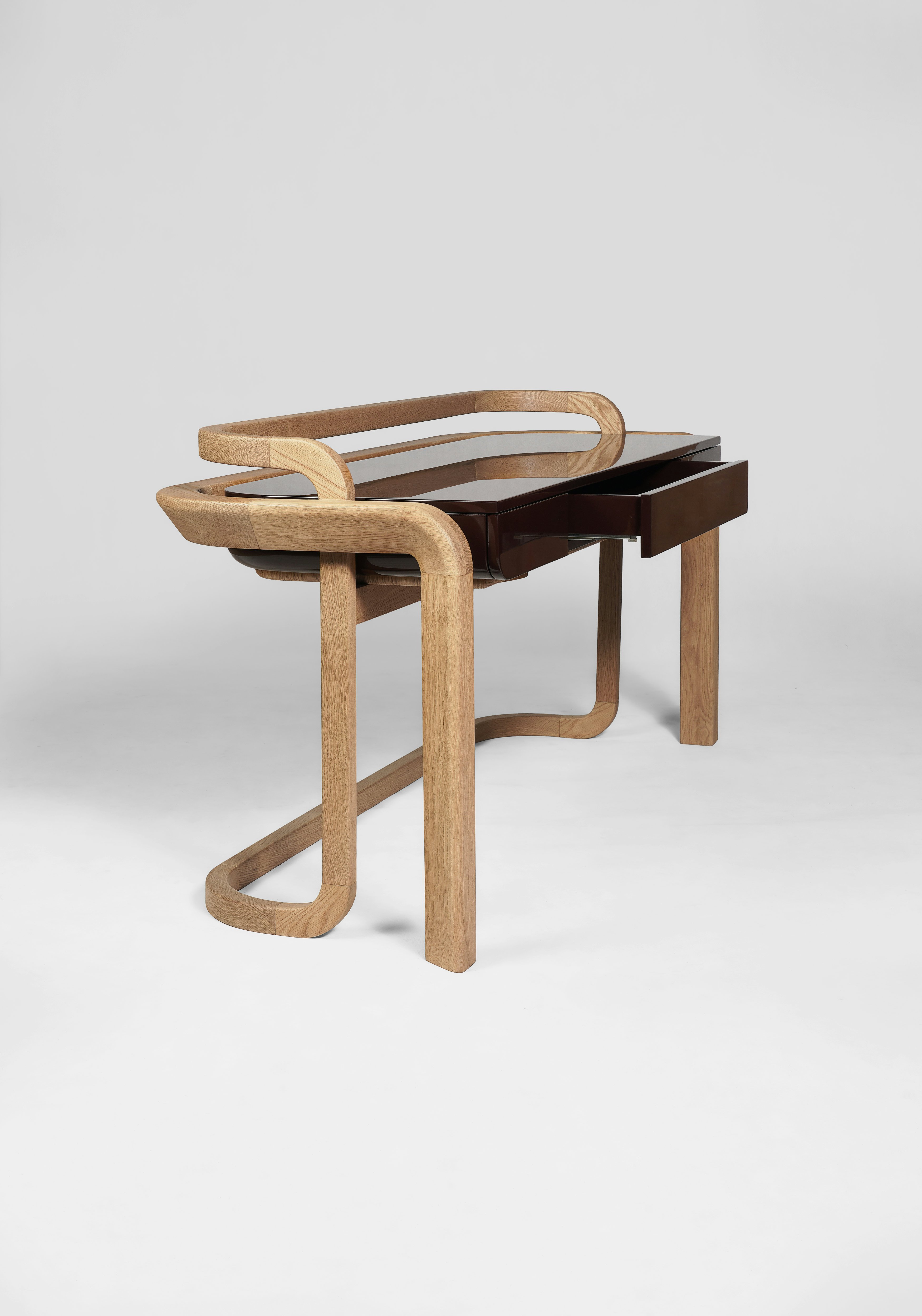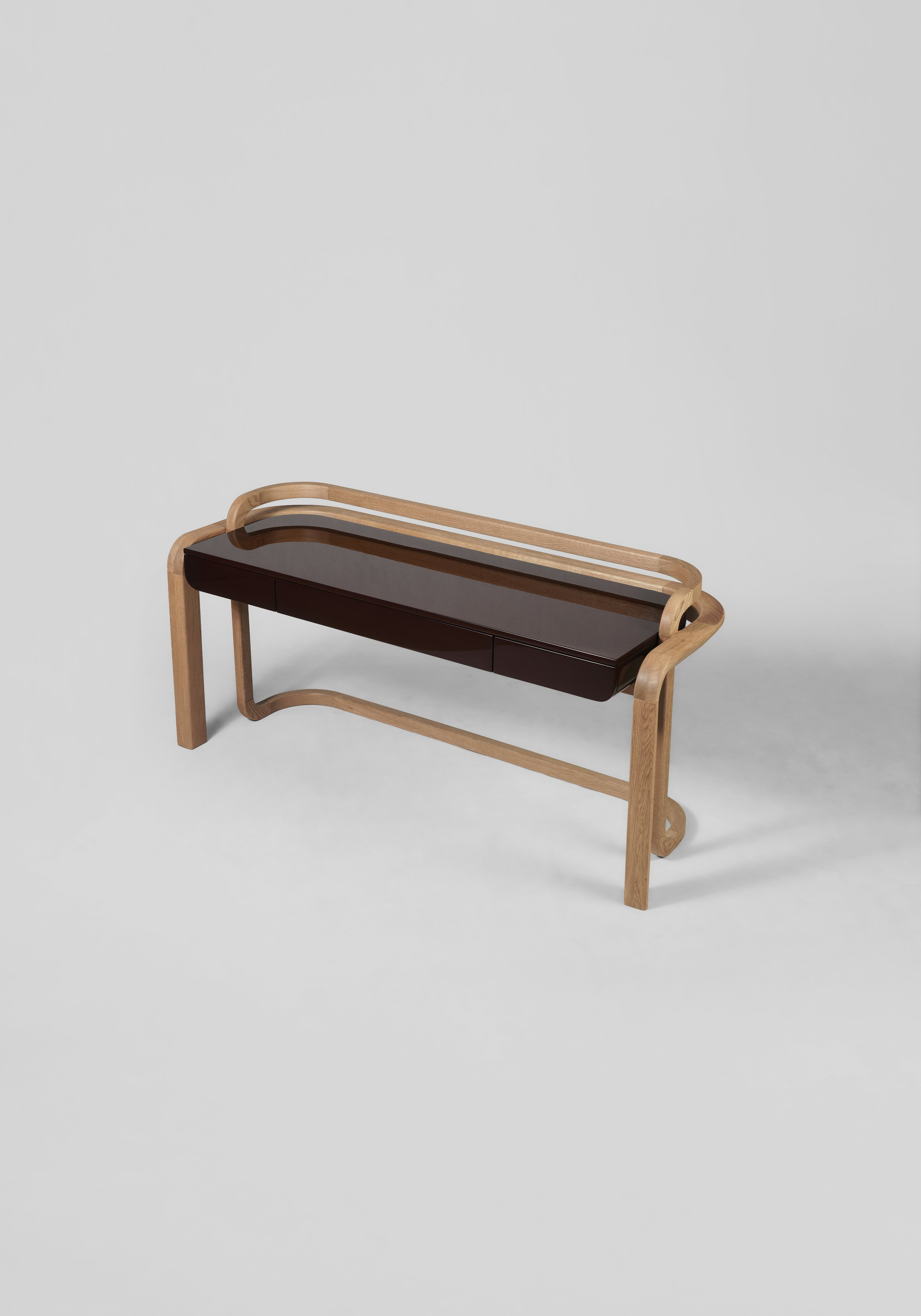 Desk/Console pictured with a natural oak body and an oxide red lacquer tabletop.