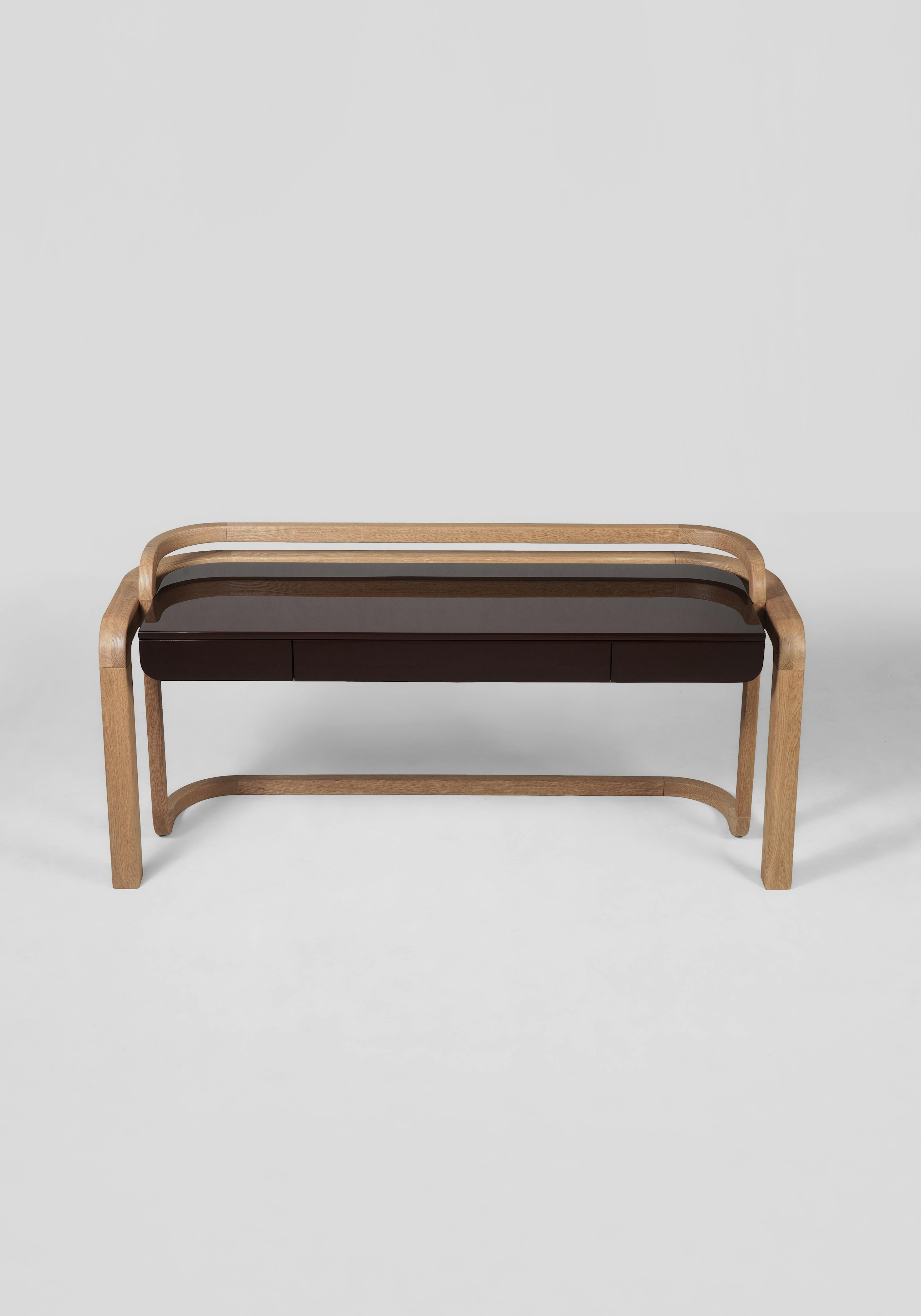 Desk/Console pictured with a natural oak body and a coffee lacquer tabletop.