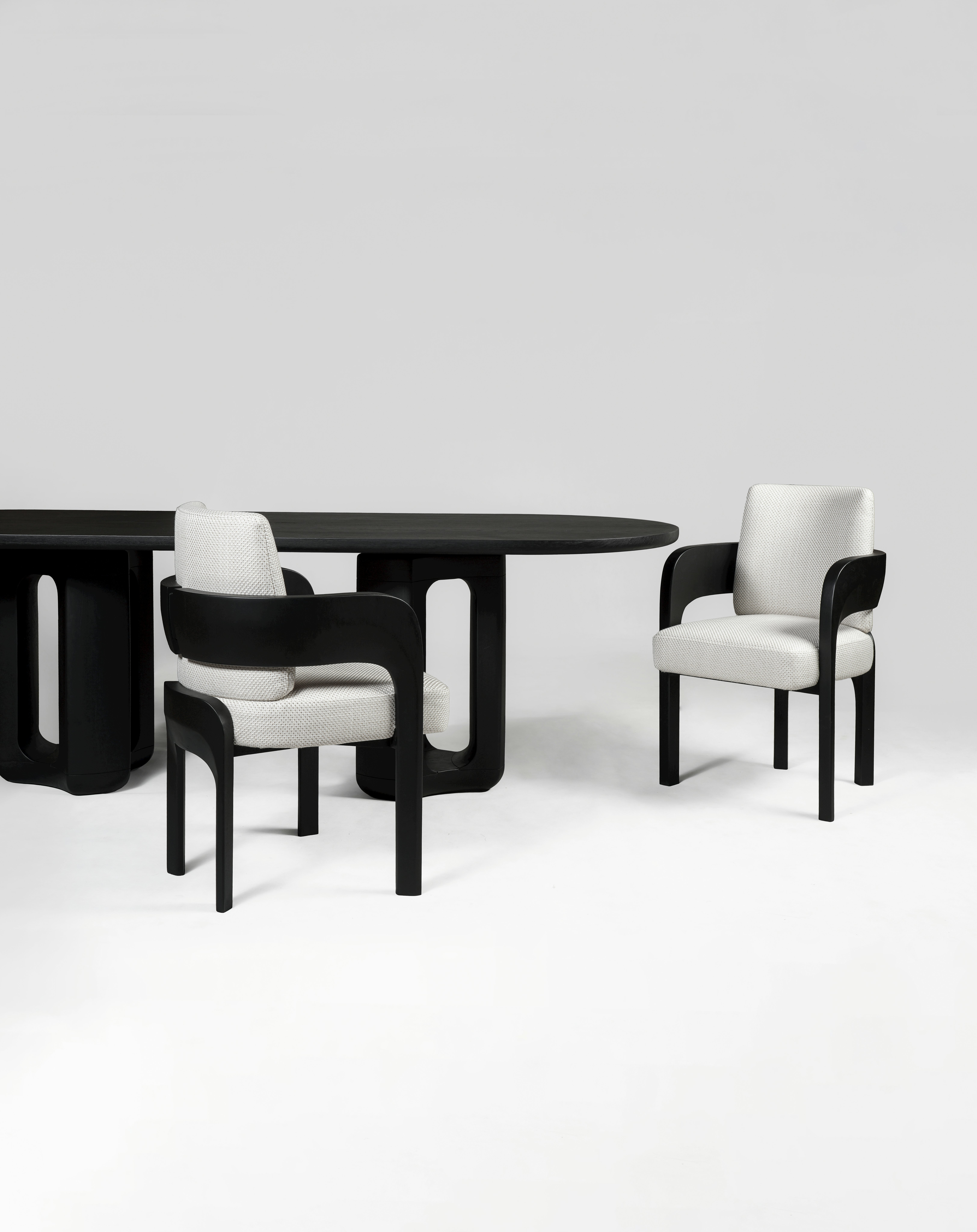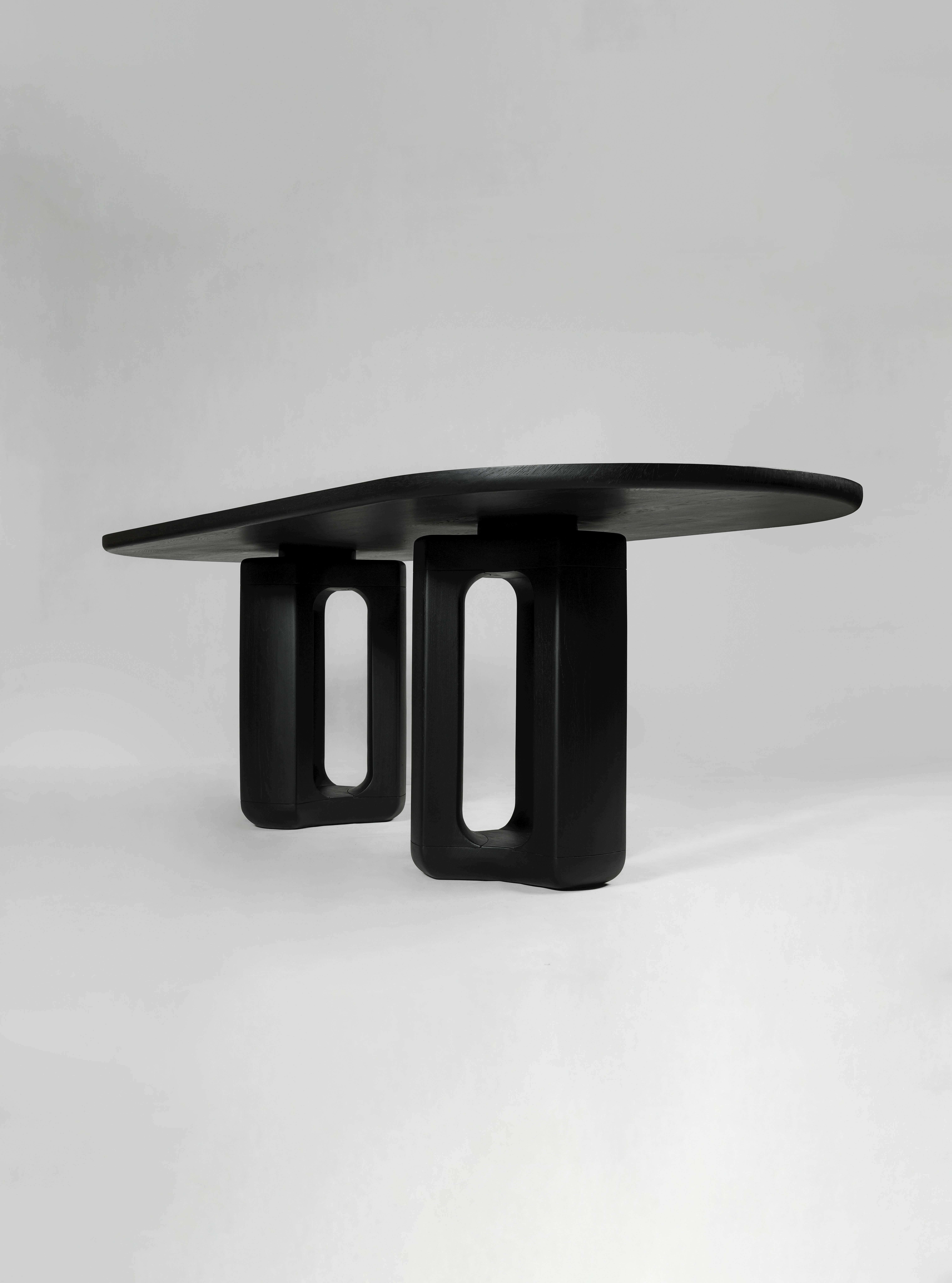 Dining table pictured in black teak with a black teak tabletop.