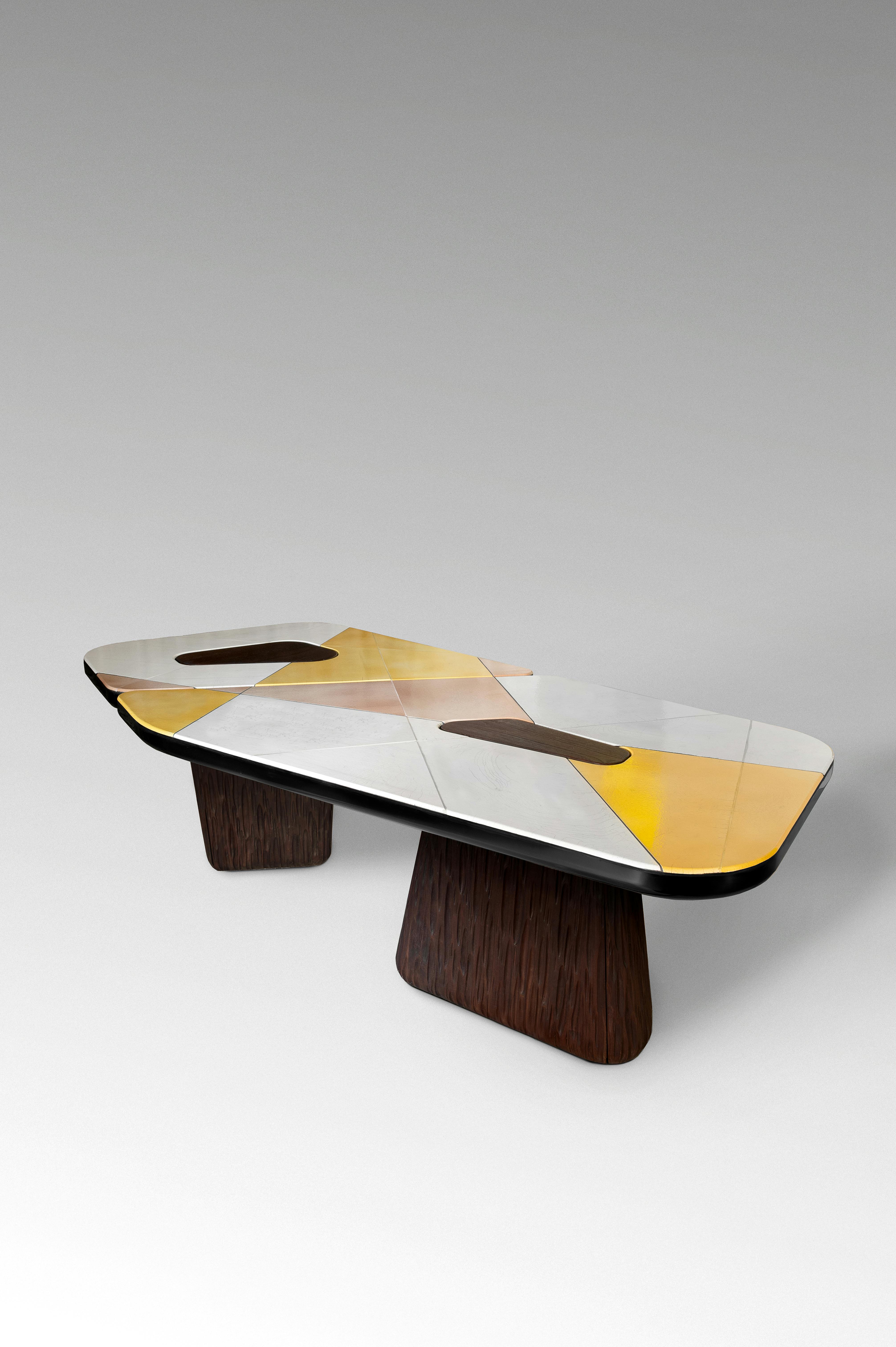 Dining table pictured in hand-carved natural oak with a Laguetta marble tabletop.