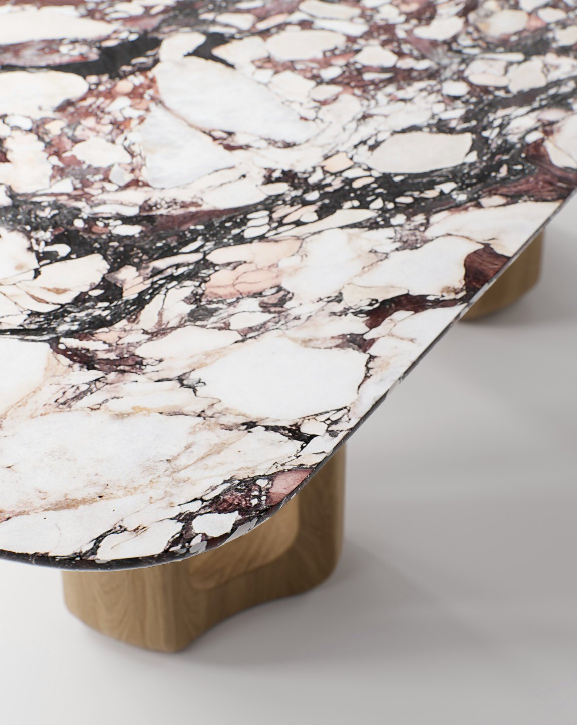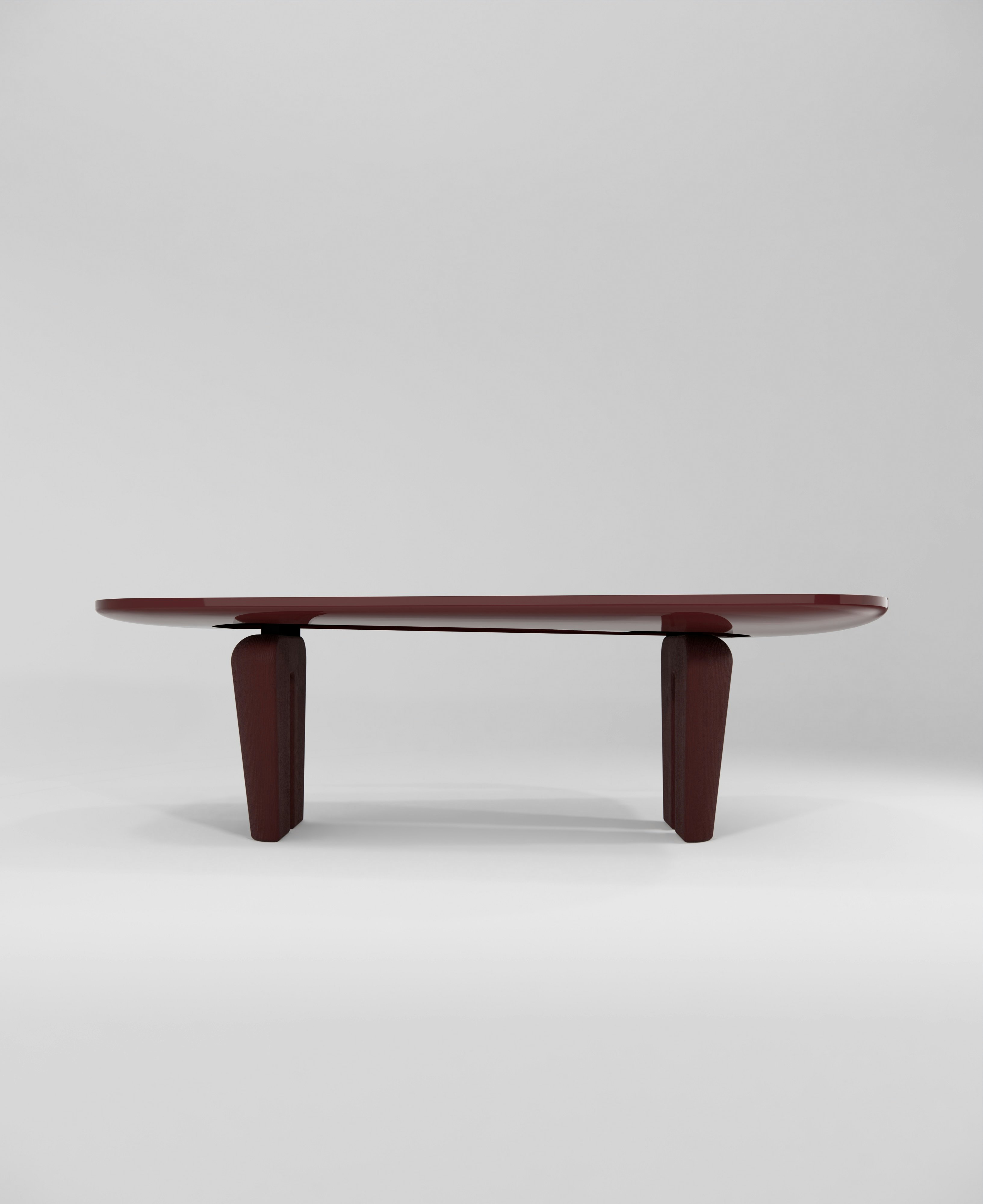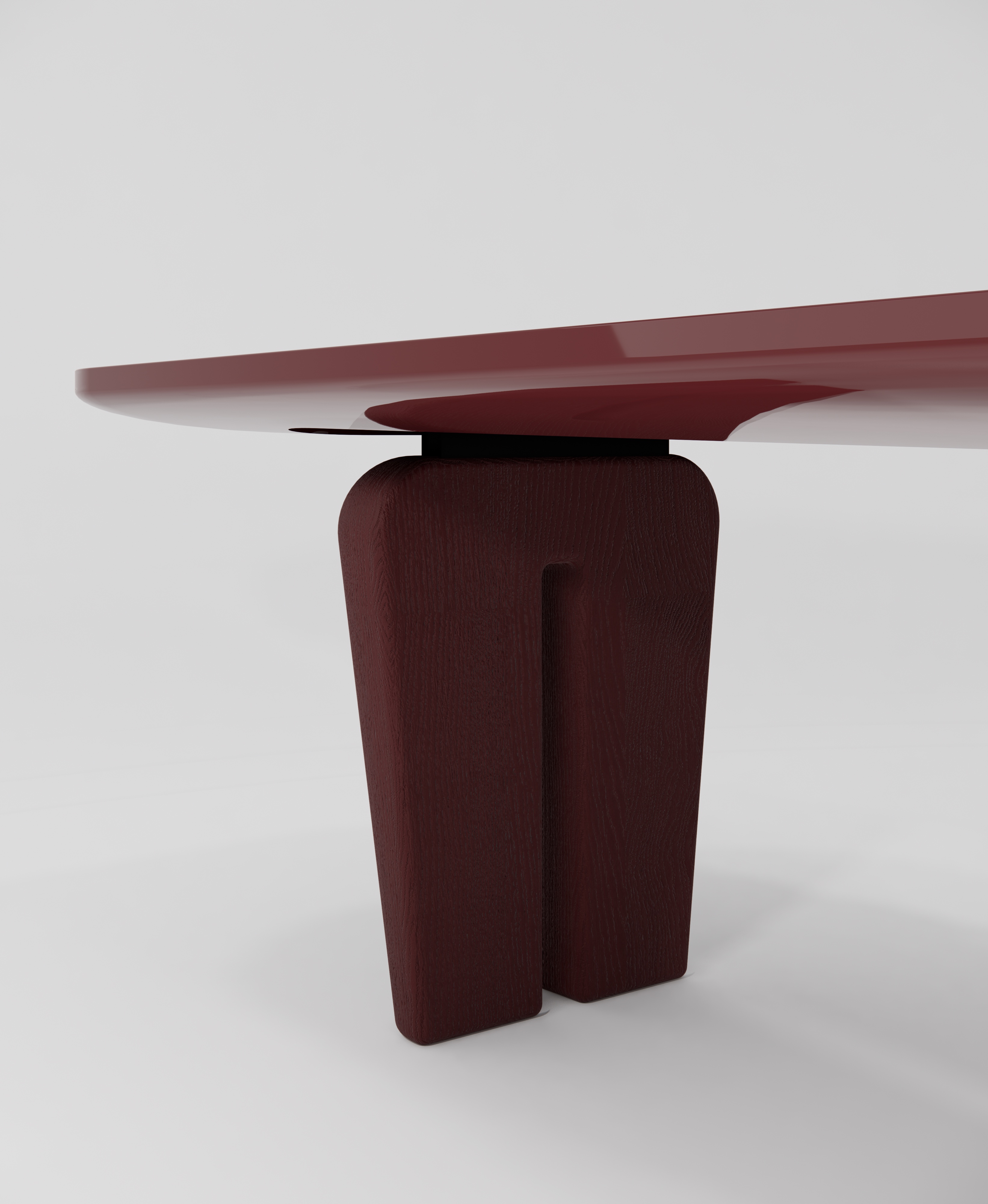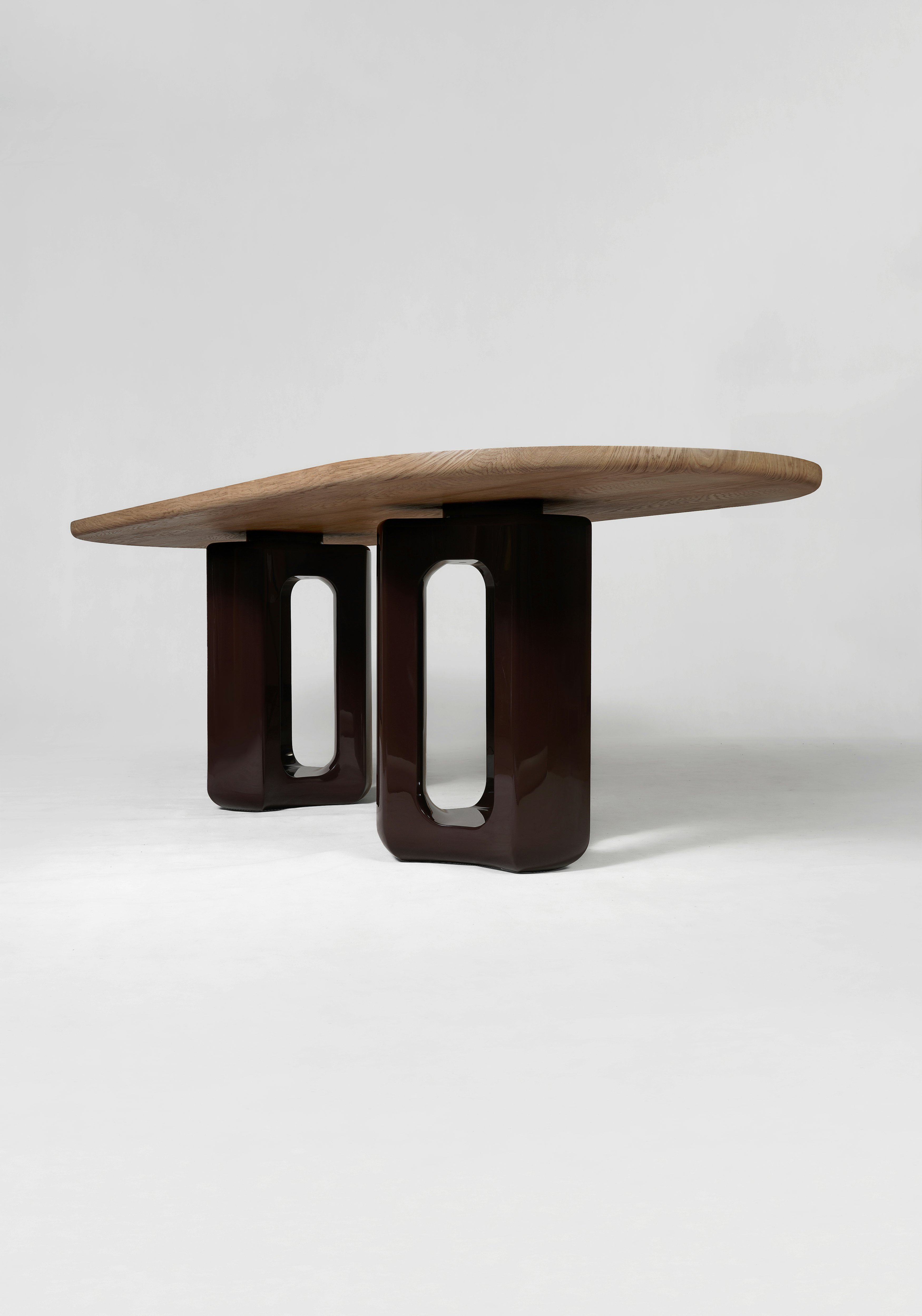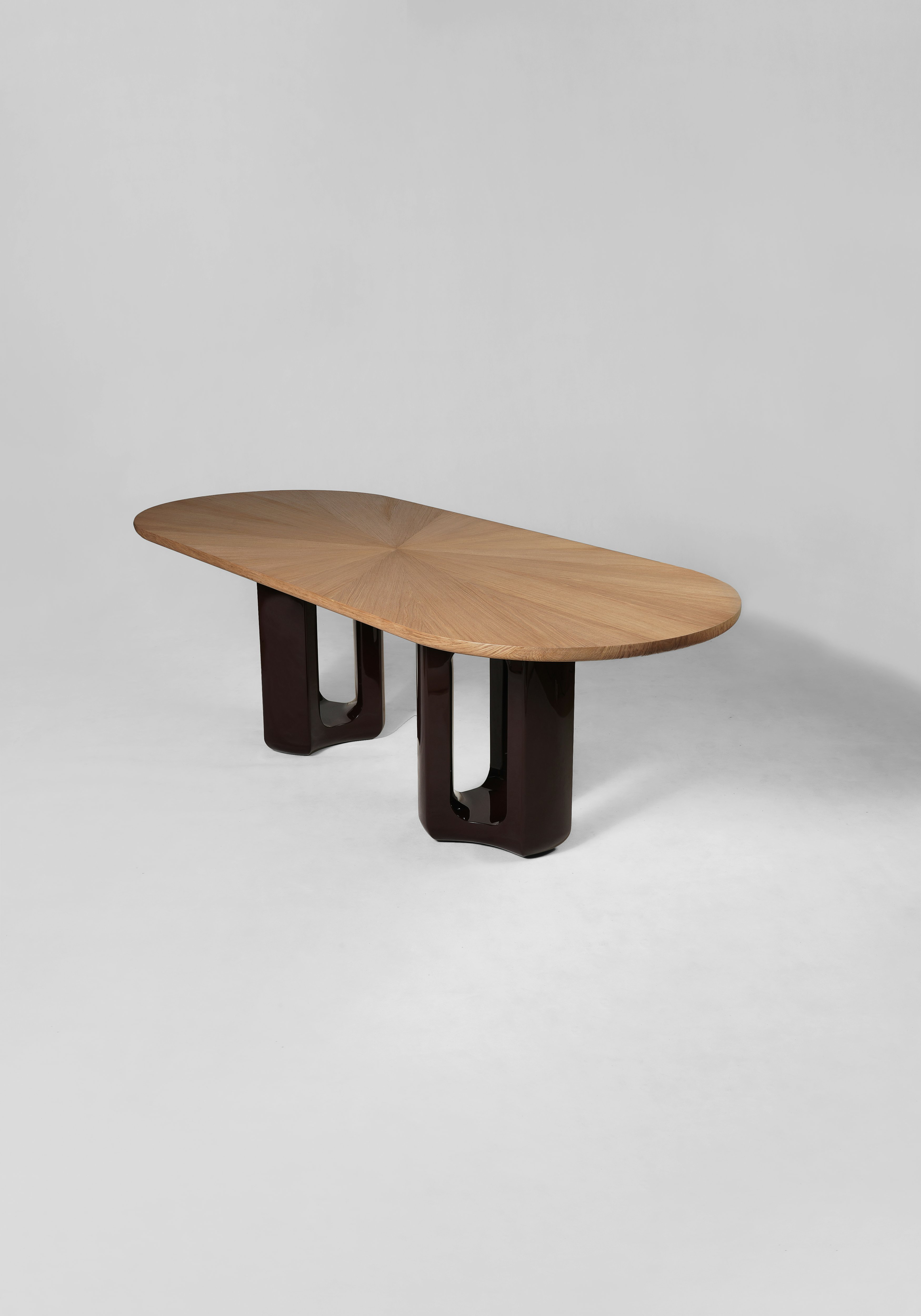 Dining table pictured with lacquer legs and a natural oak tabletop.