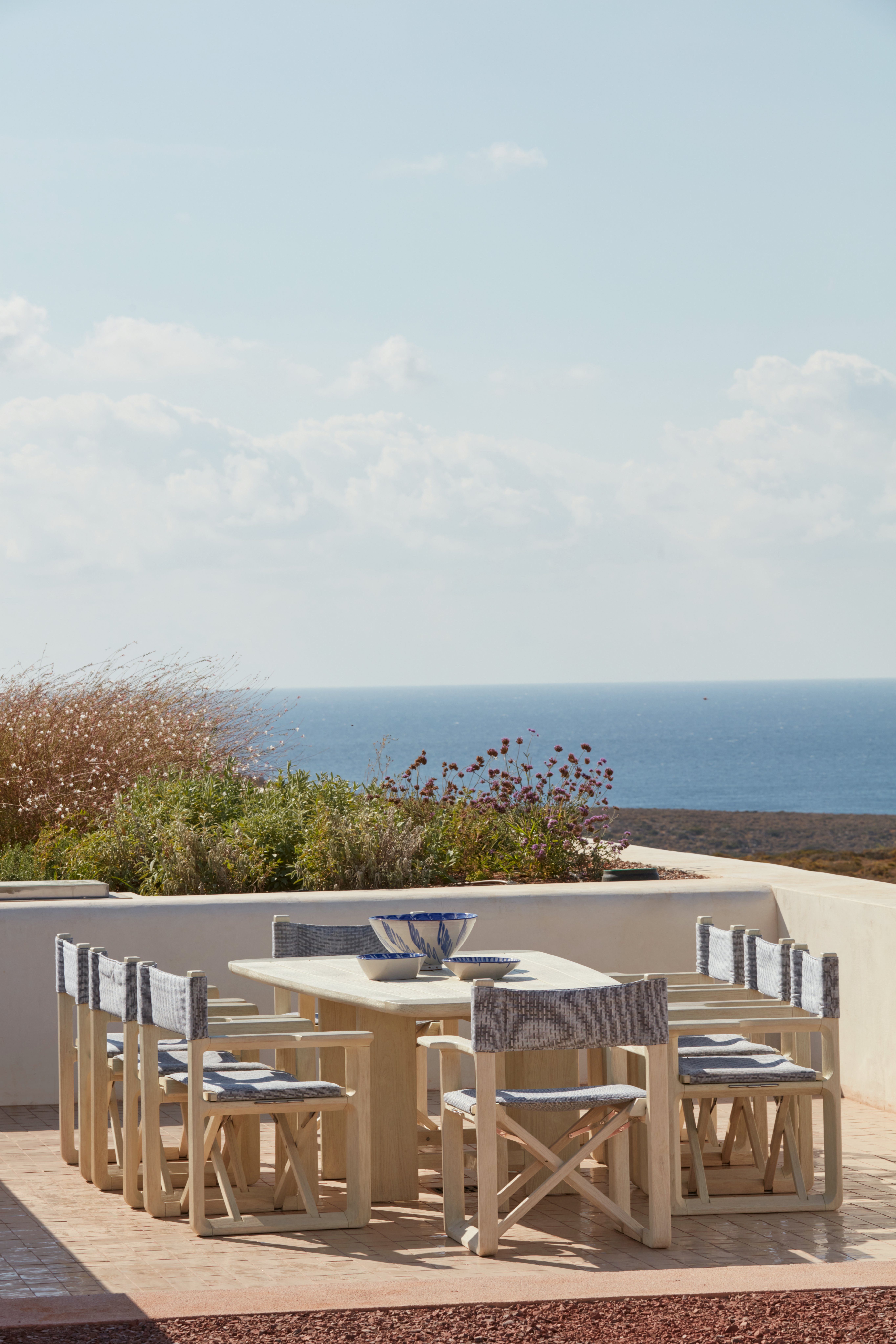 The back and seat are upholstered with Brickell by Schumacher.