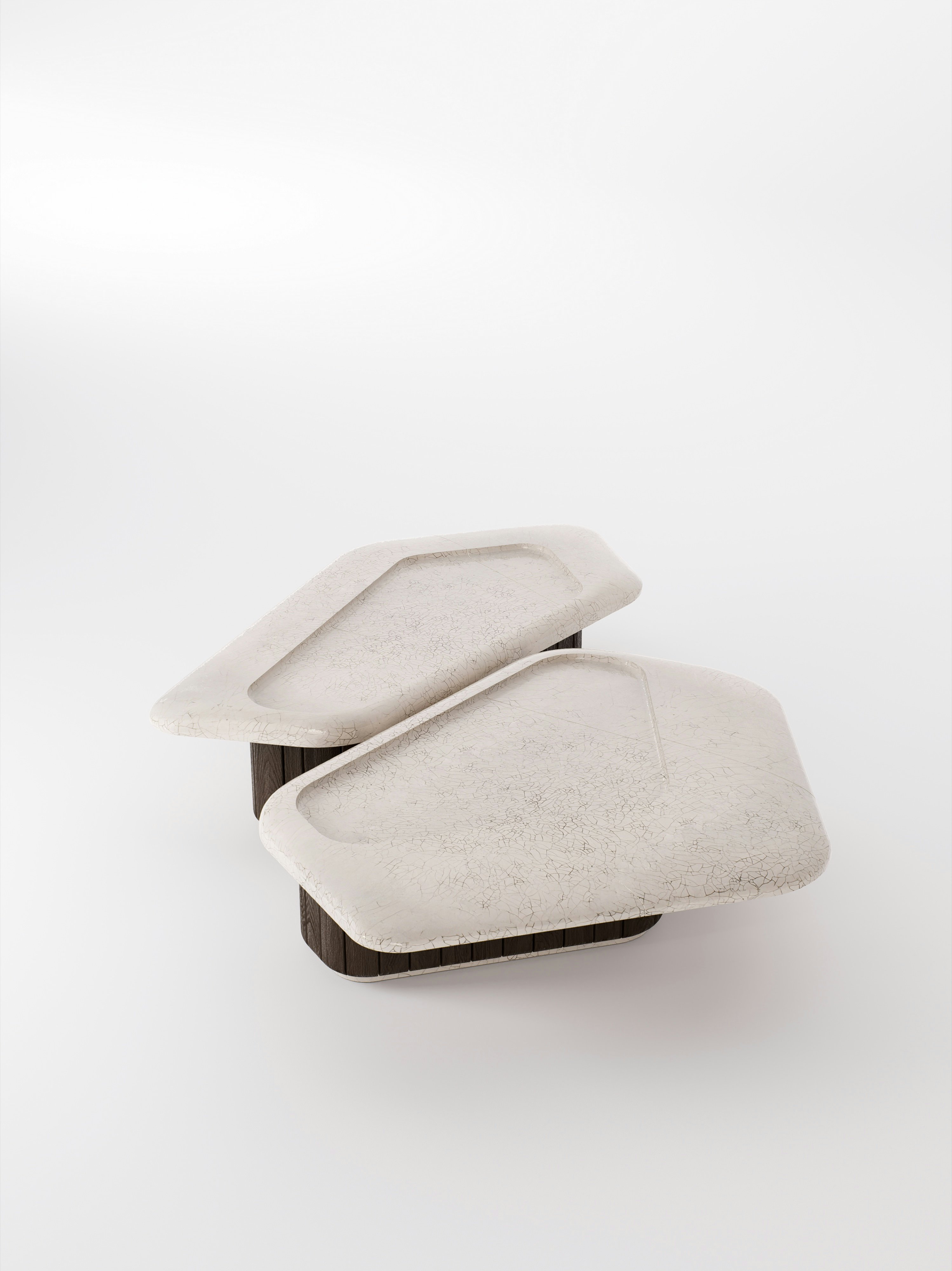 Mangala coffee table pictured in dark teak with a tabletop in raku vieux rose.