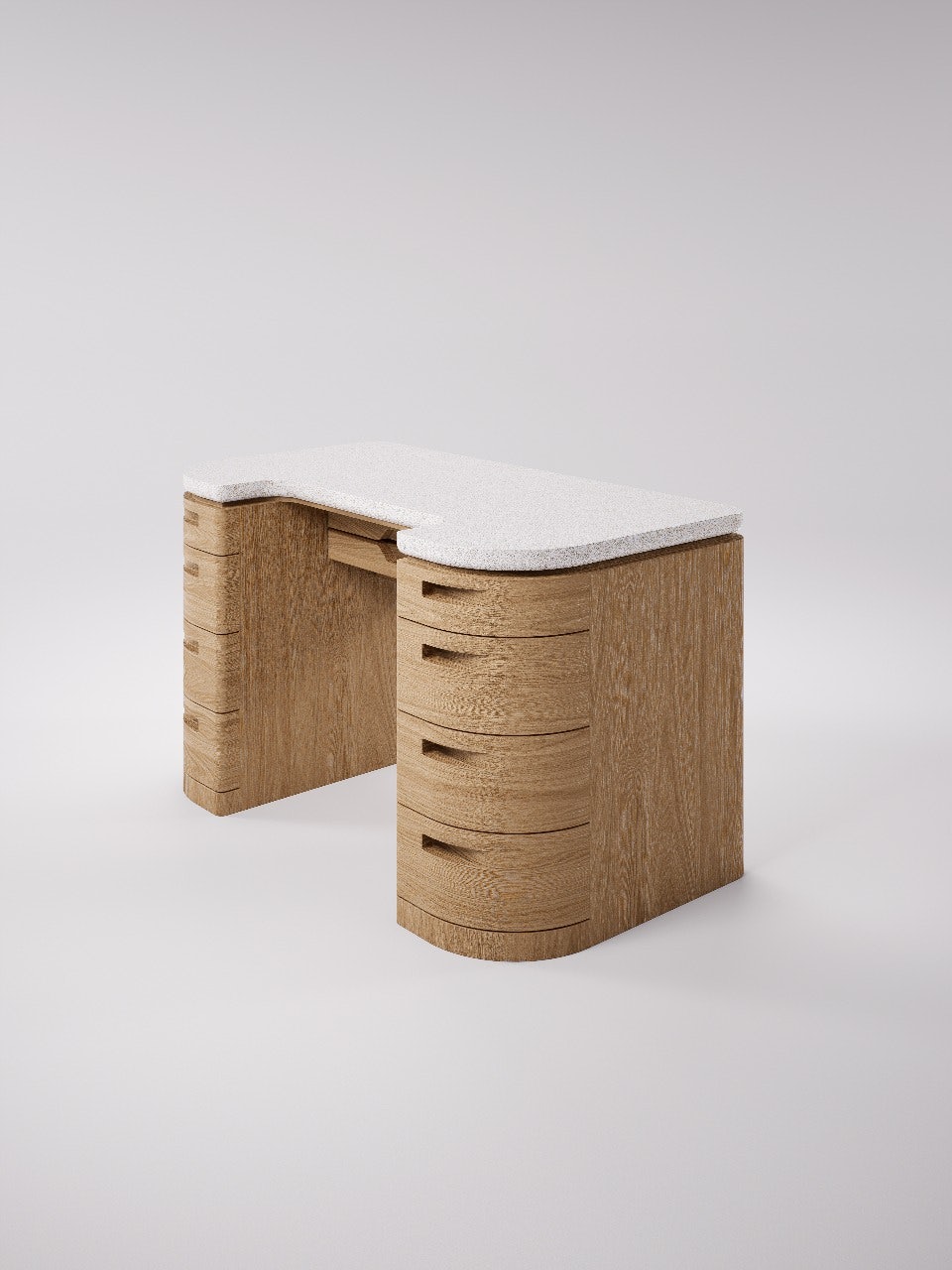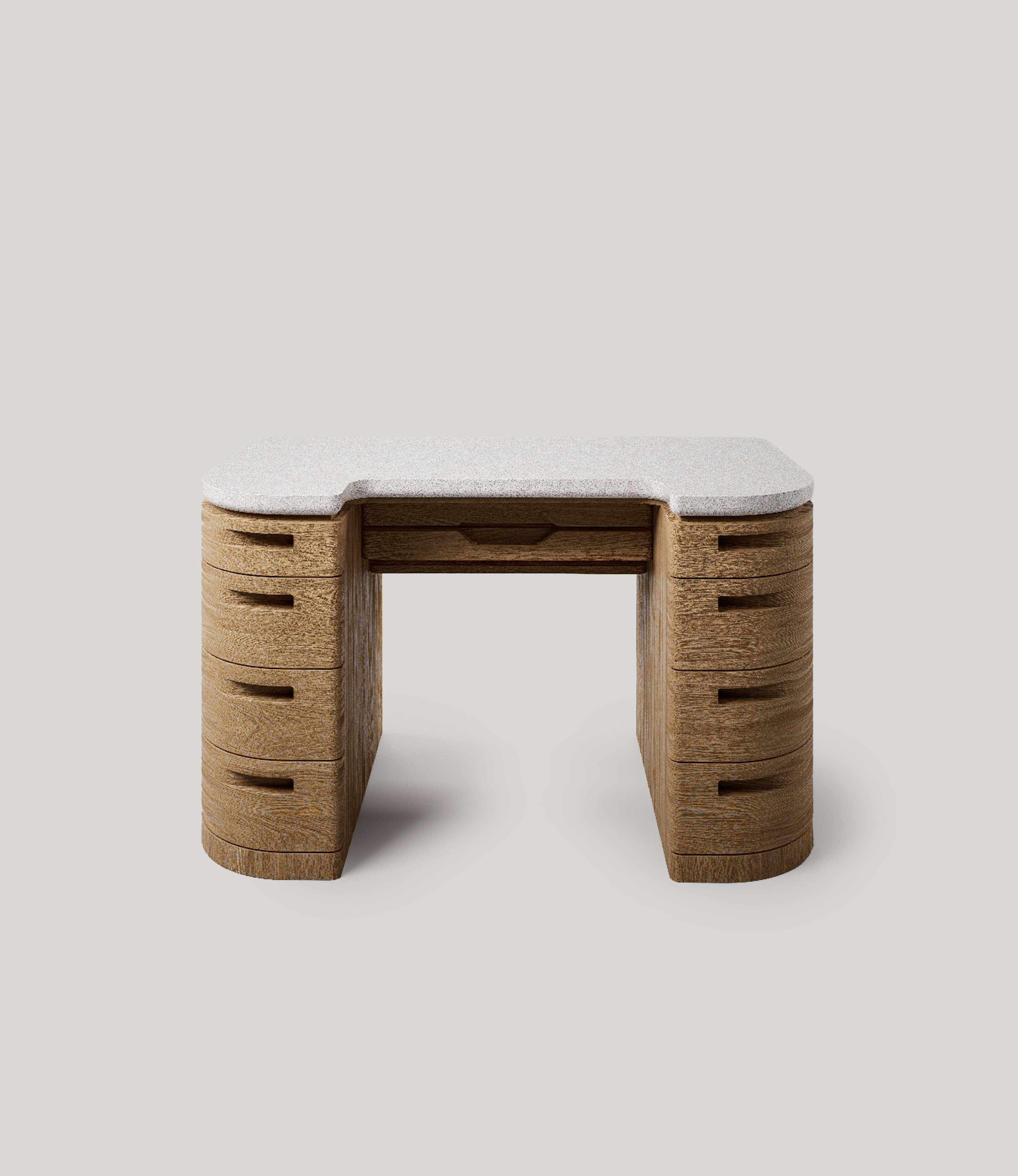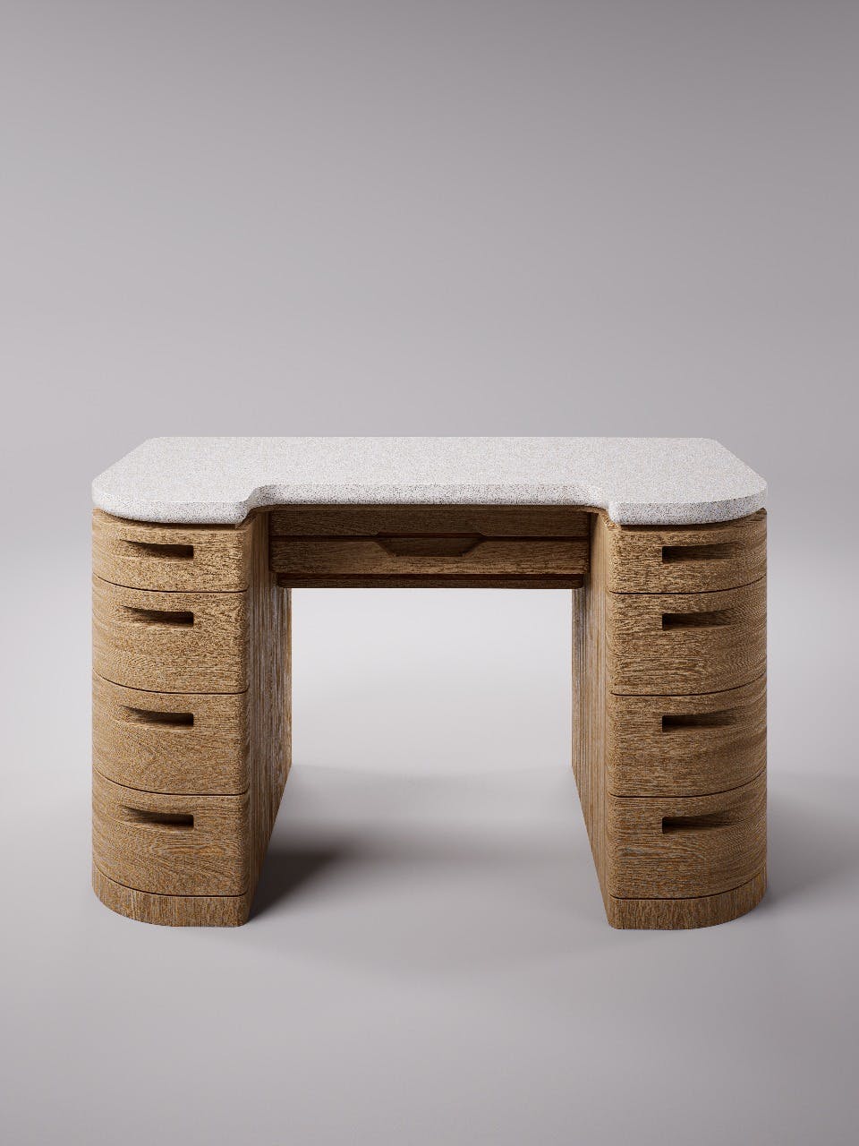 Desk pictured in natural oak with a lava stone full glazed crackled tabletop.