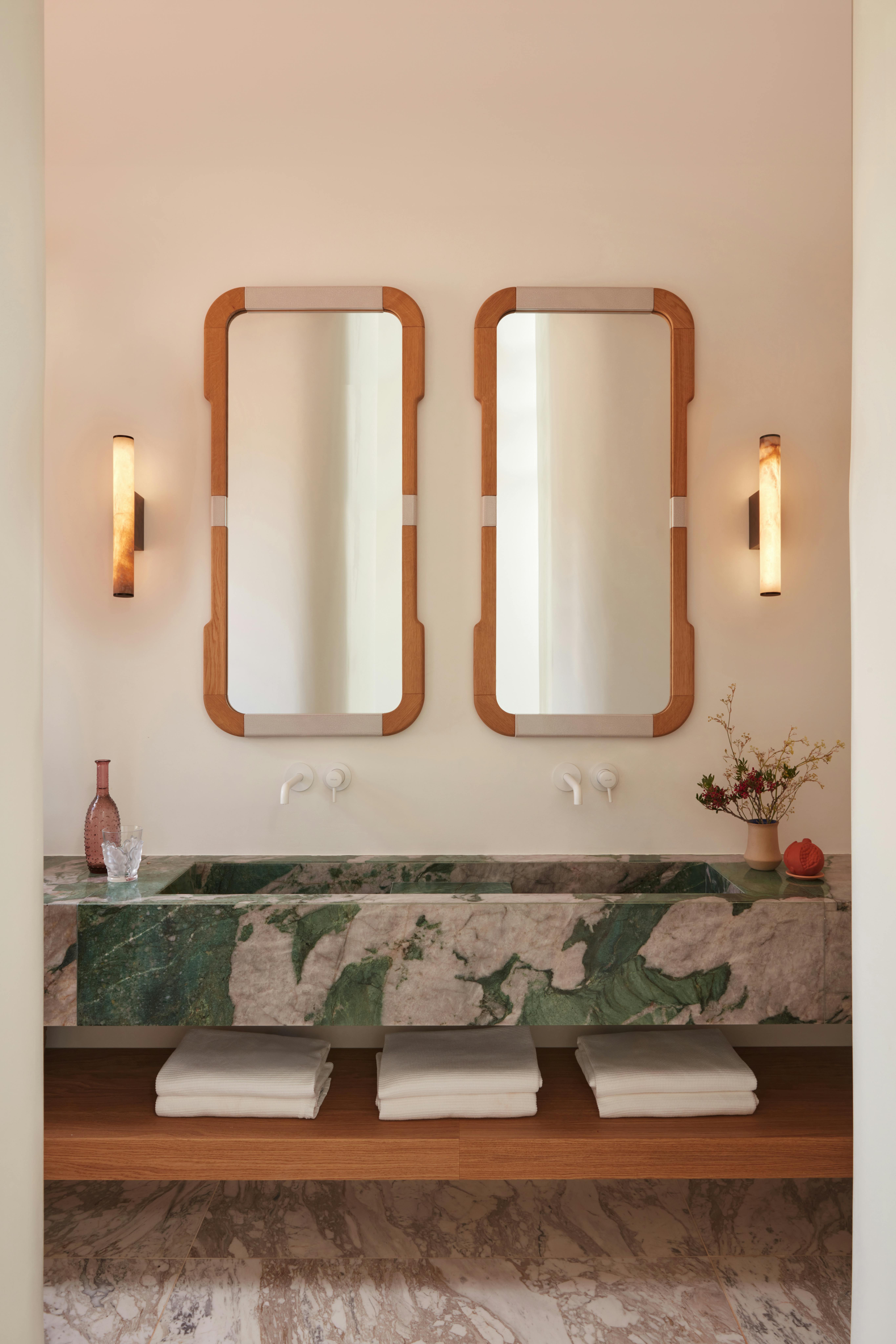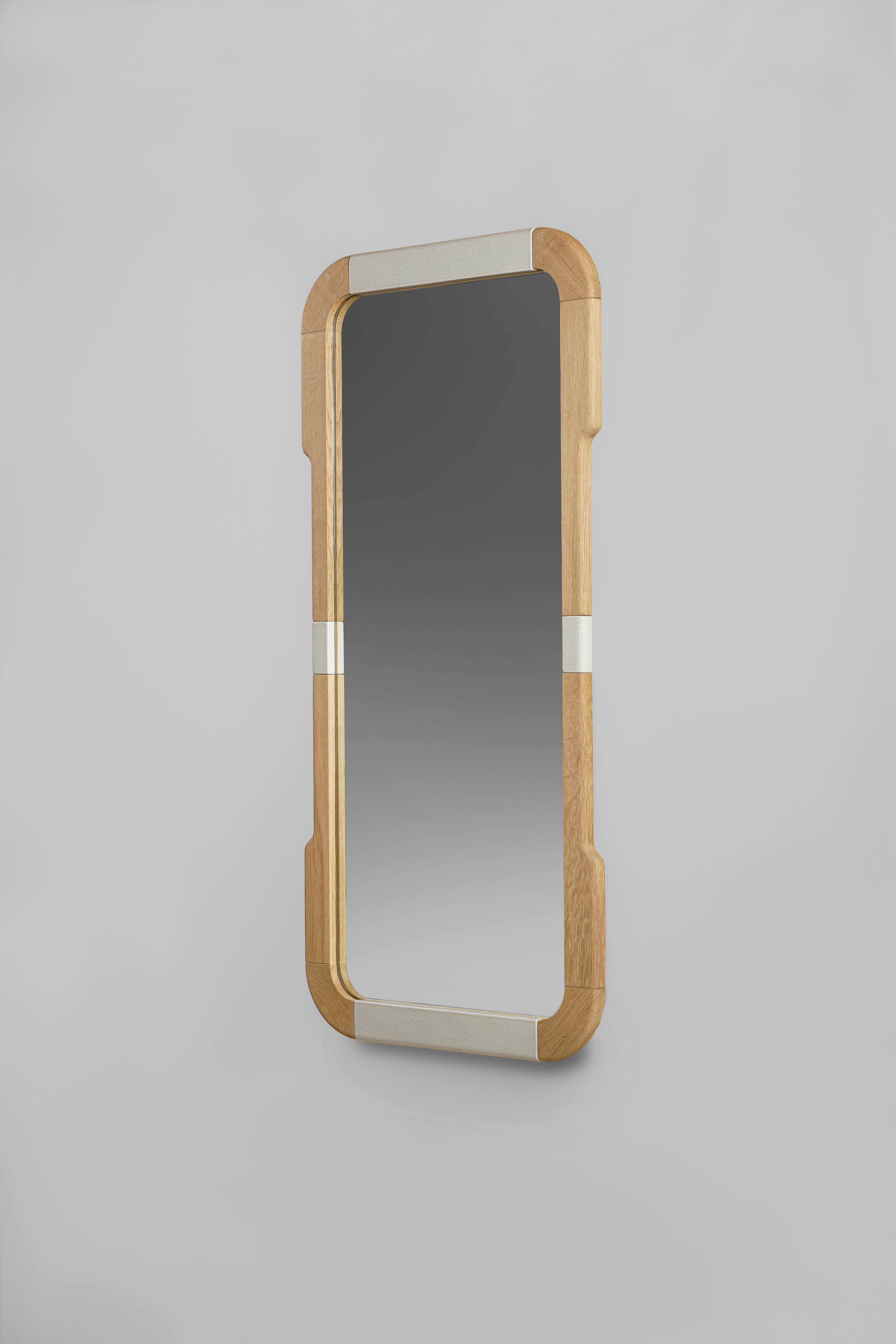 Mirror pictured in natural oak and white crackled lava stone.