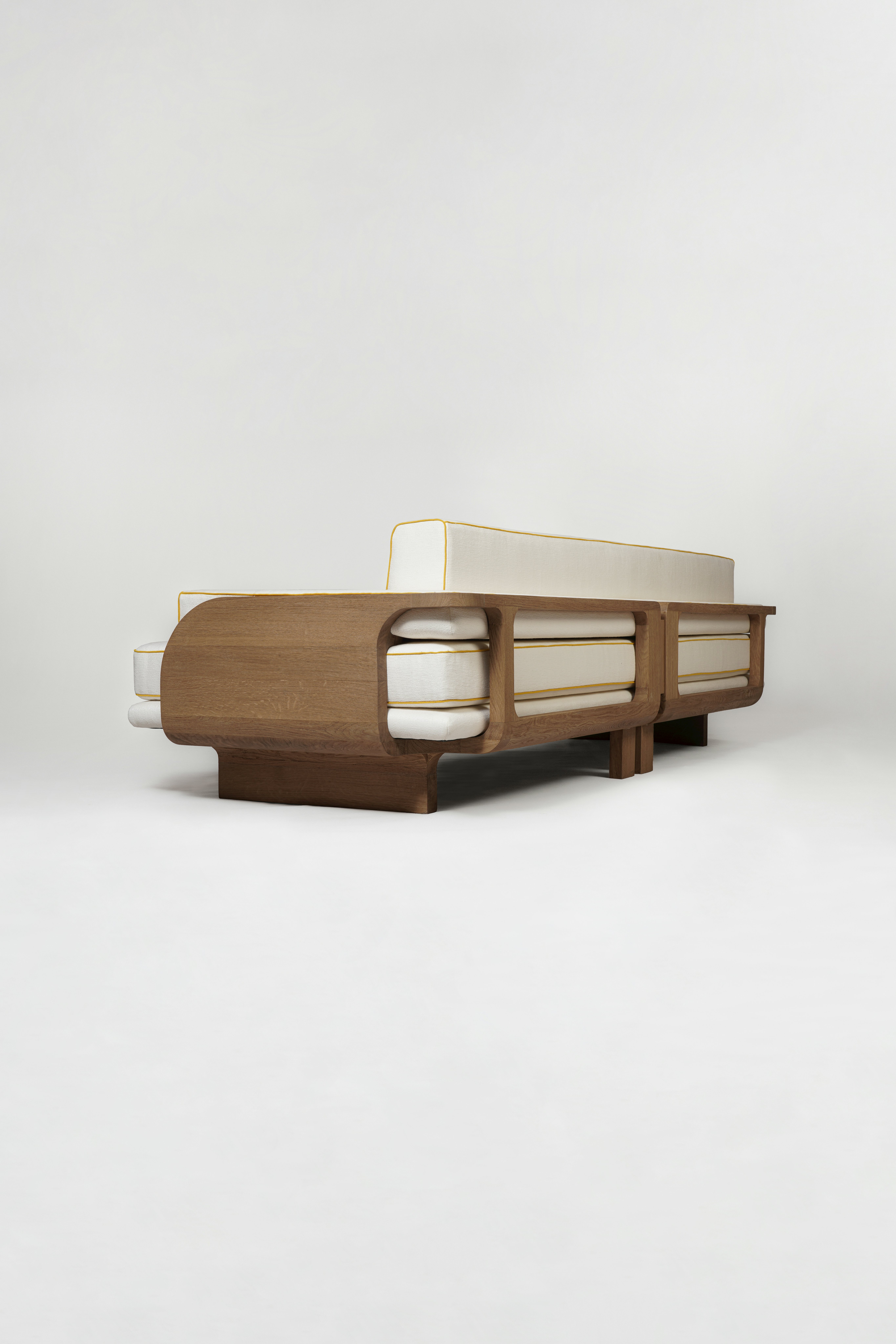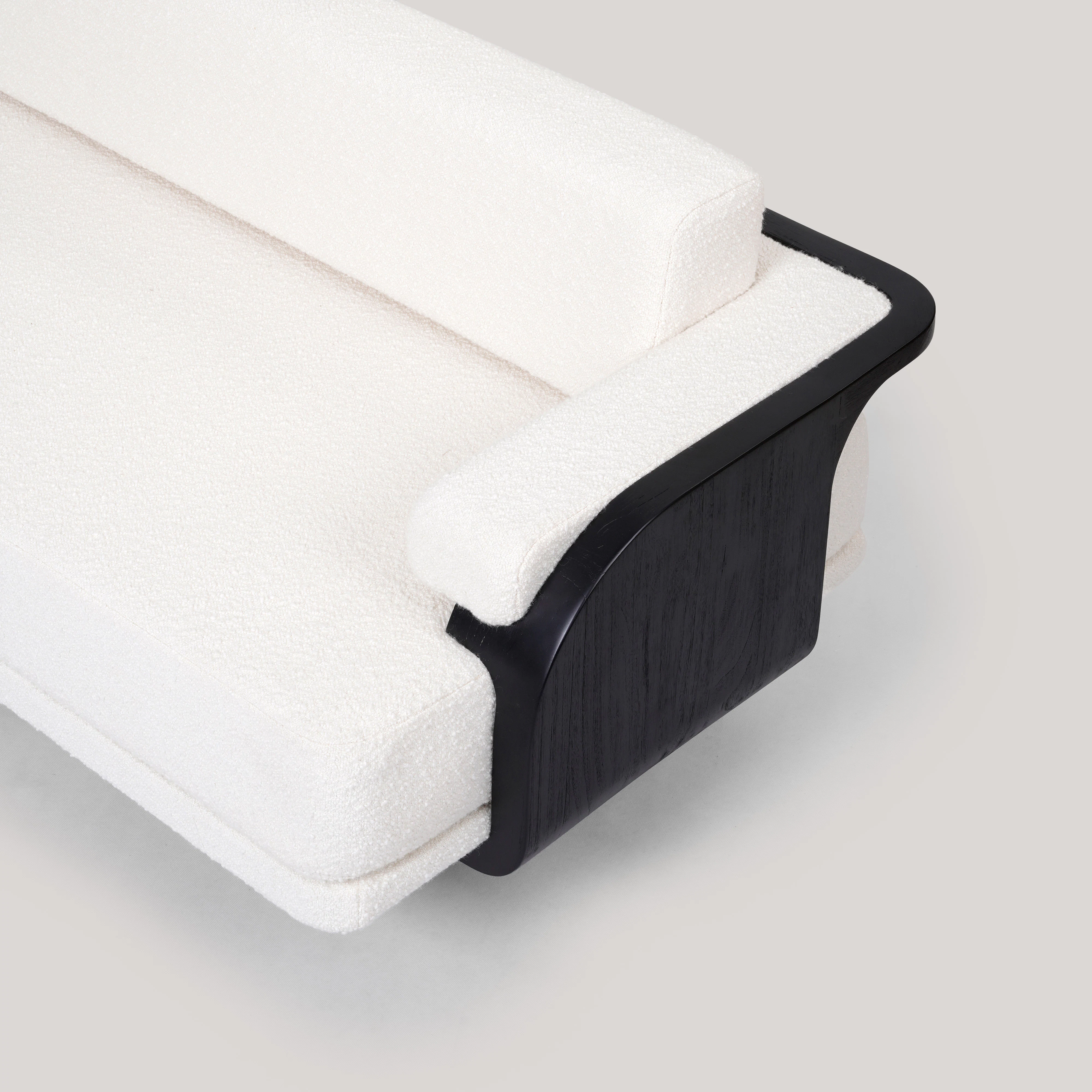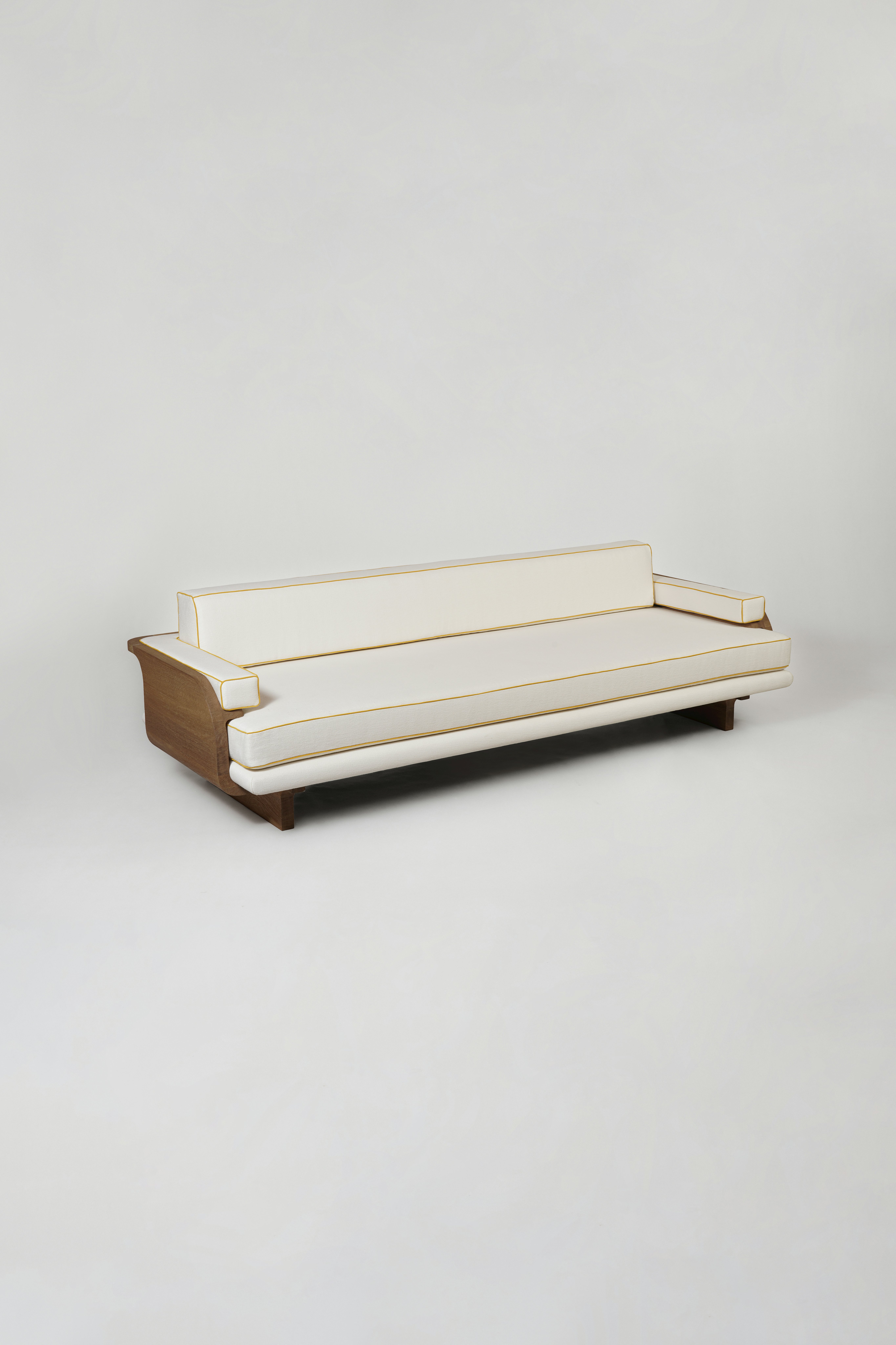 Sofa pictured in dark oak and upholstered with Finn heavyweight linen in White by Schumacher.