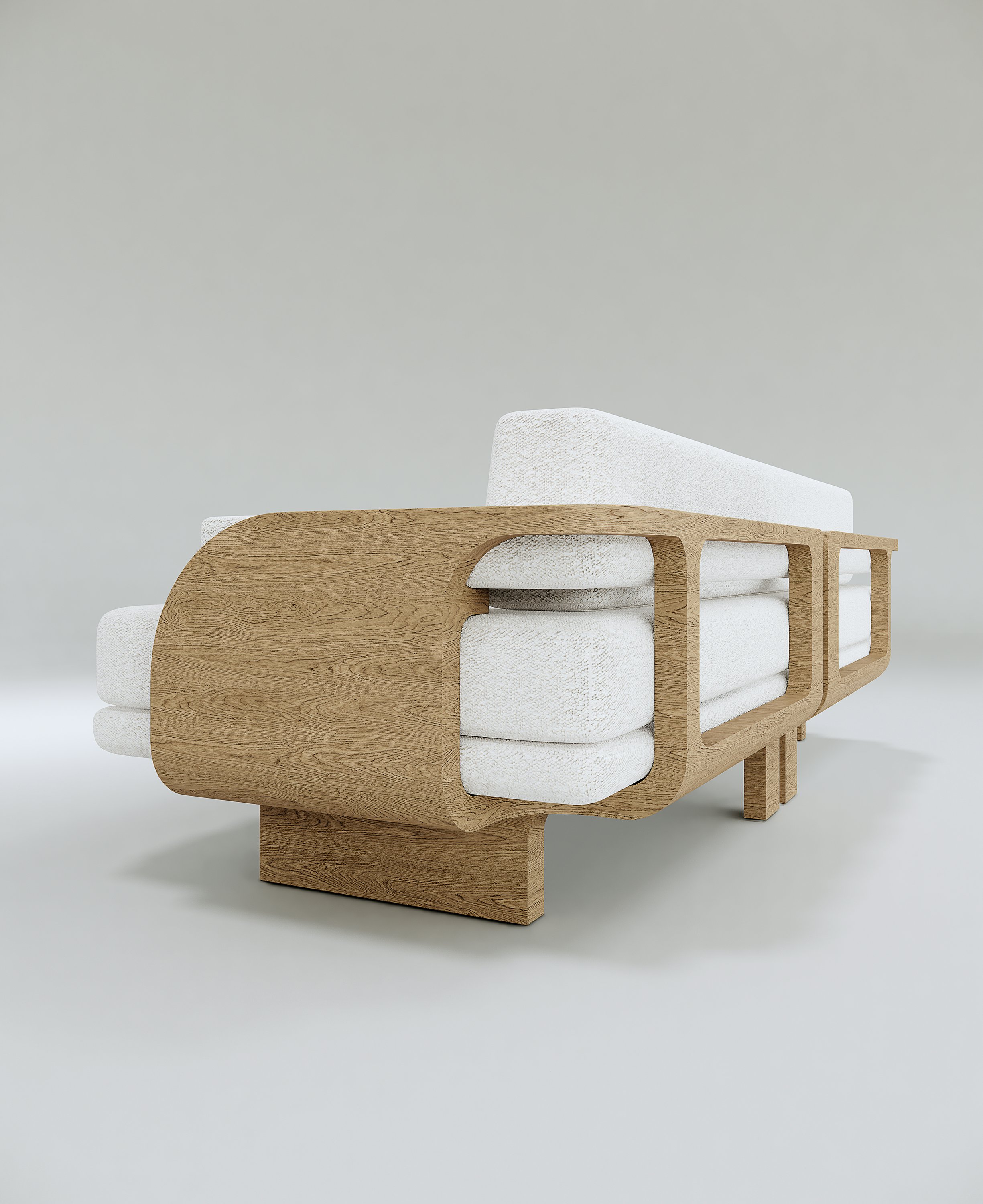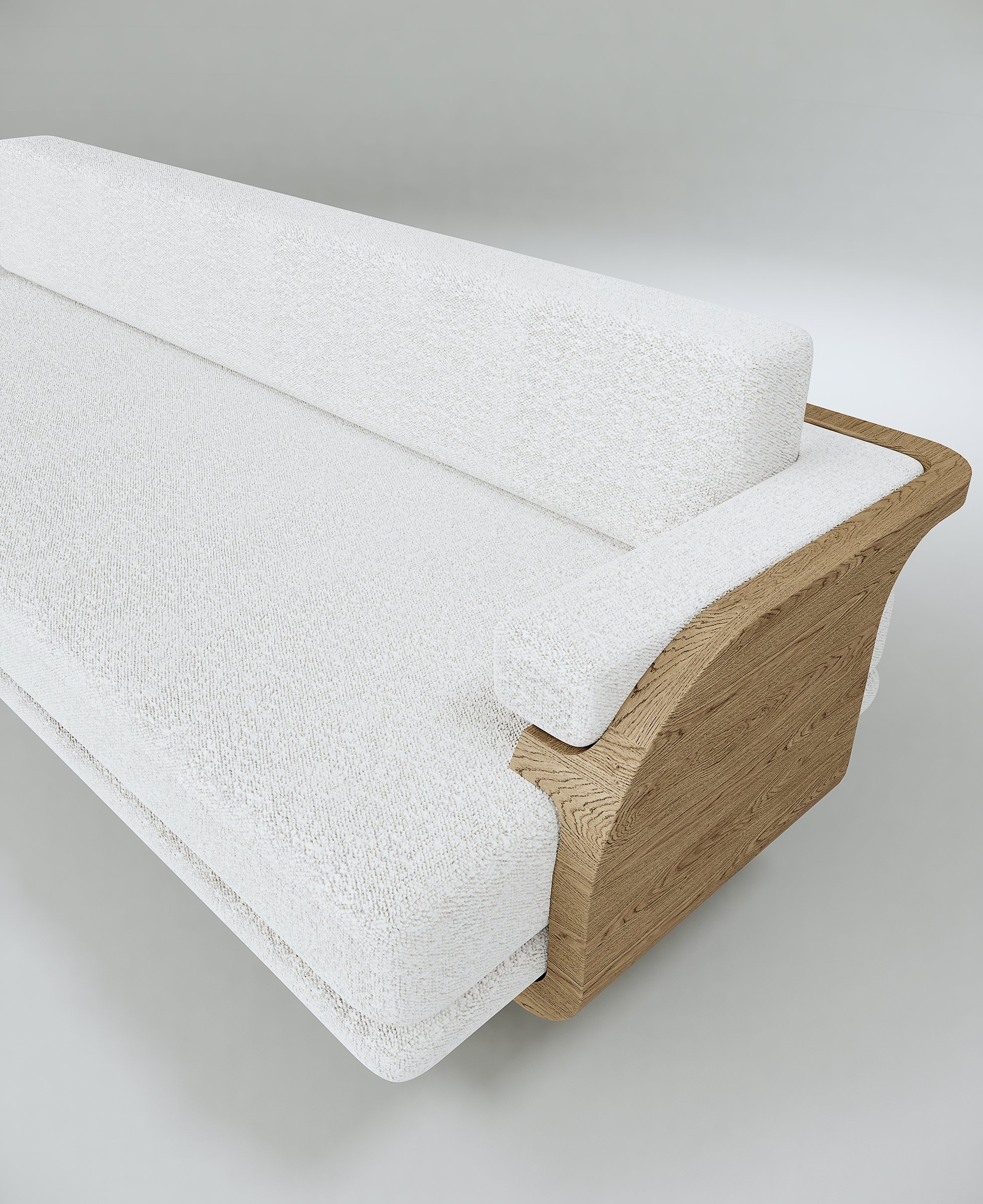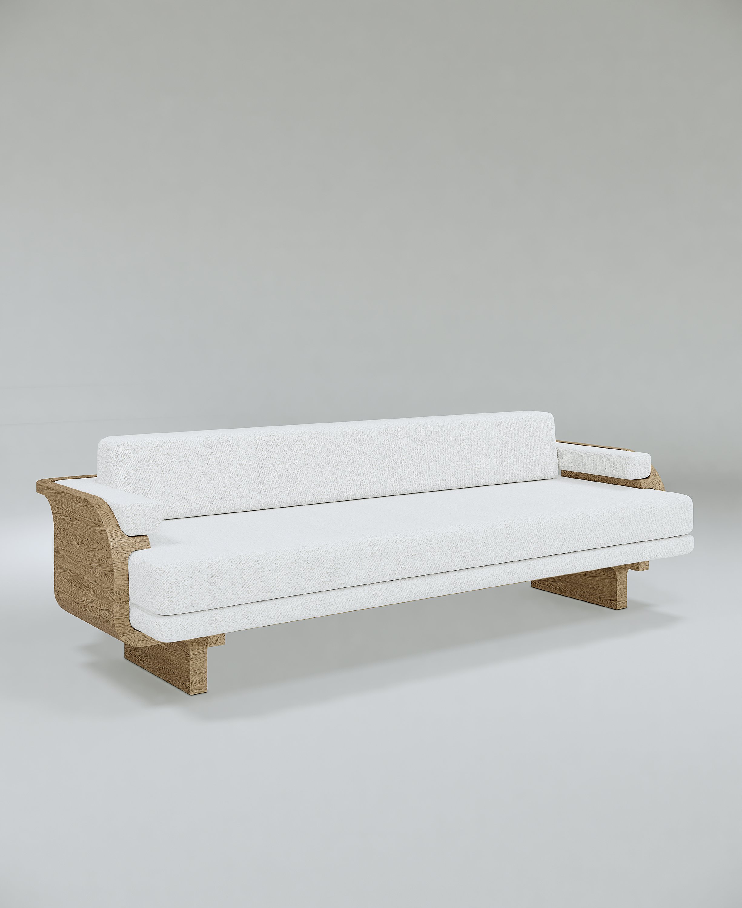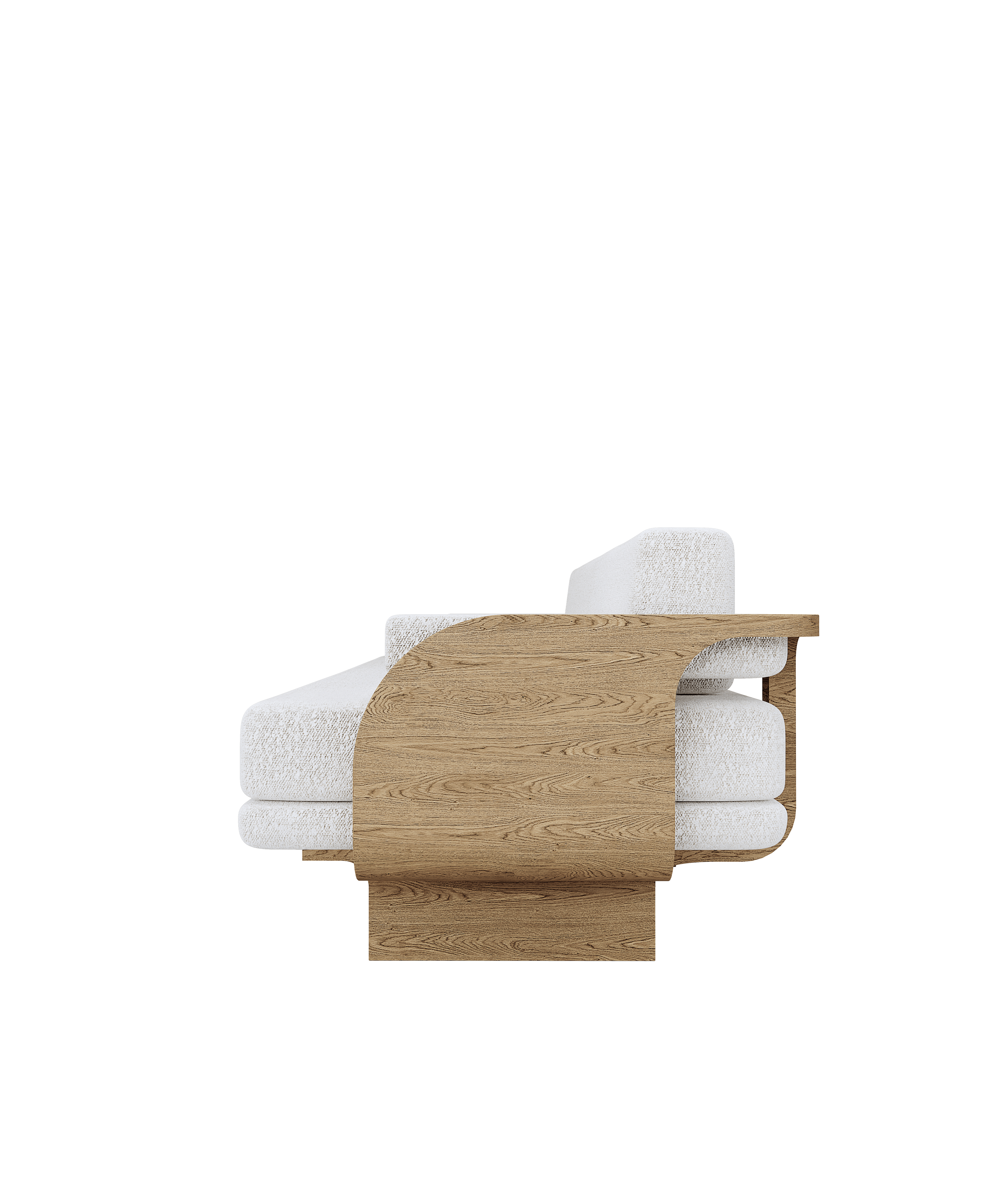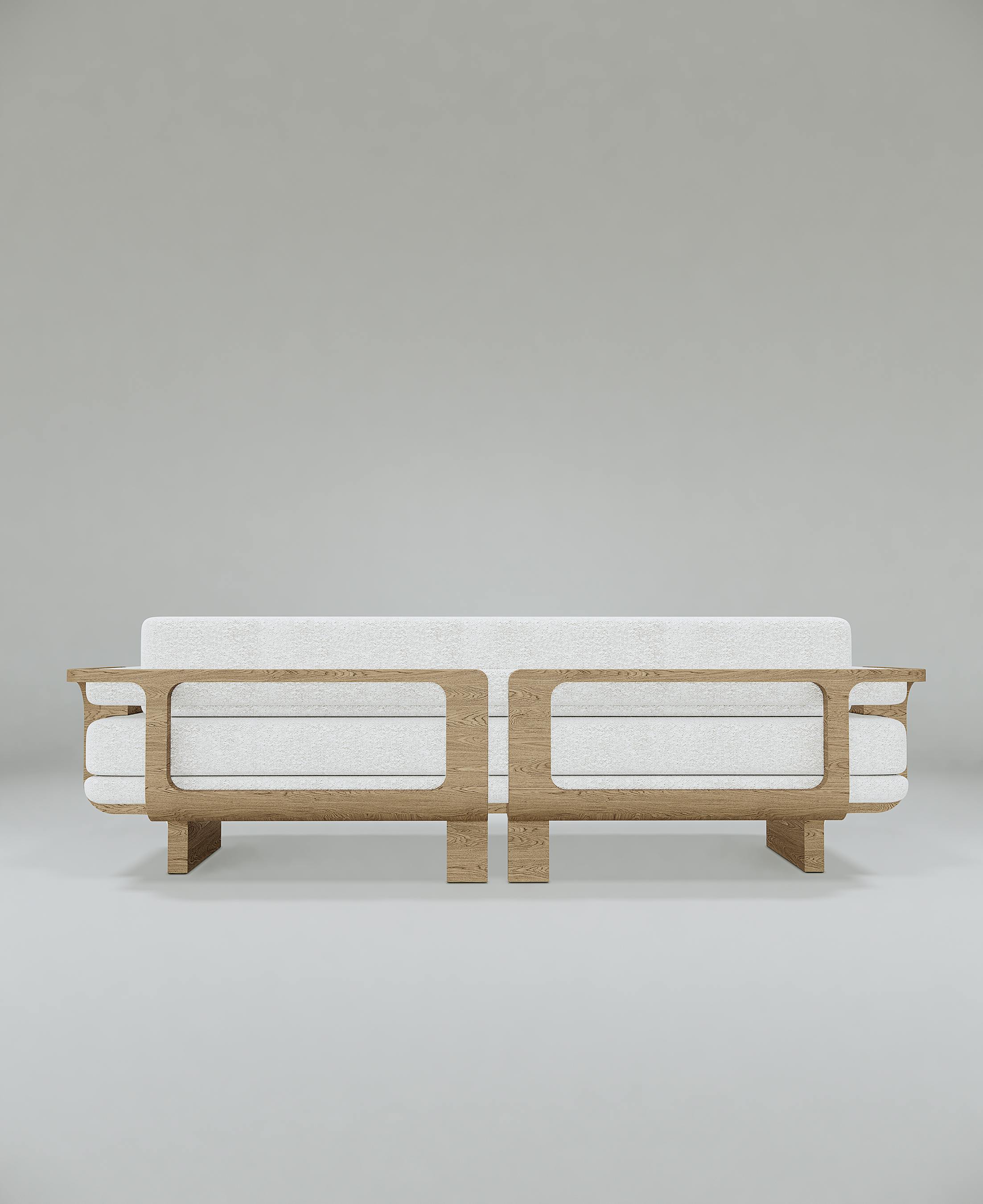 Bench pictured in European oak. The back and seat are upholstered with Finn Heavyweight Linen in Stone.