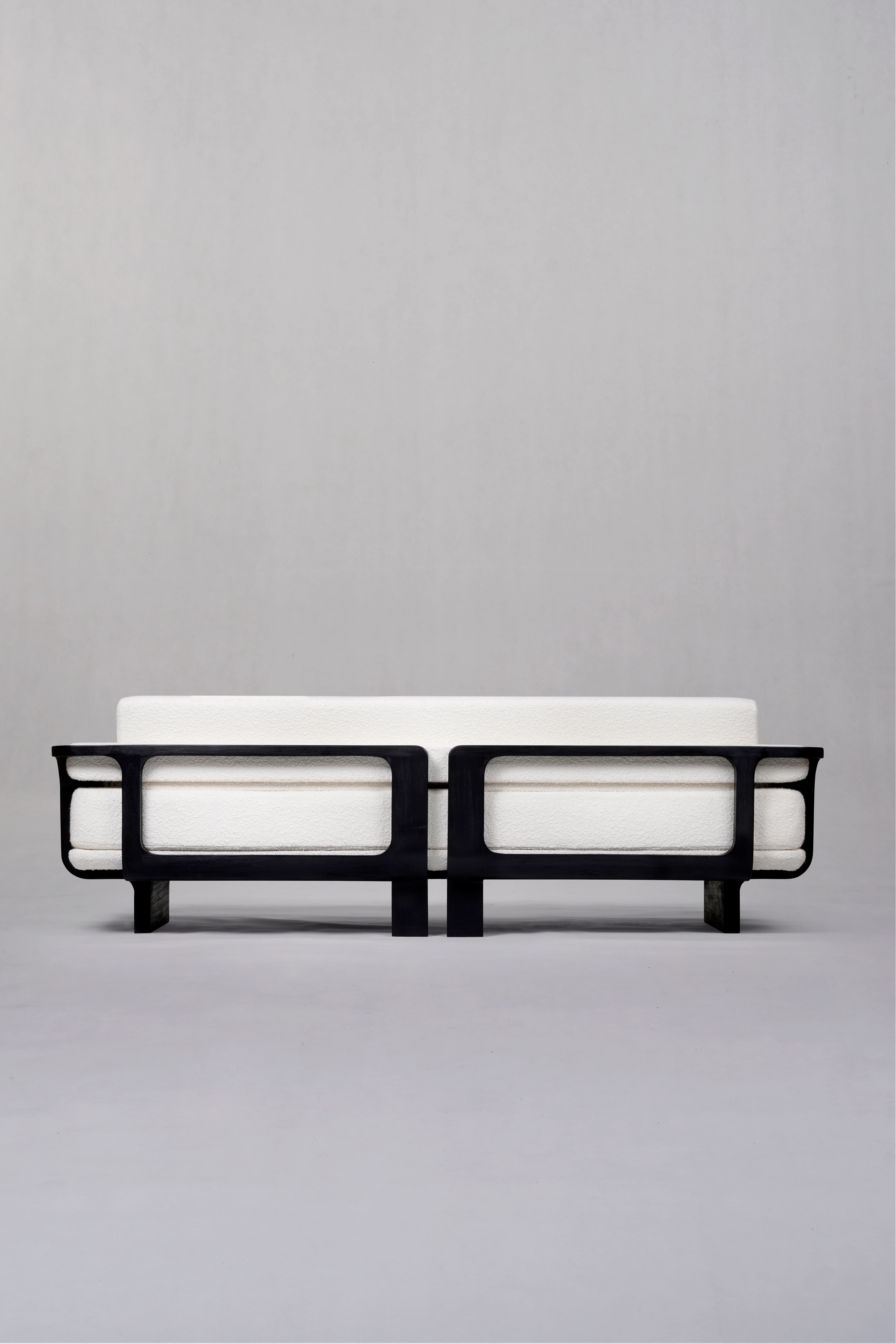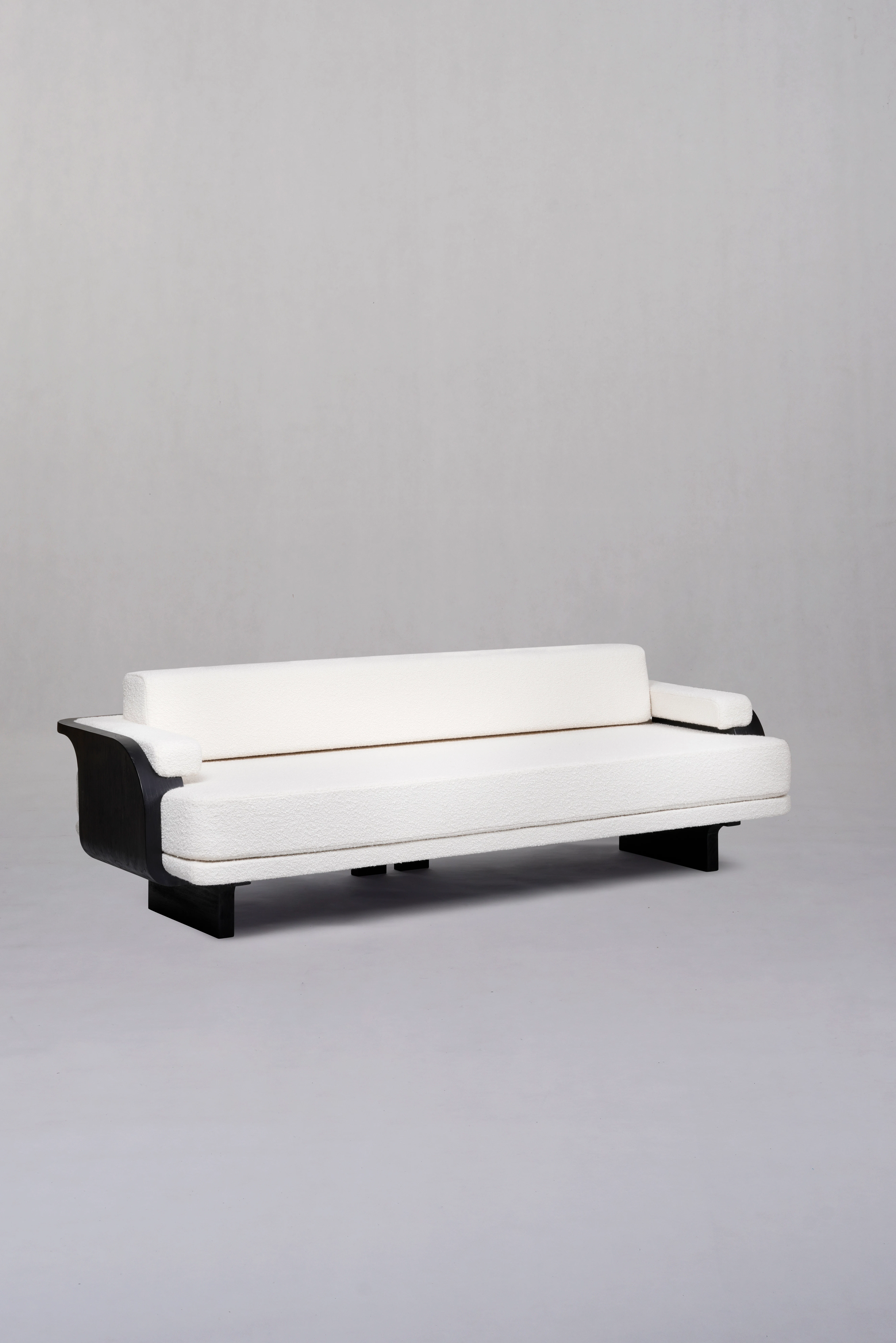 Sofa pictured in black teak and upholstered with Margarete Boucle Ivory by Schumacher.