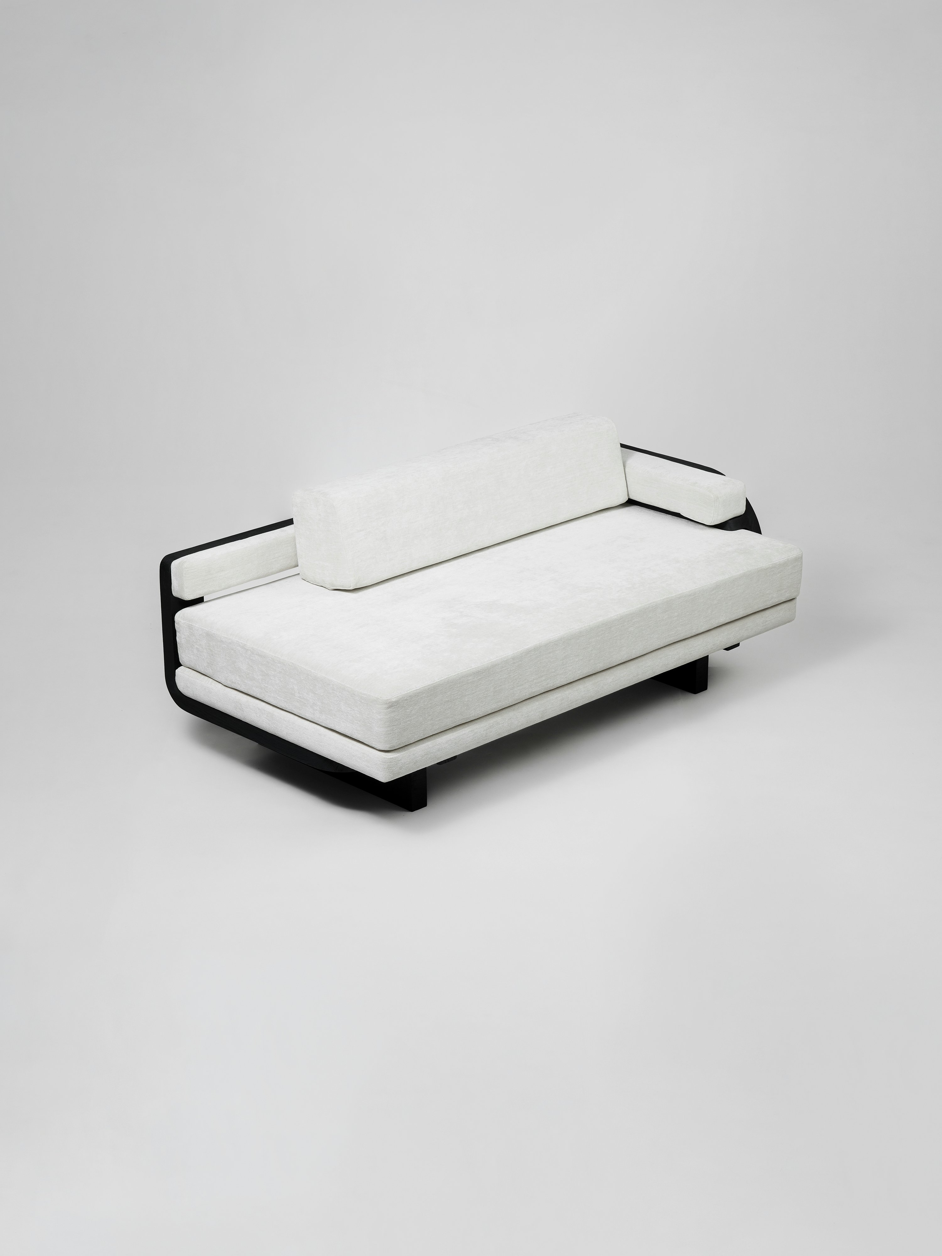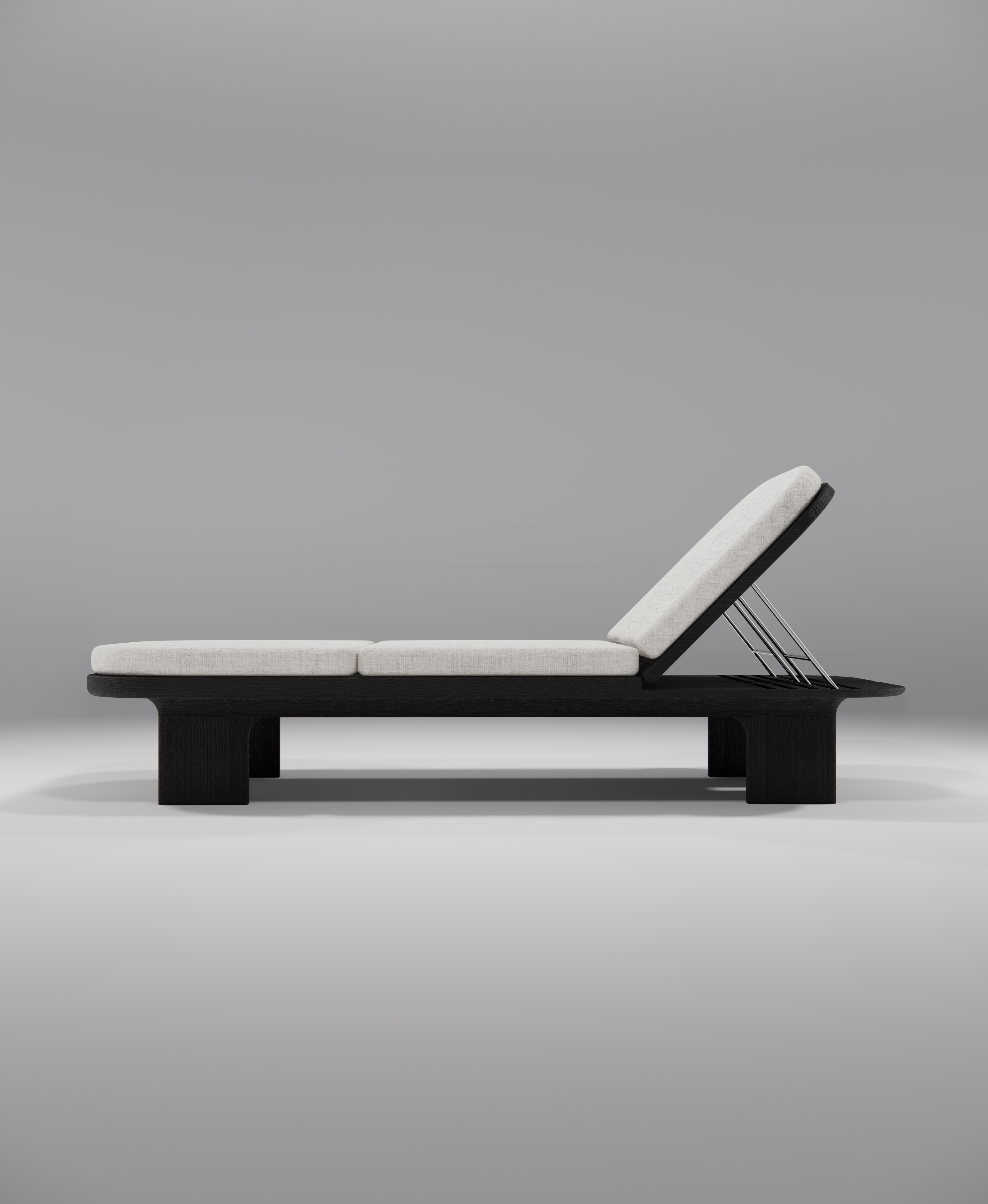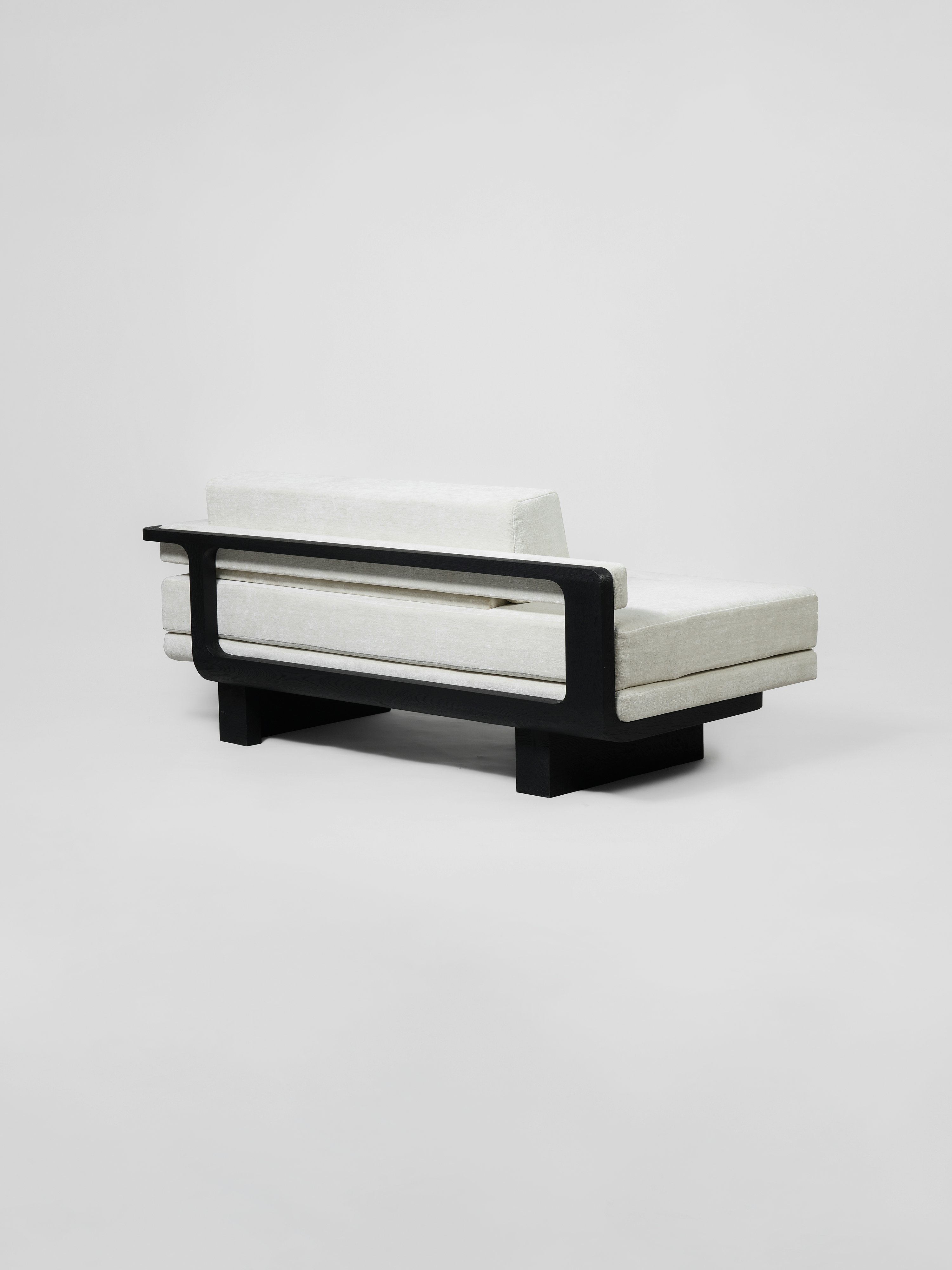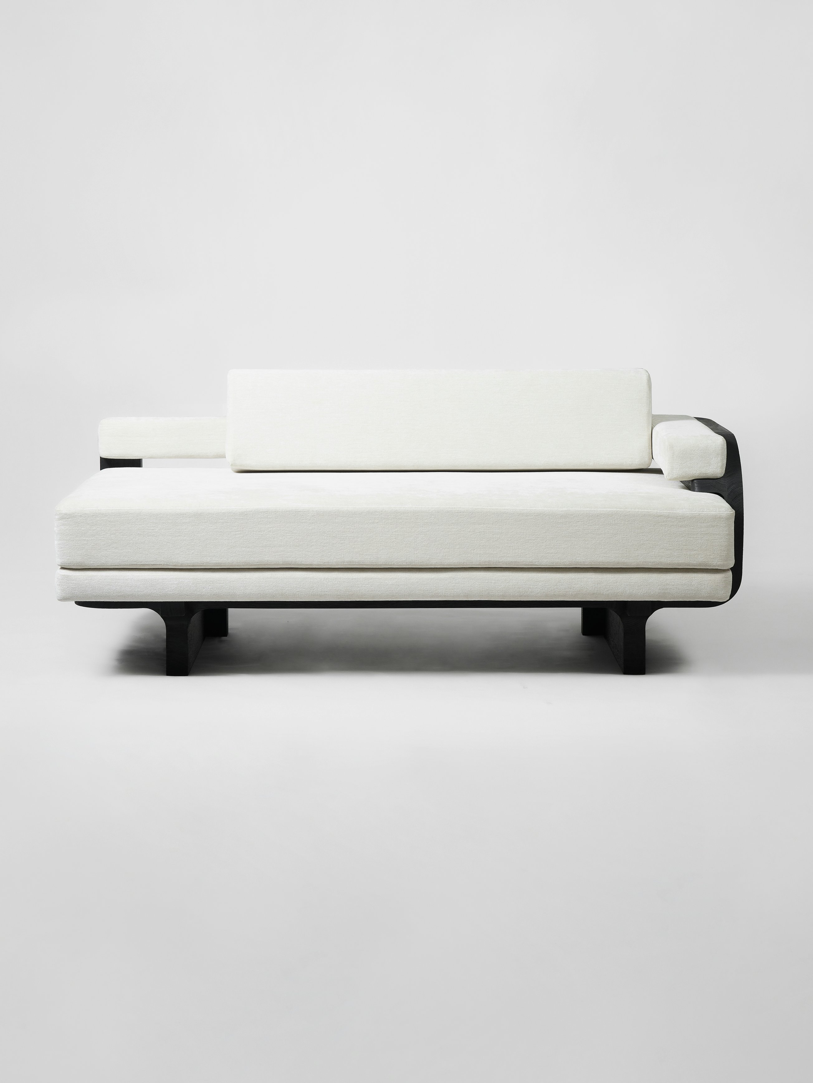 Bench pictured in black teak upholstered with Margarete Boucle Ivory by Schumacher.