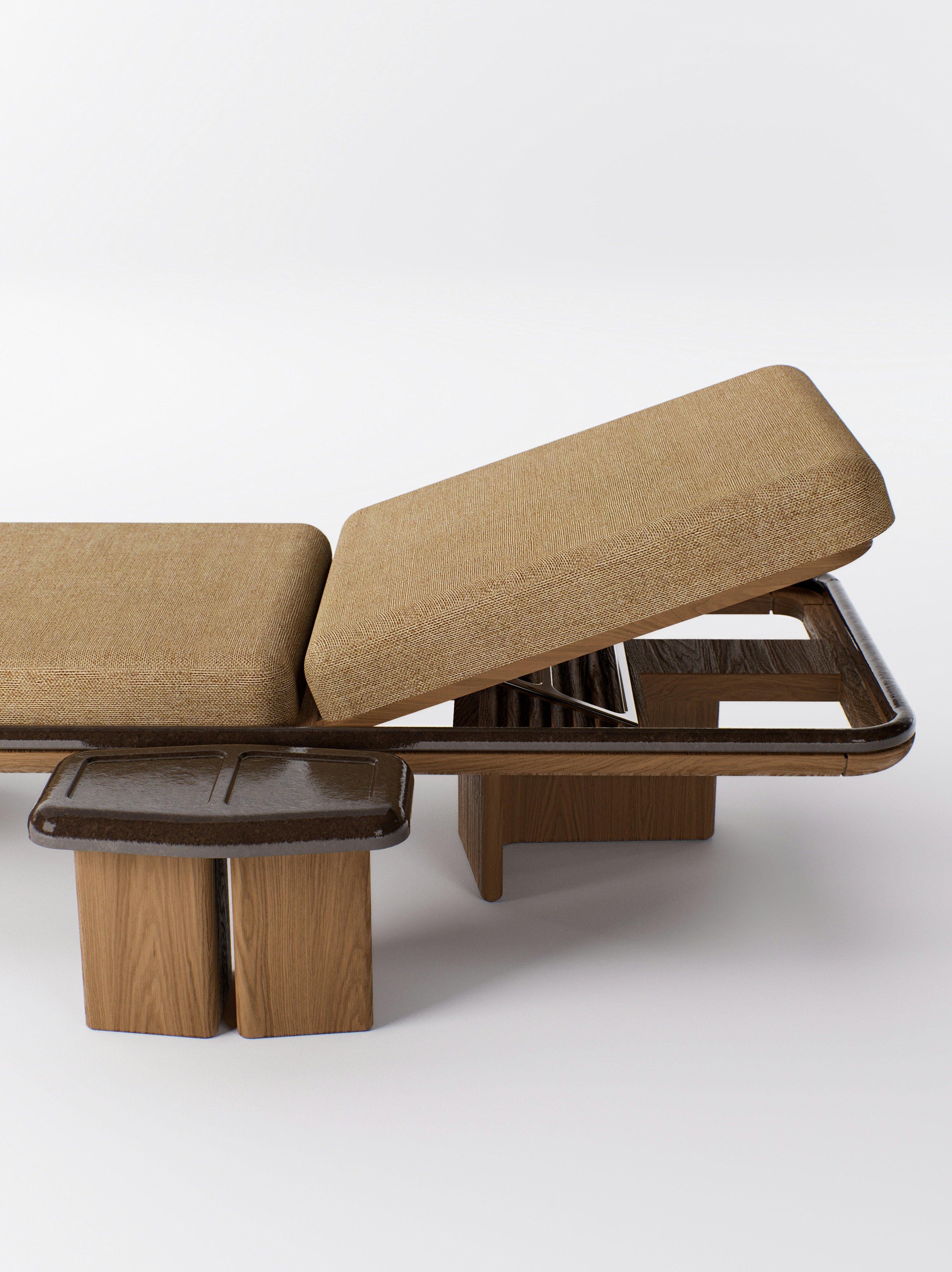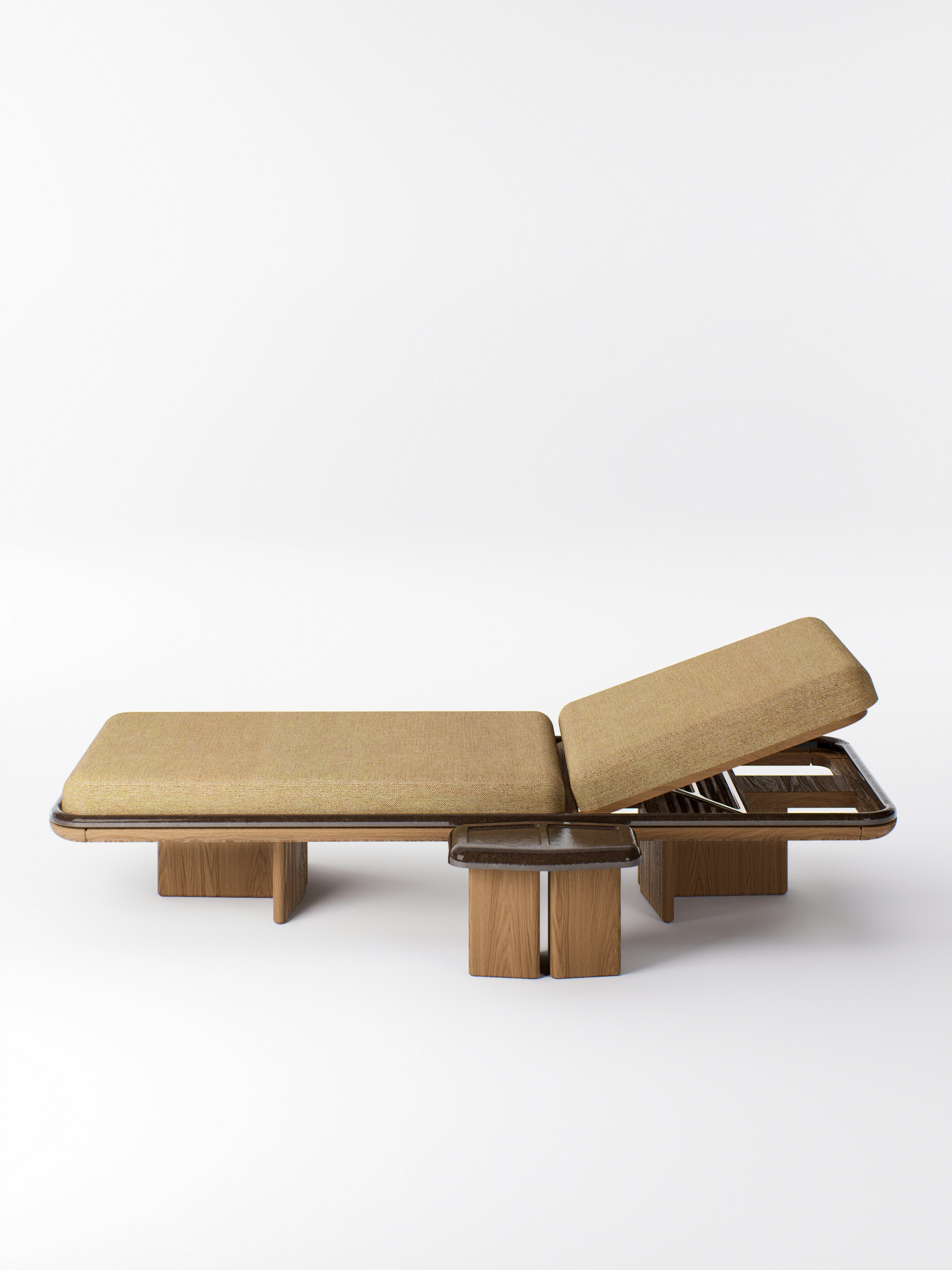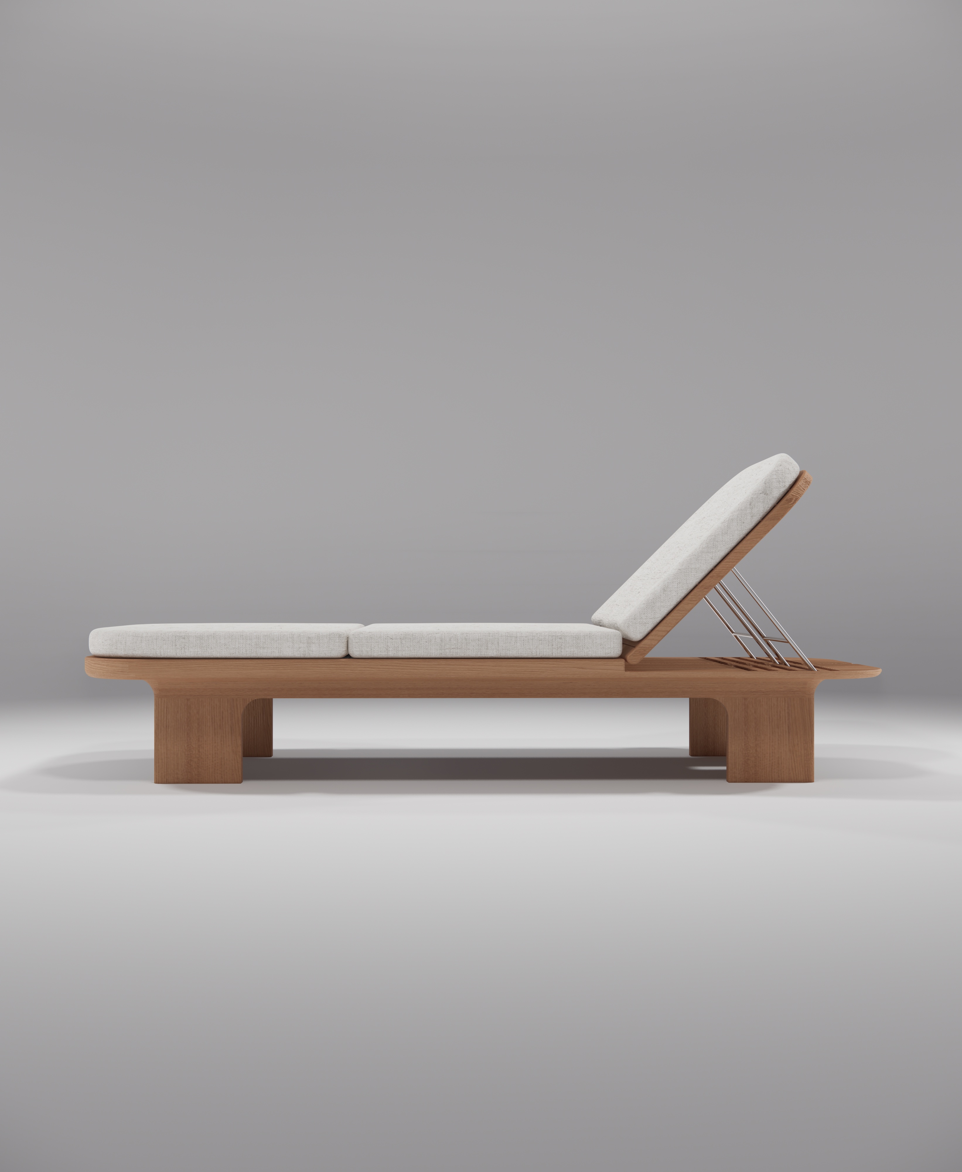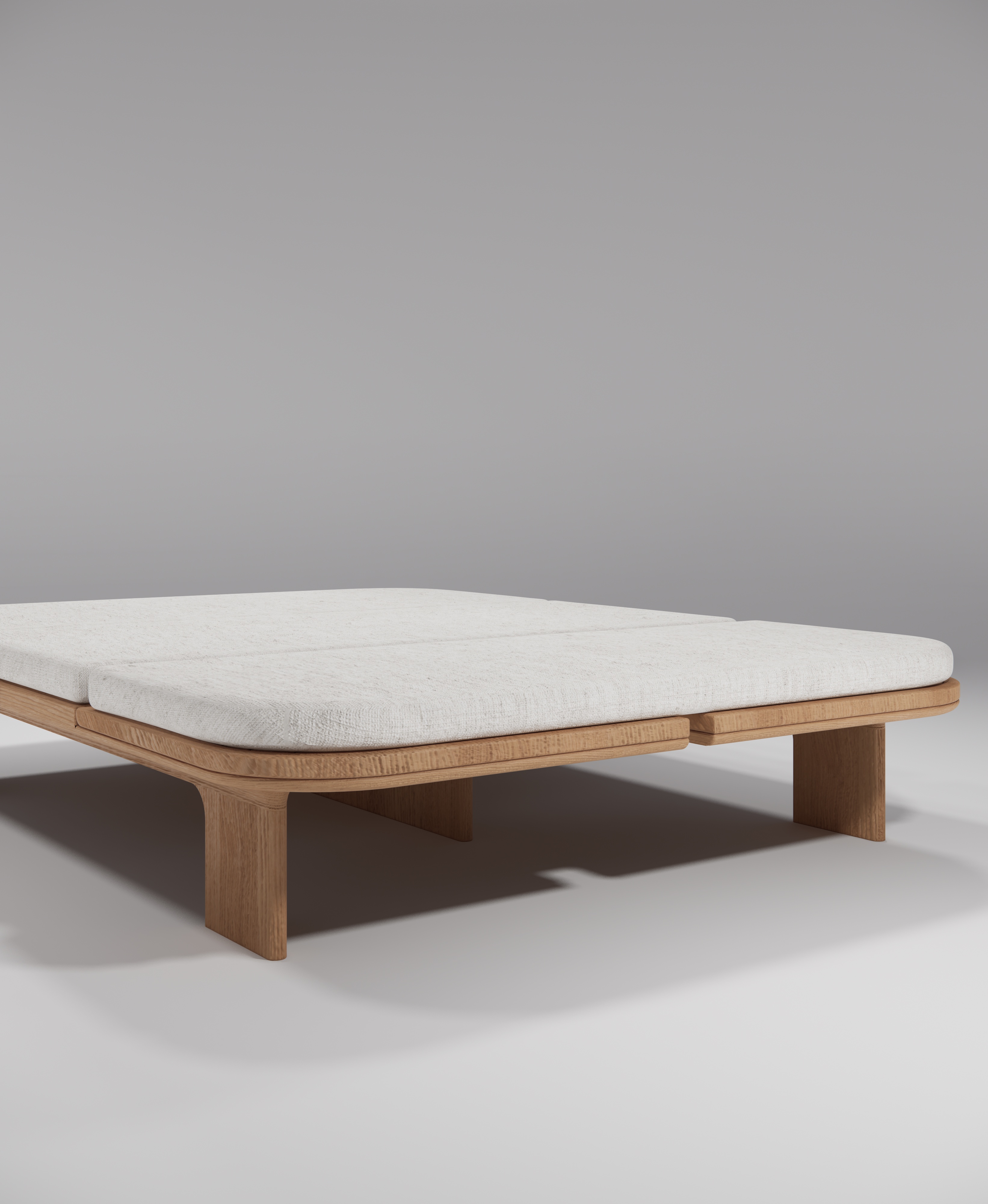 Bench pictured in black teak upholstered with Margarete Boucle Ivory by Schumacher.