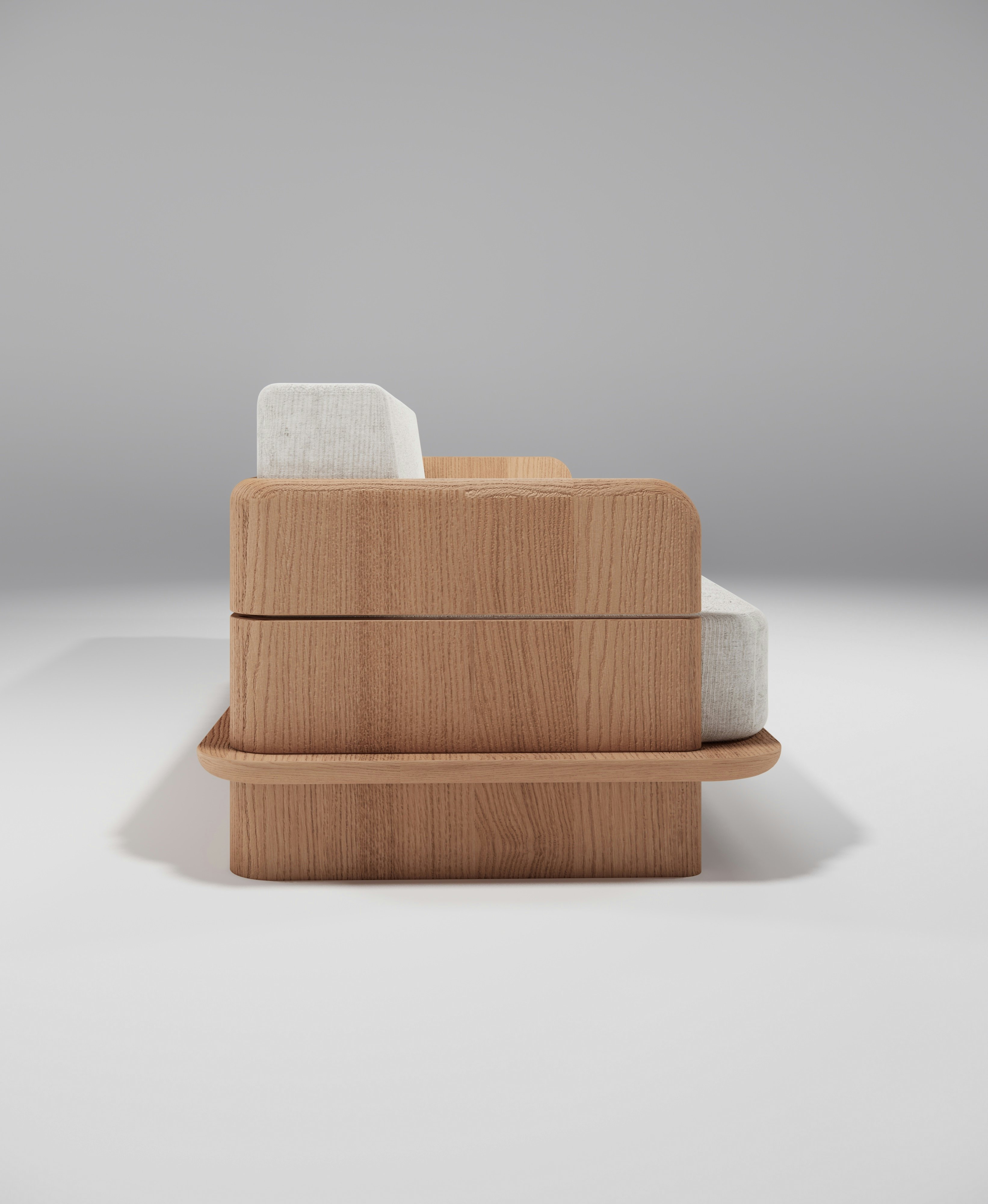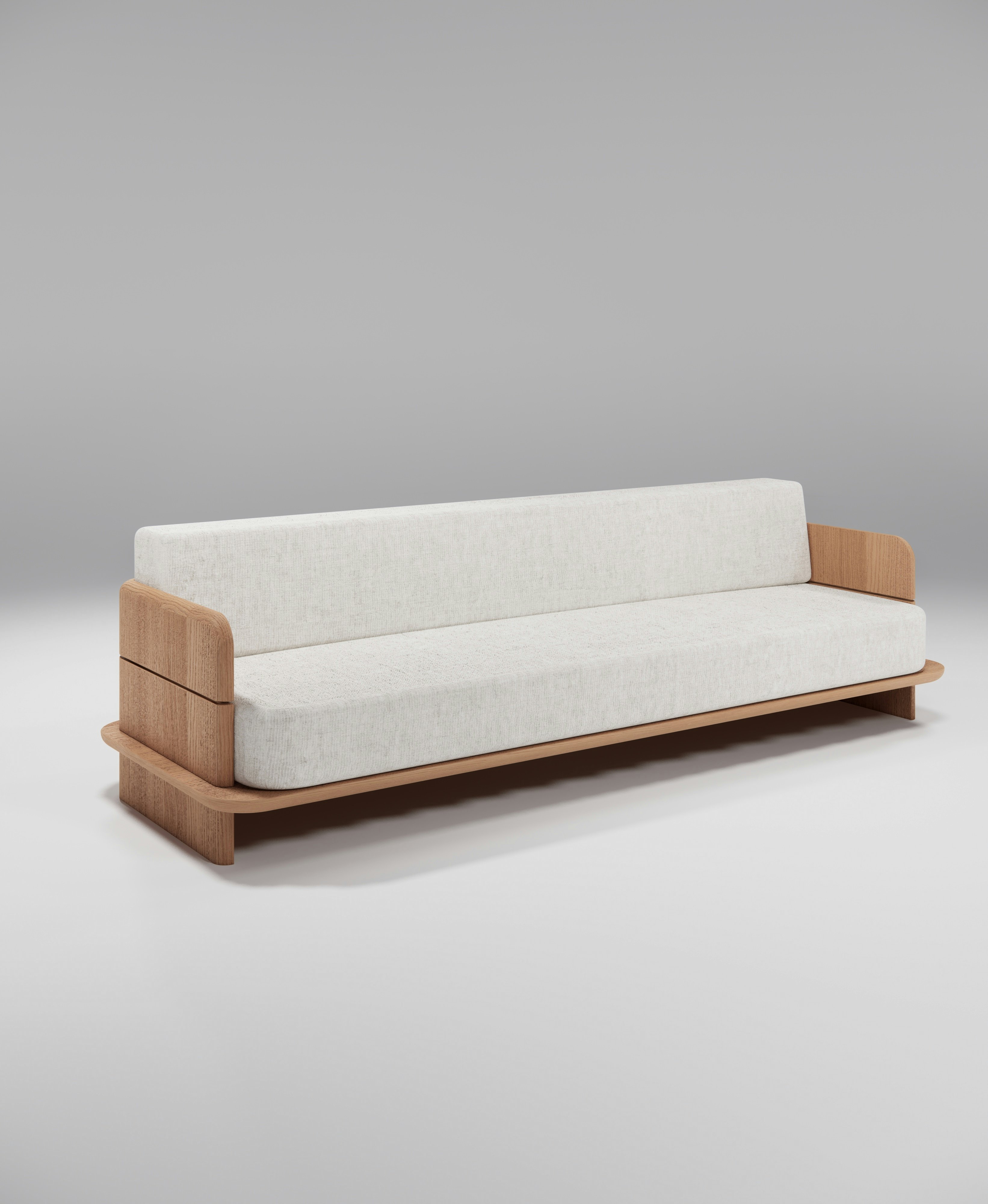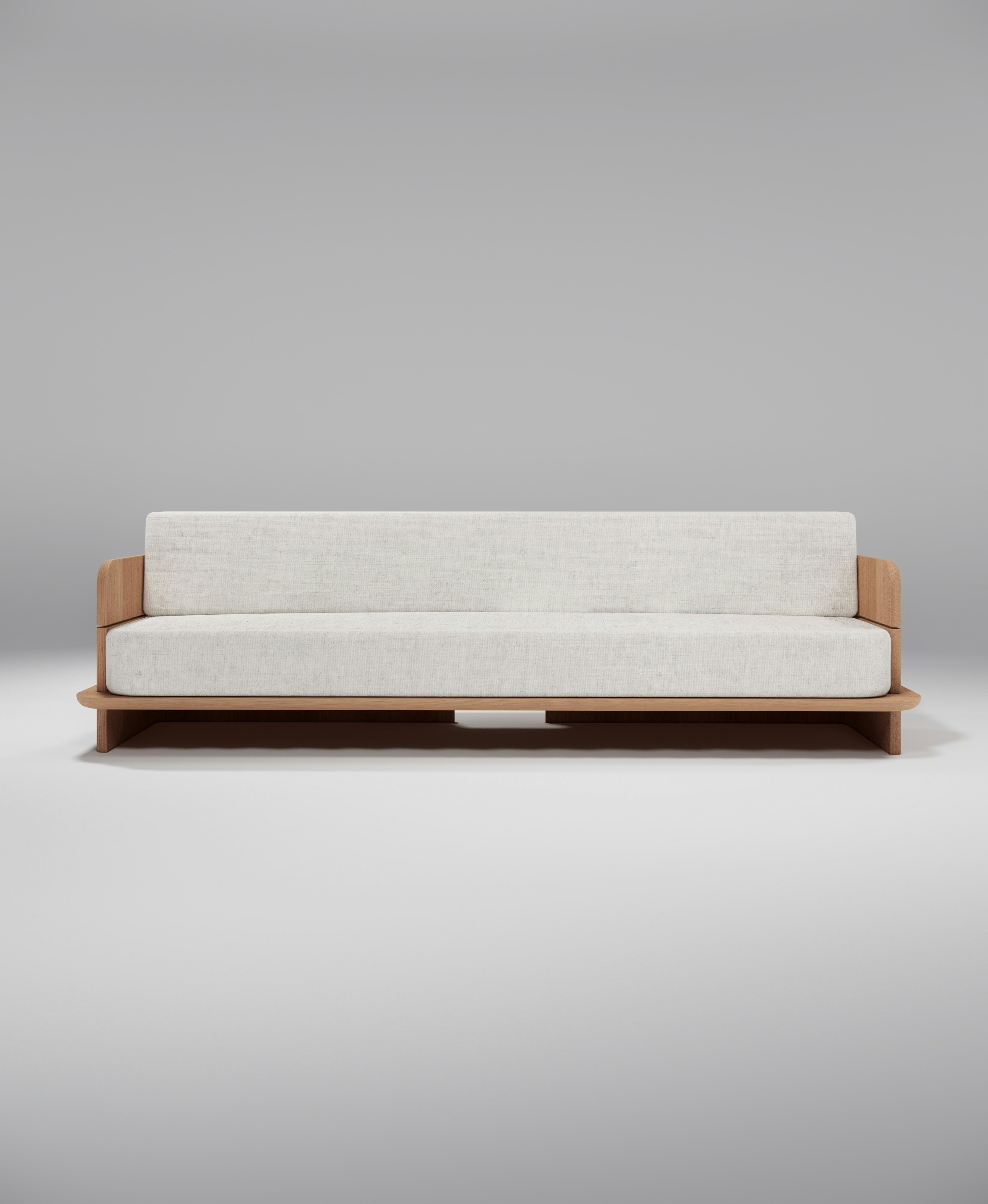 Sofa pictured in natural oak and upholstered with Finn heavyweight linen by Schumacher.