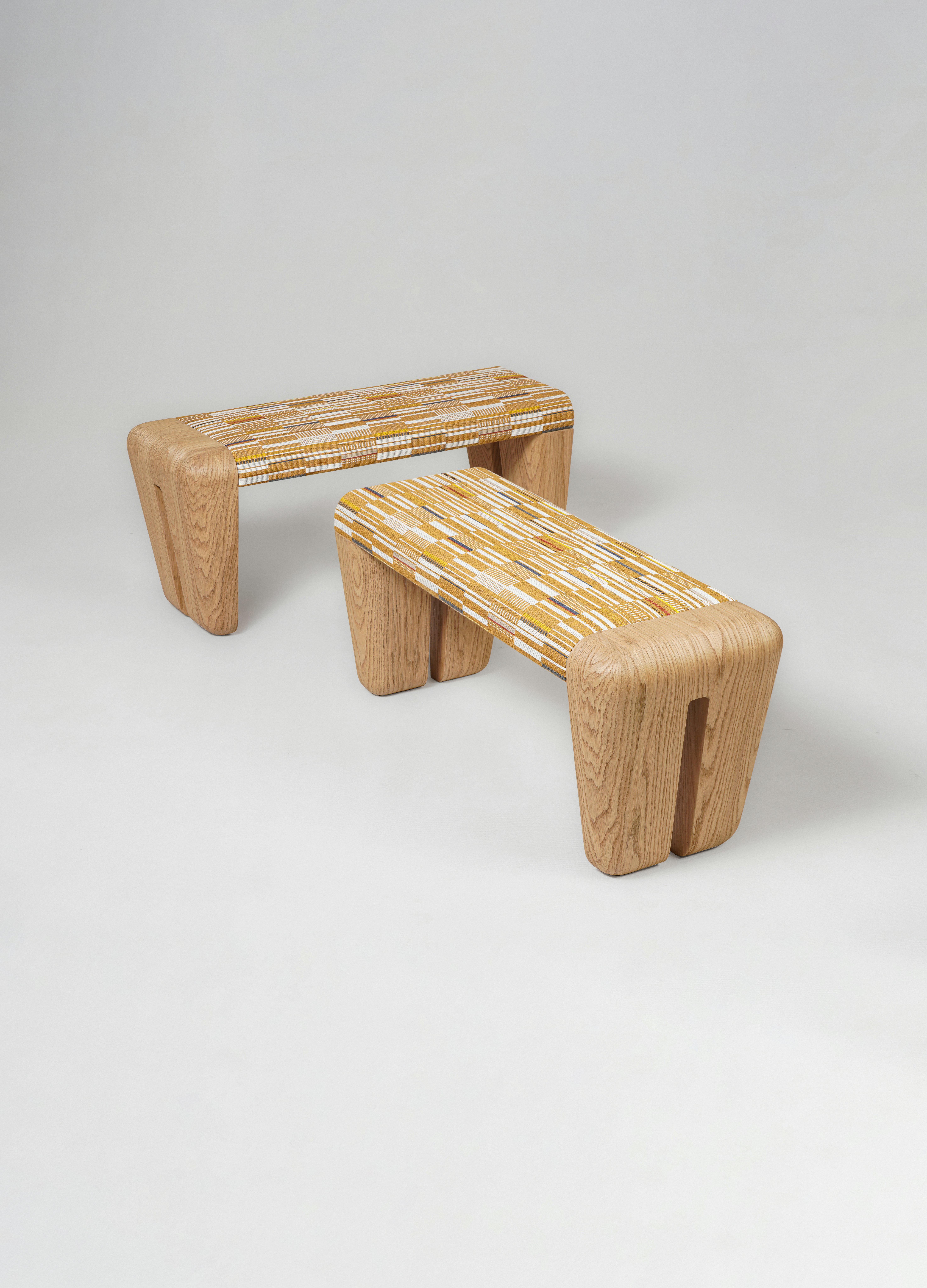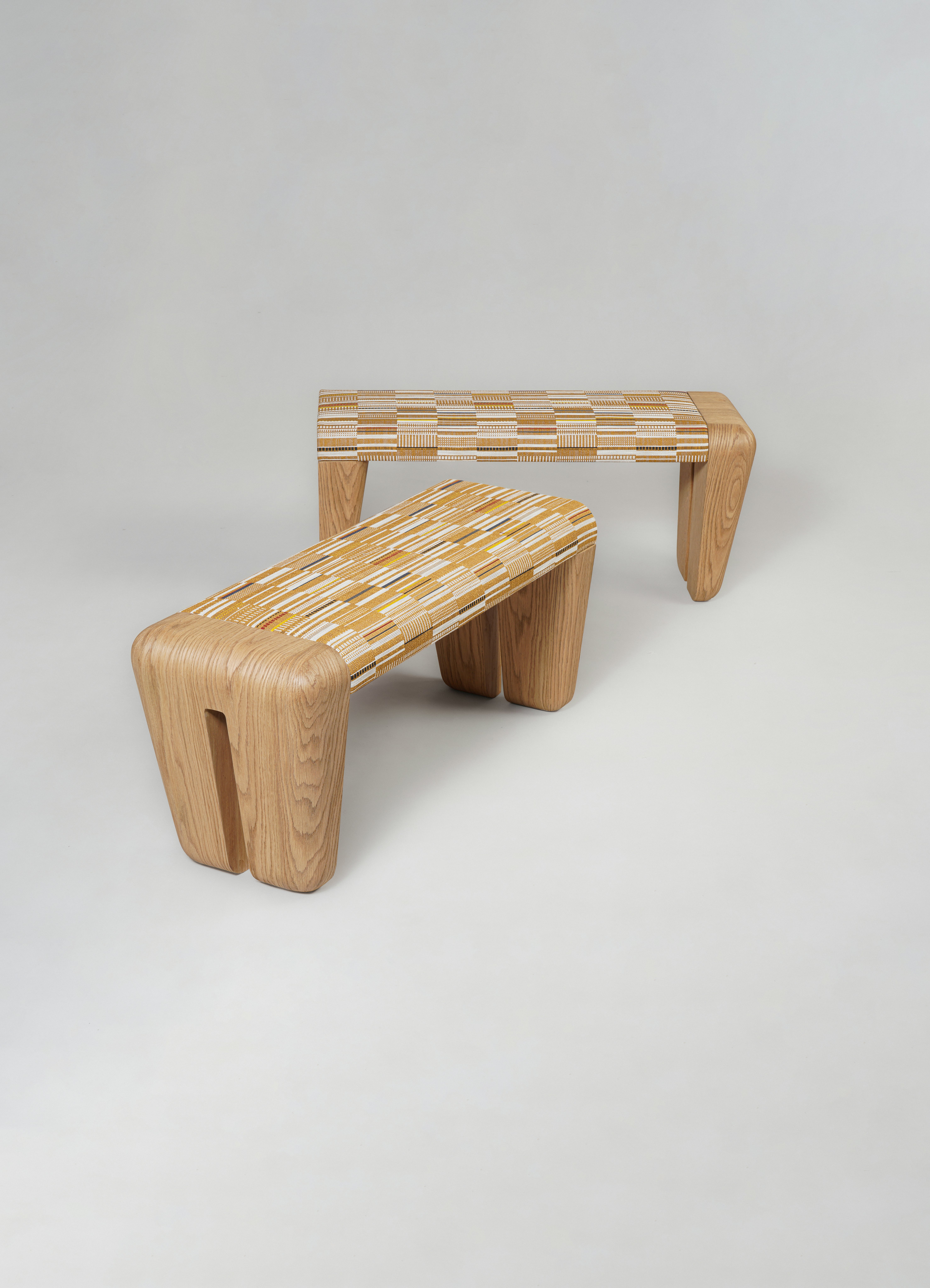 Pair of benches pictured in natural oak and upholstered with Parade by Pollack.
