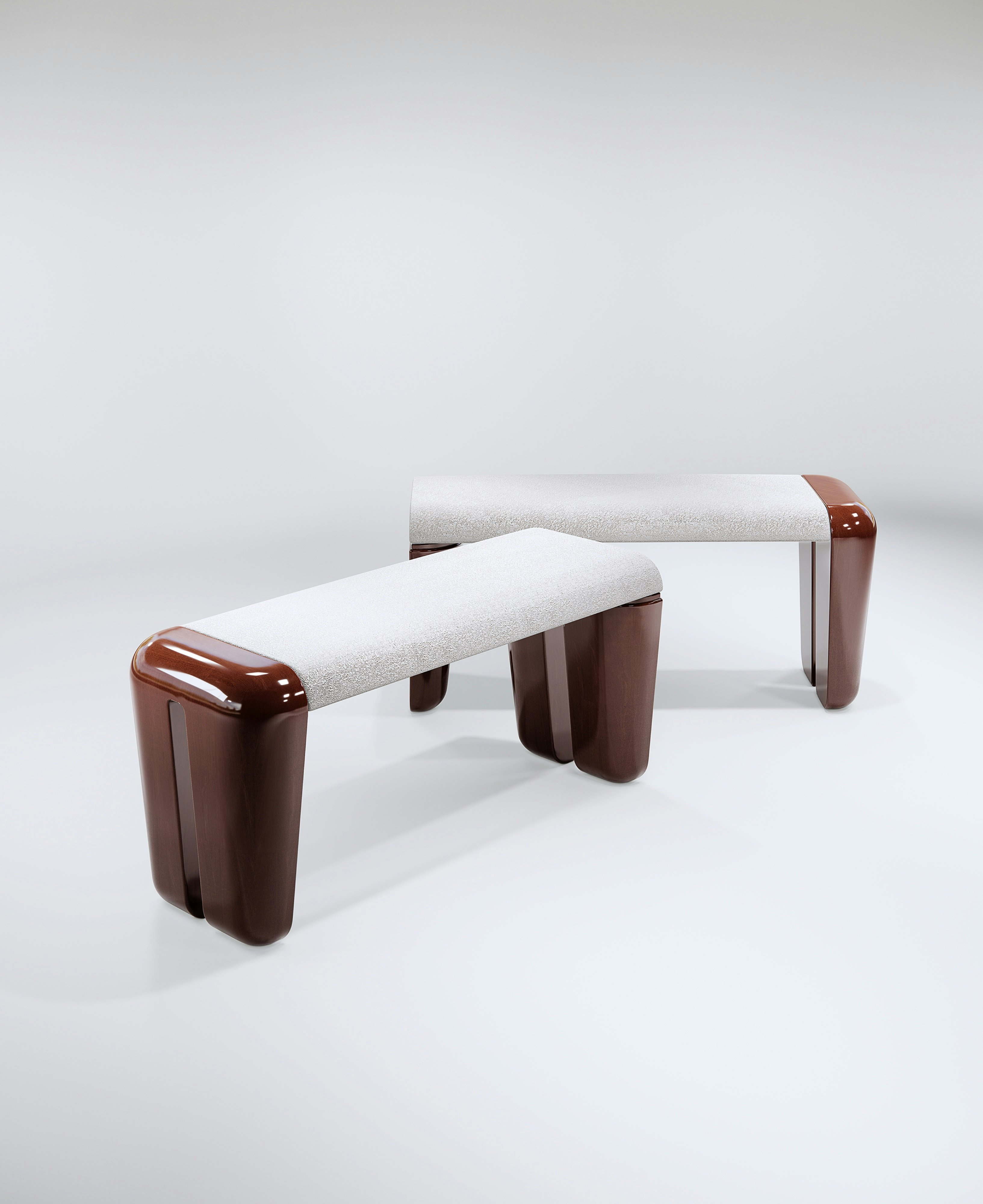 Benches pictured in lacquered red Javanese mahogany and upholstered with fabric.