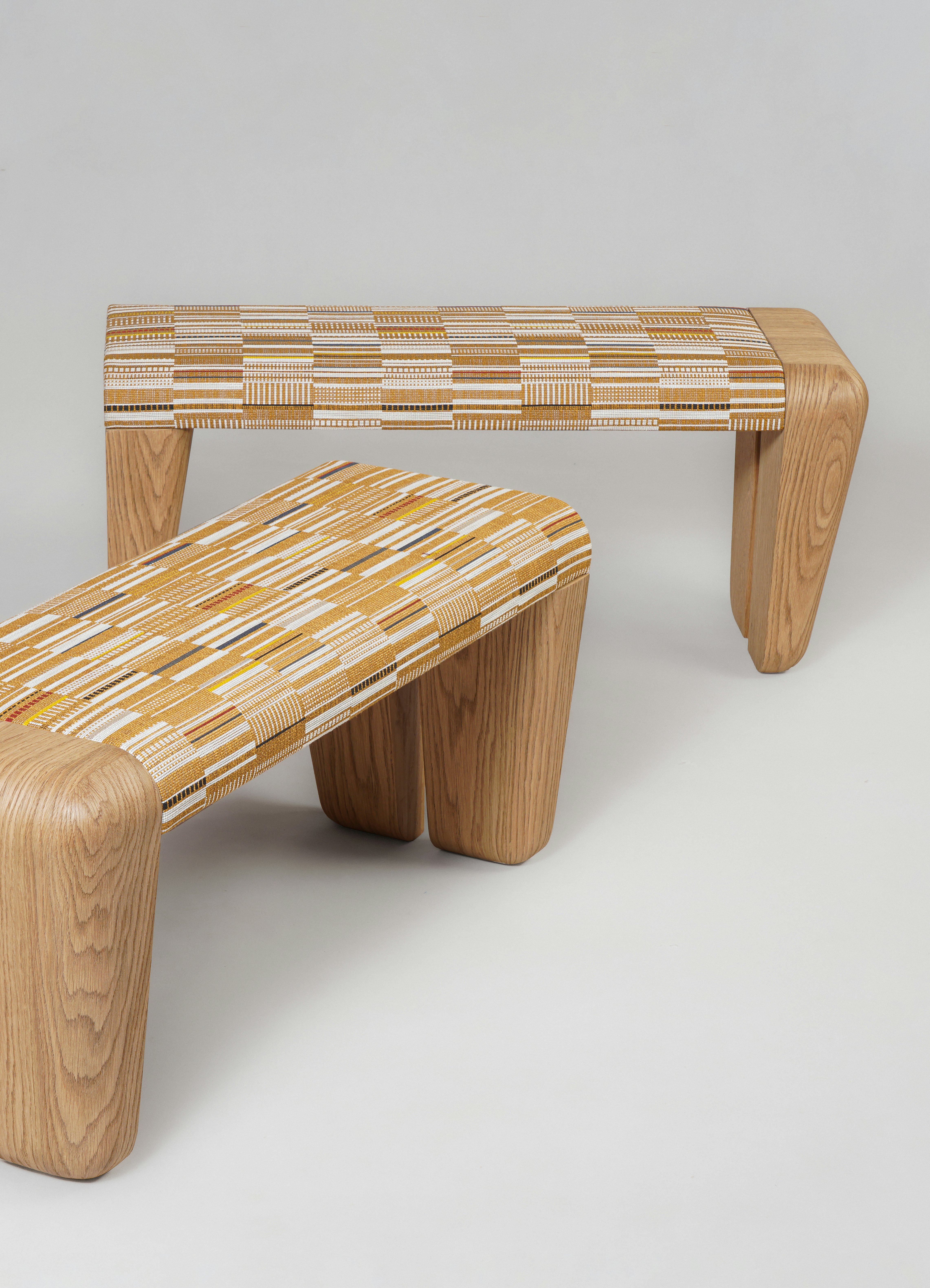 Pair of benches pictured in natural oak and upholstered with Parade by Pollack.