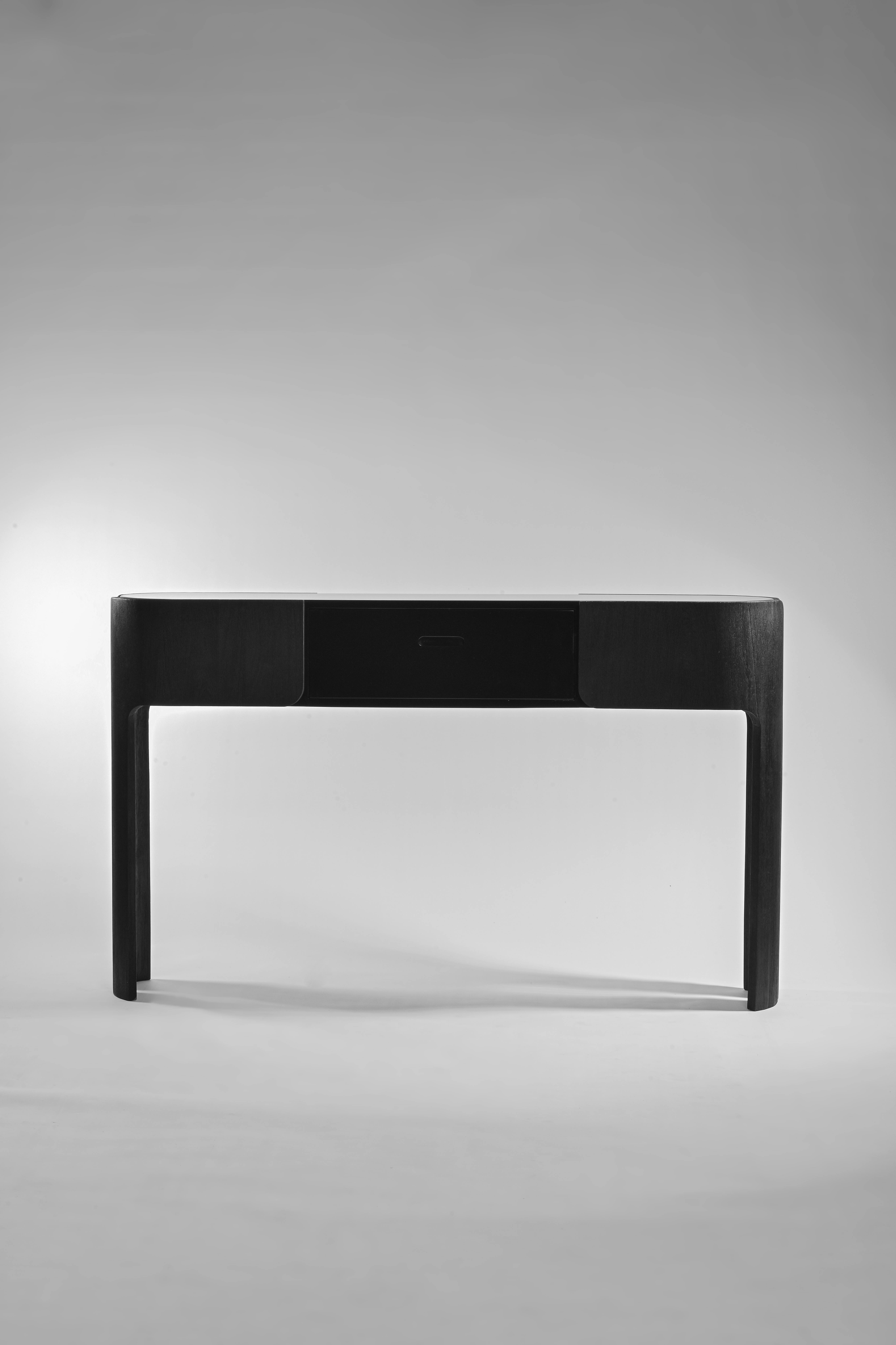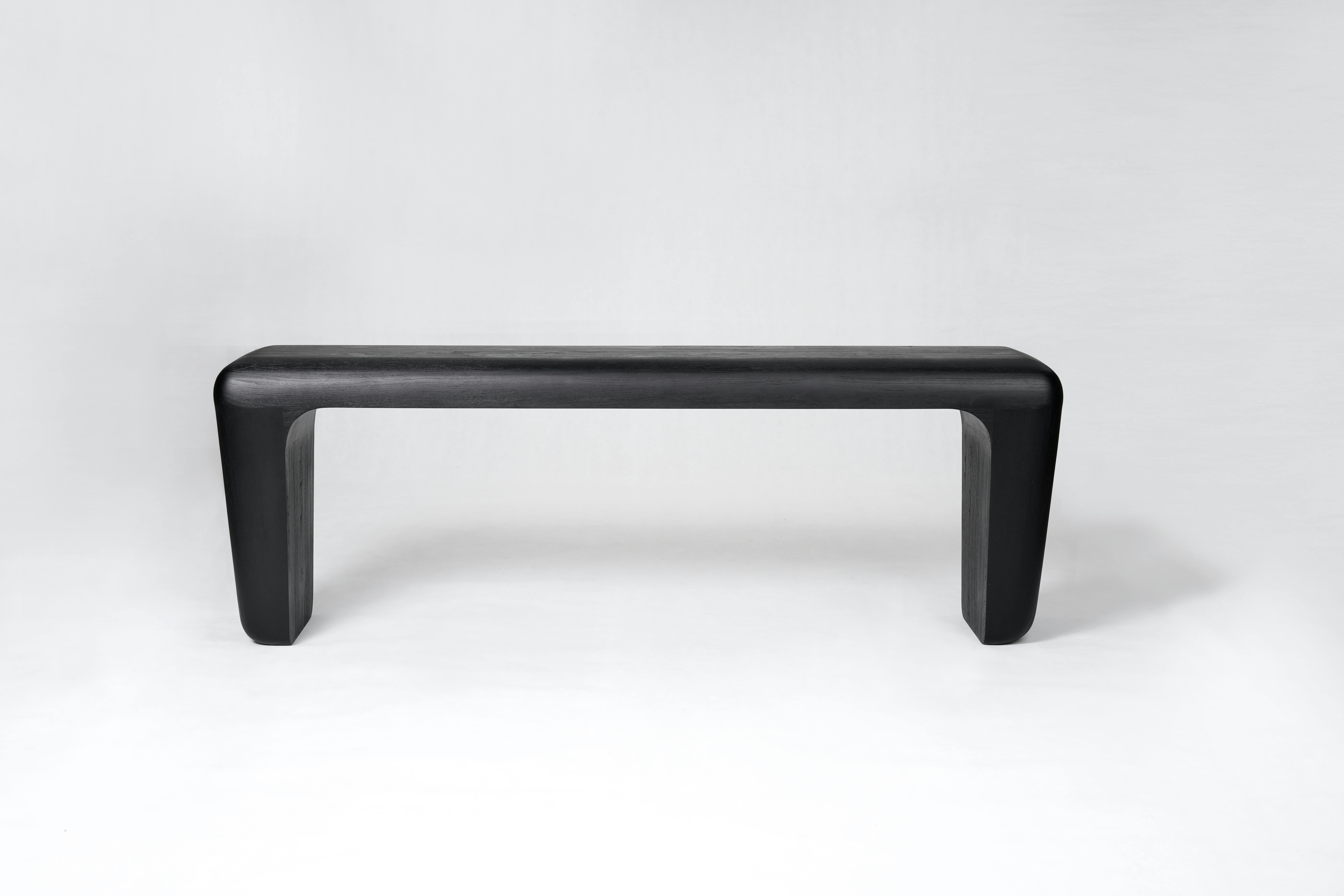 Console pictured in black teak.