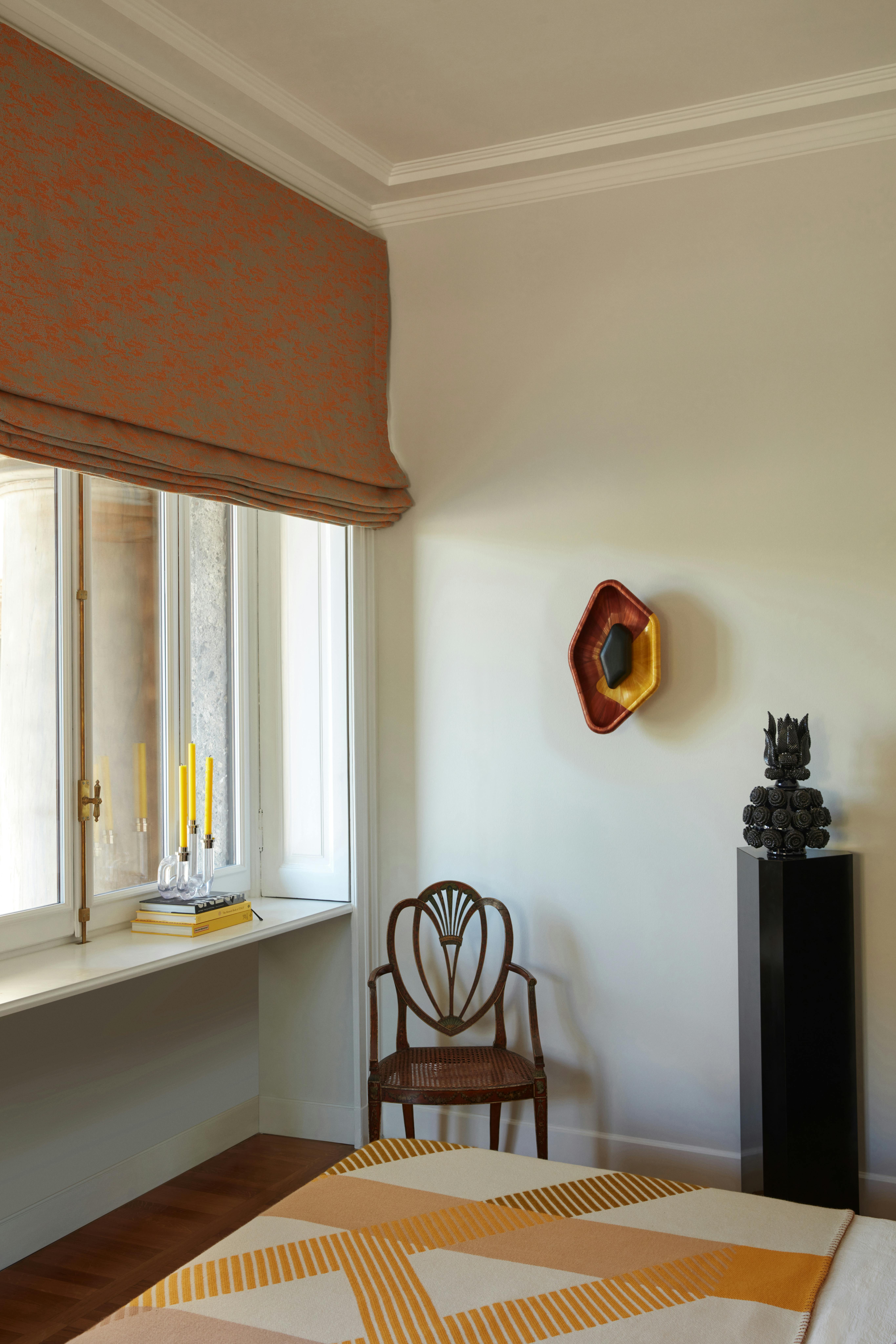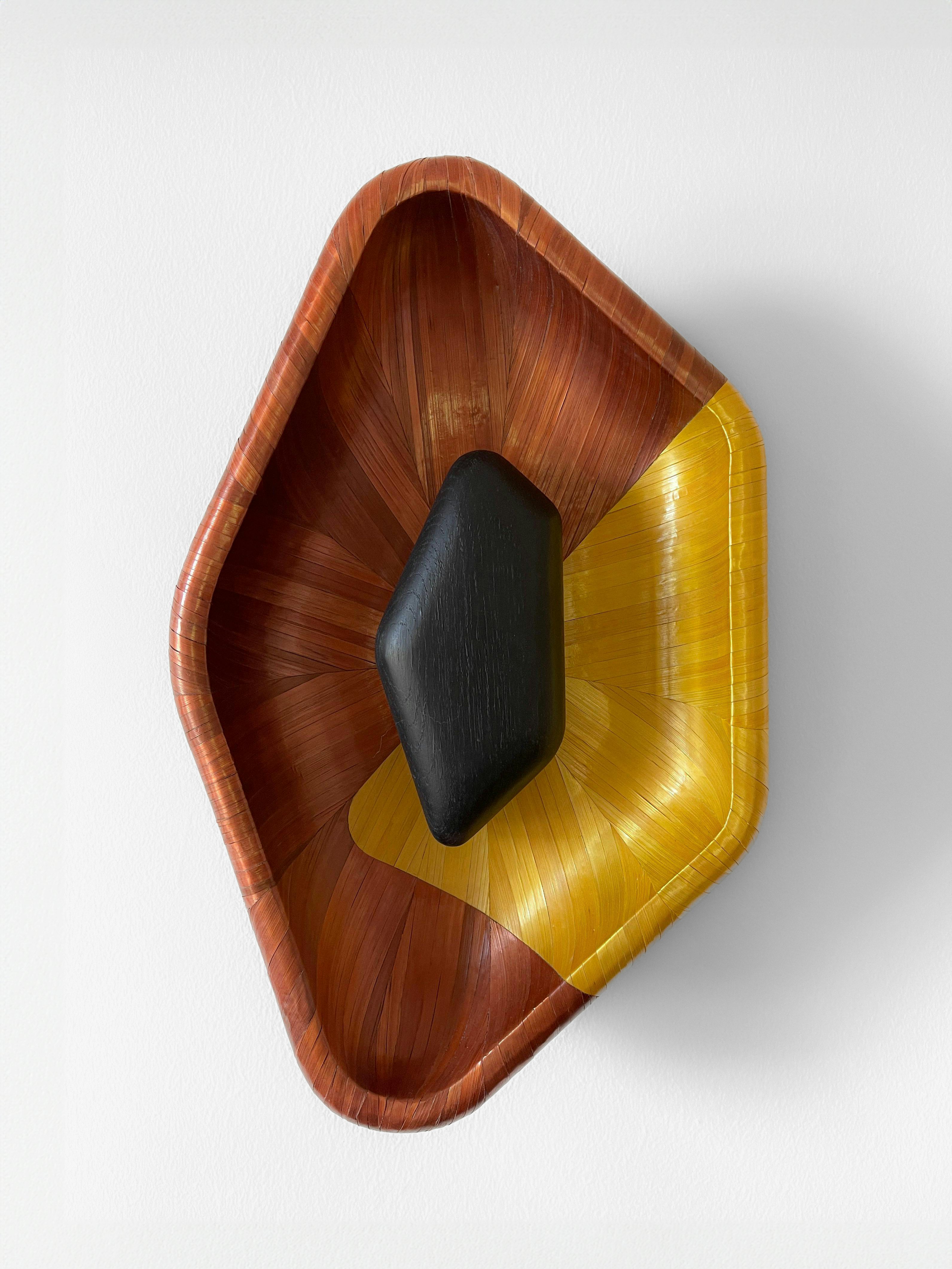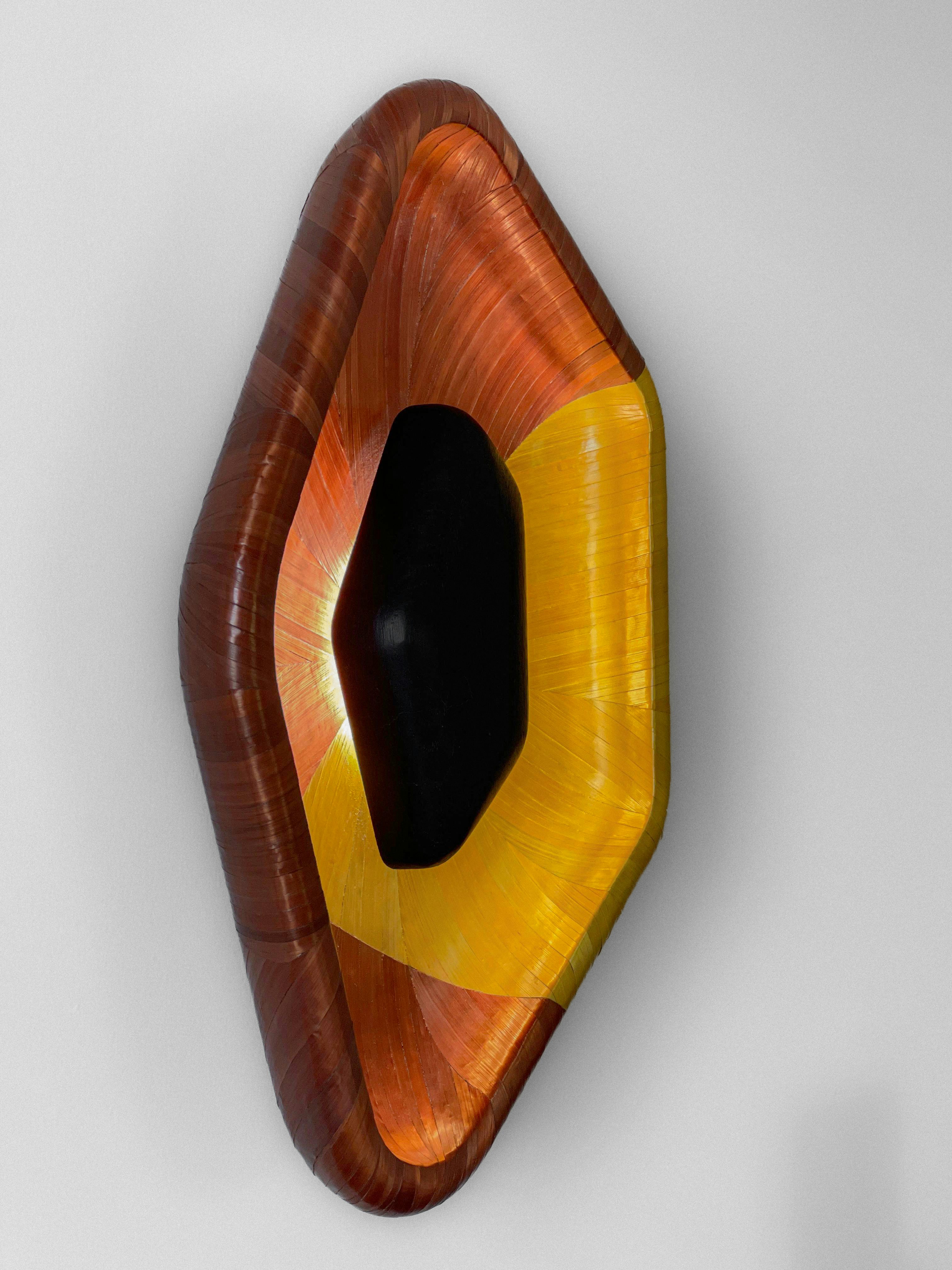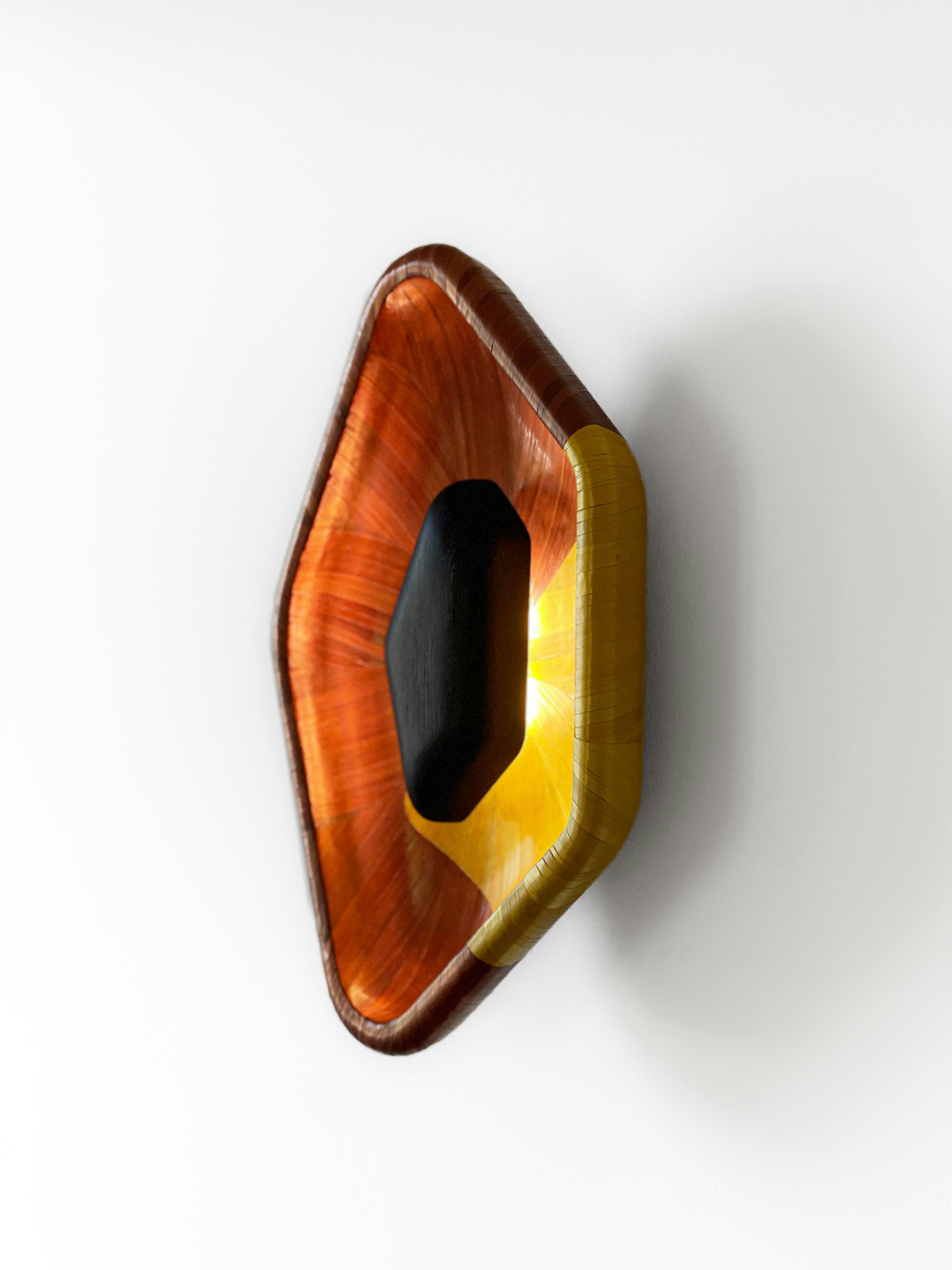 Satara wall light pictured in red and yellow straw marquetry with a center in hand-brushed black oak.