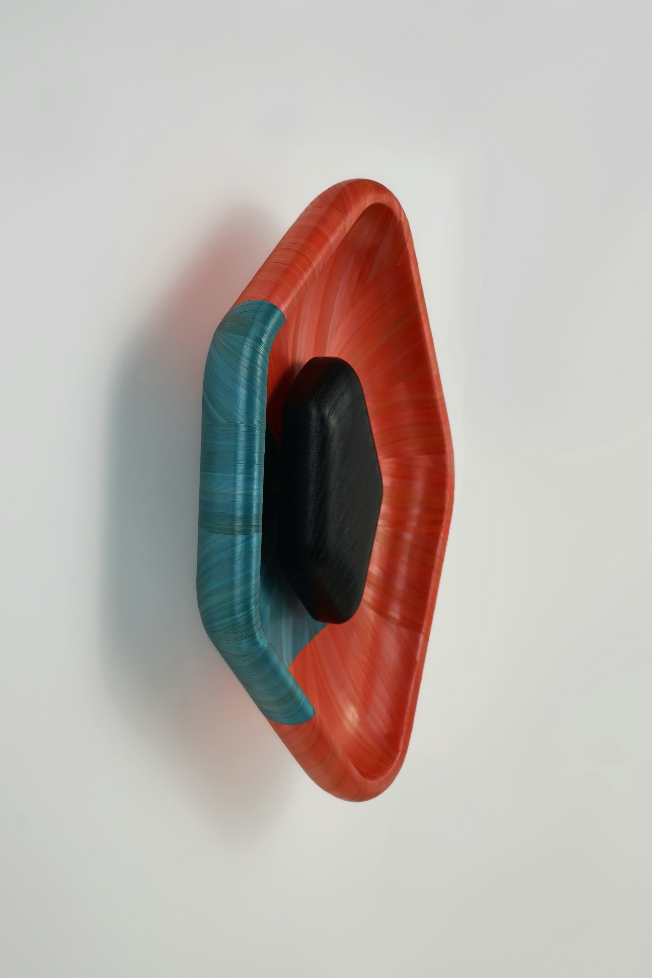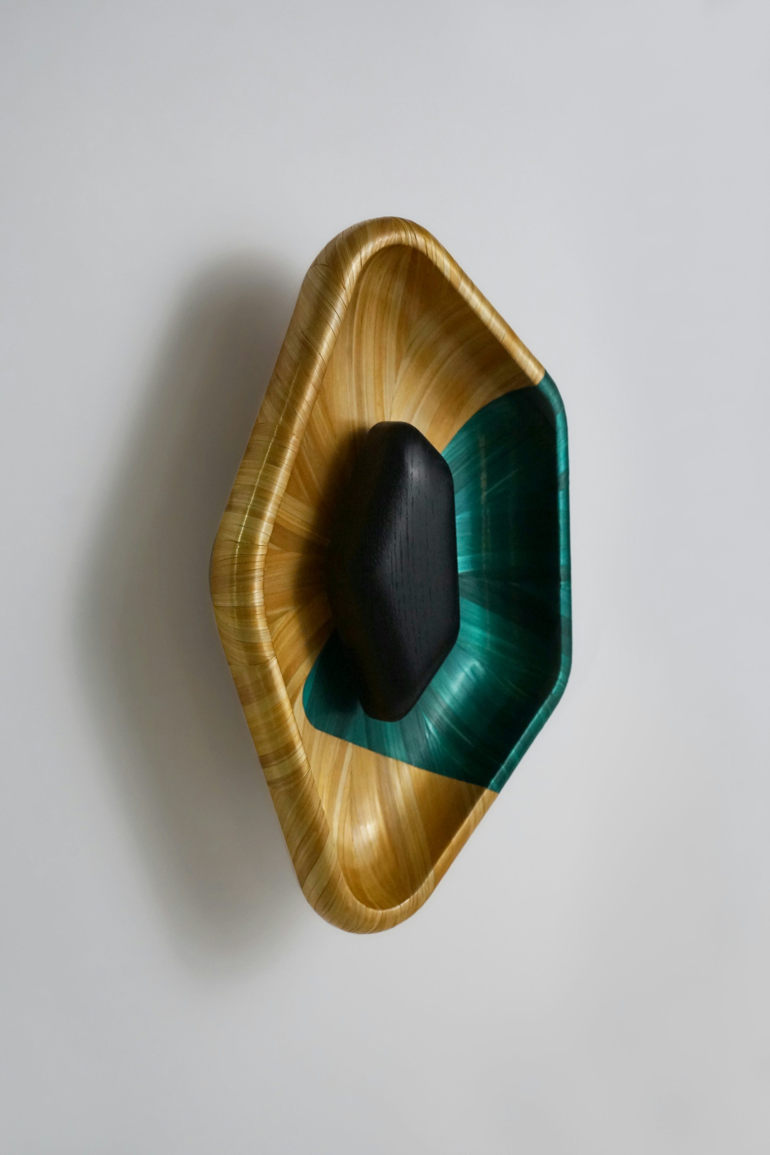 Satara wall light pictured in yellow and green straw marquetry with a center in hand-brushed black oak.