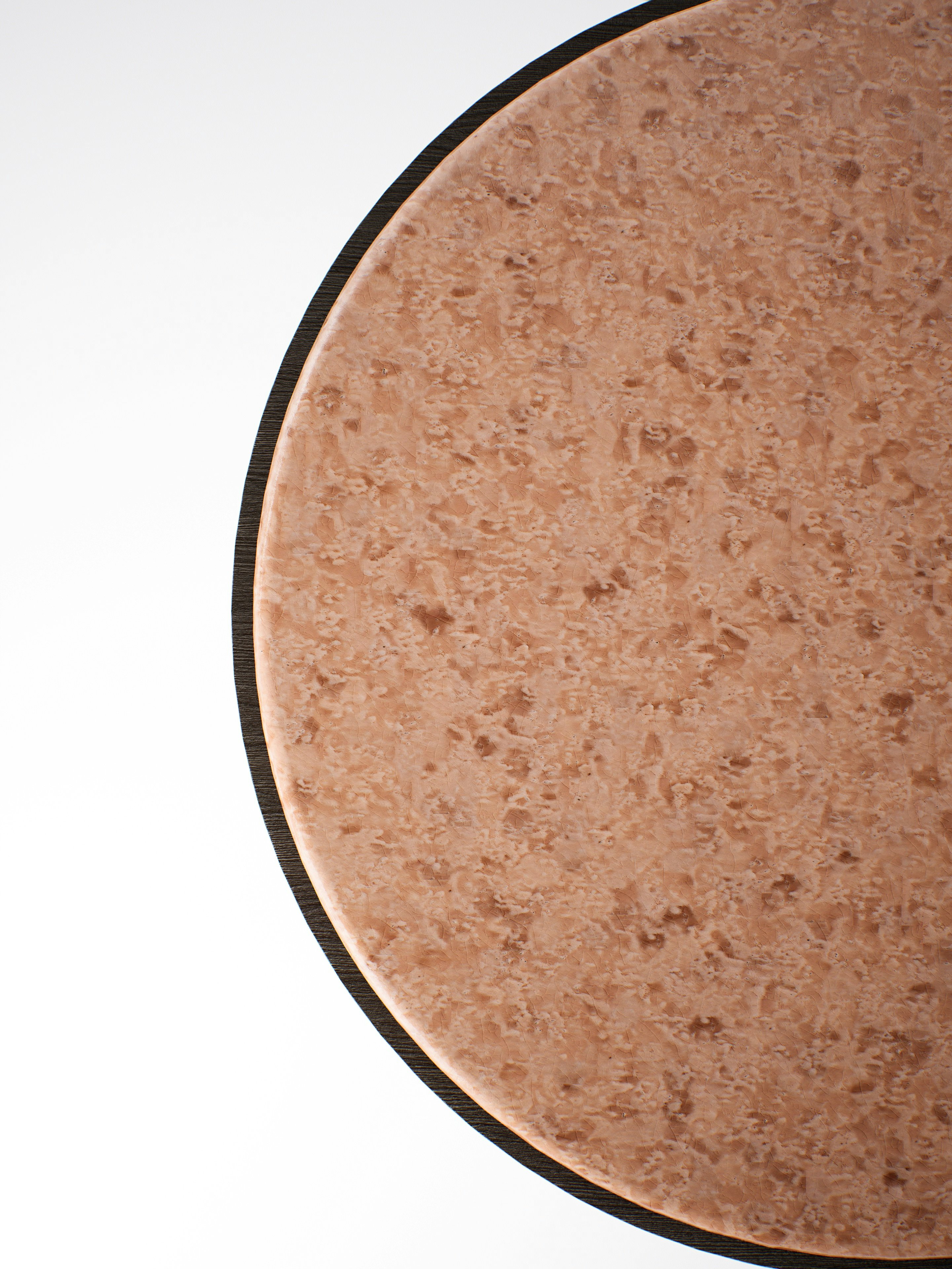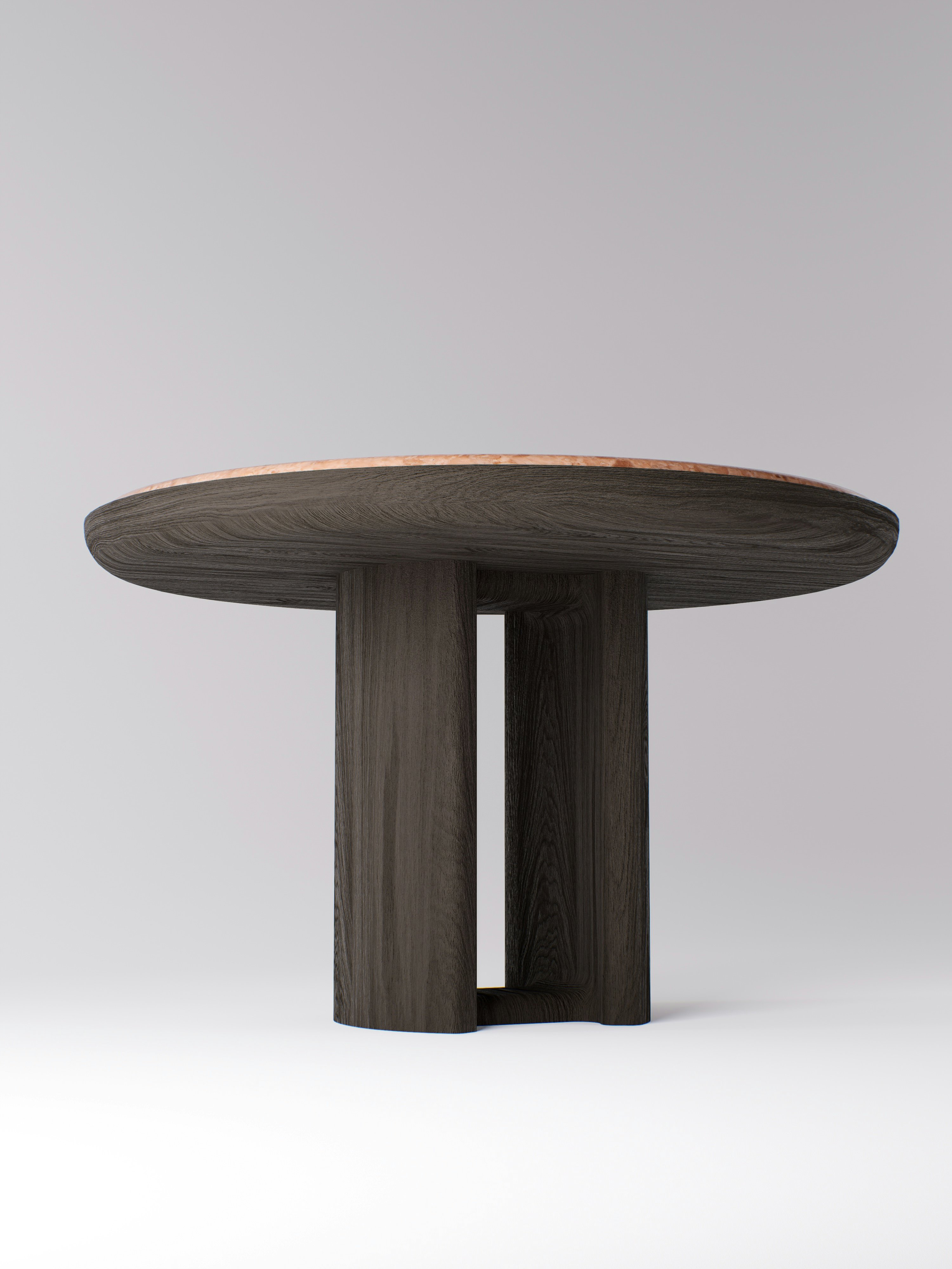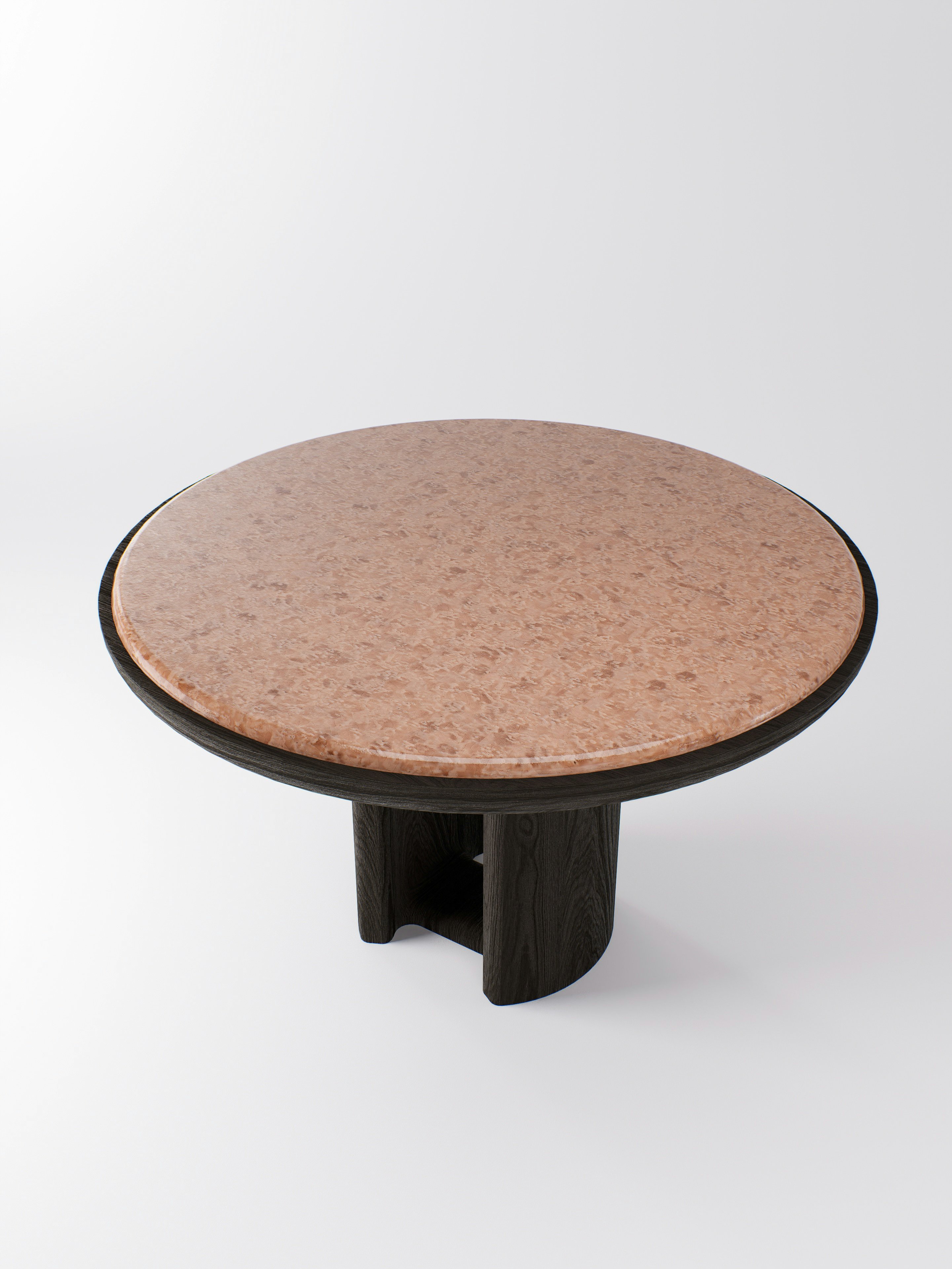 Circular dining table pictured in walnut oak body with a sand crème brûlée lava stone tabletop.