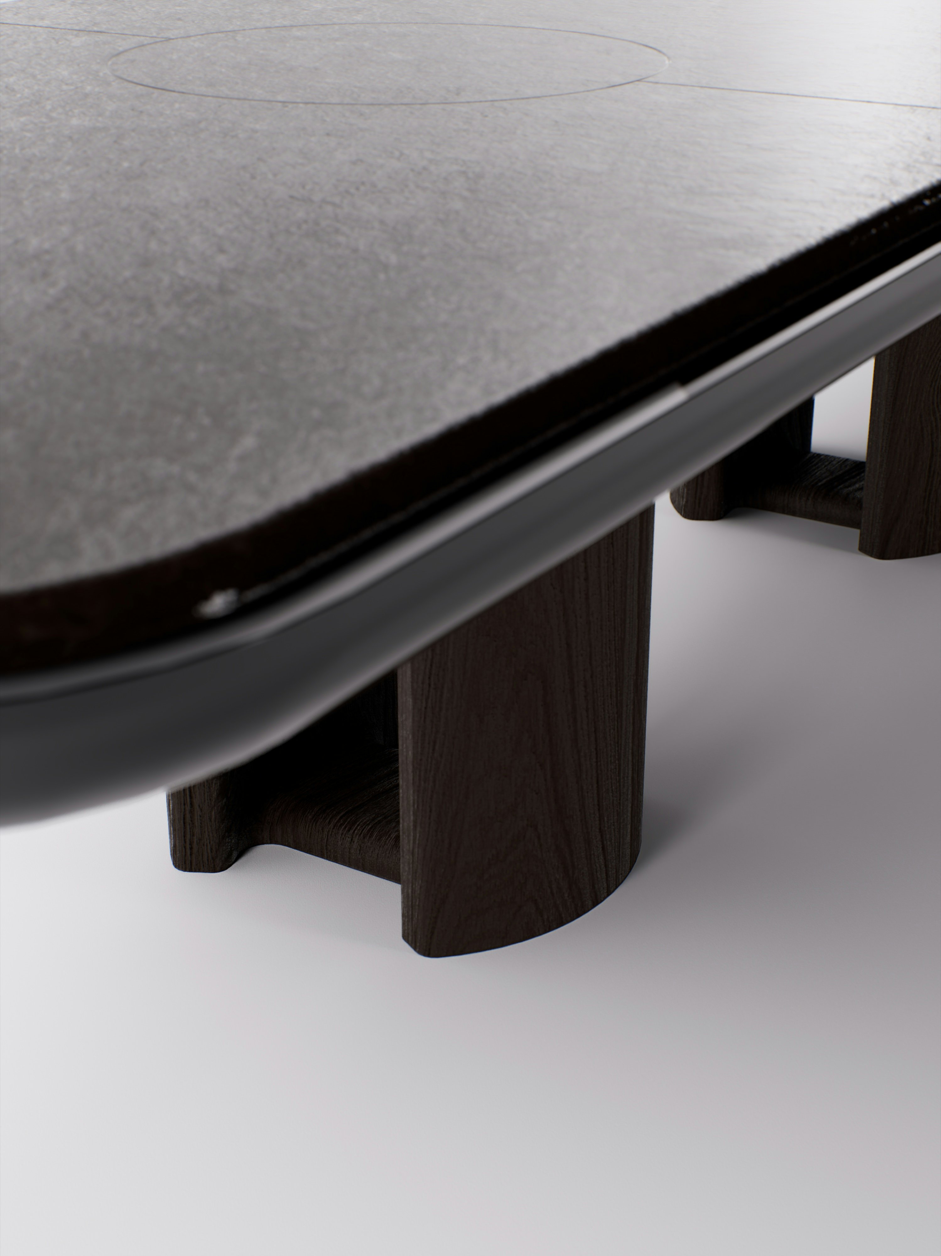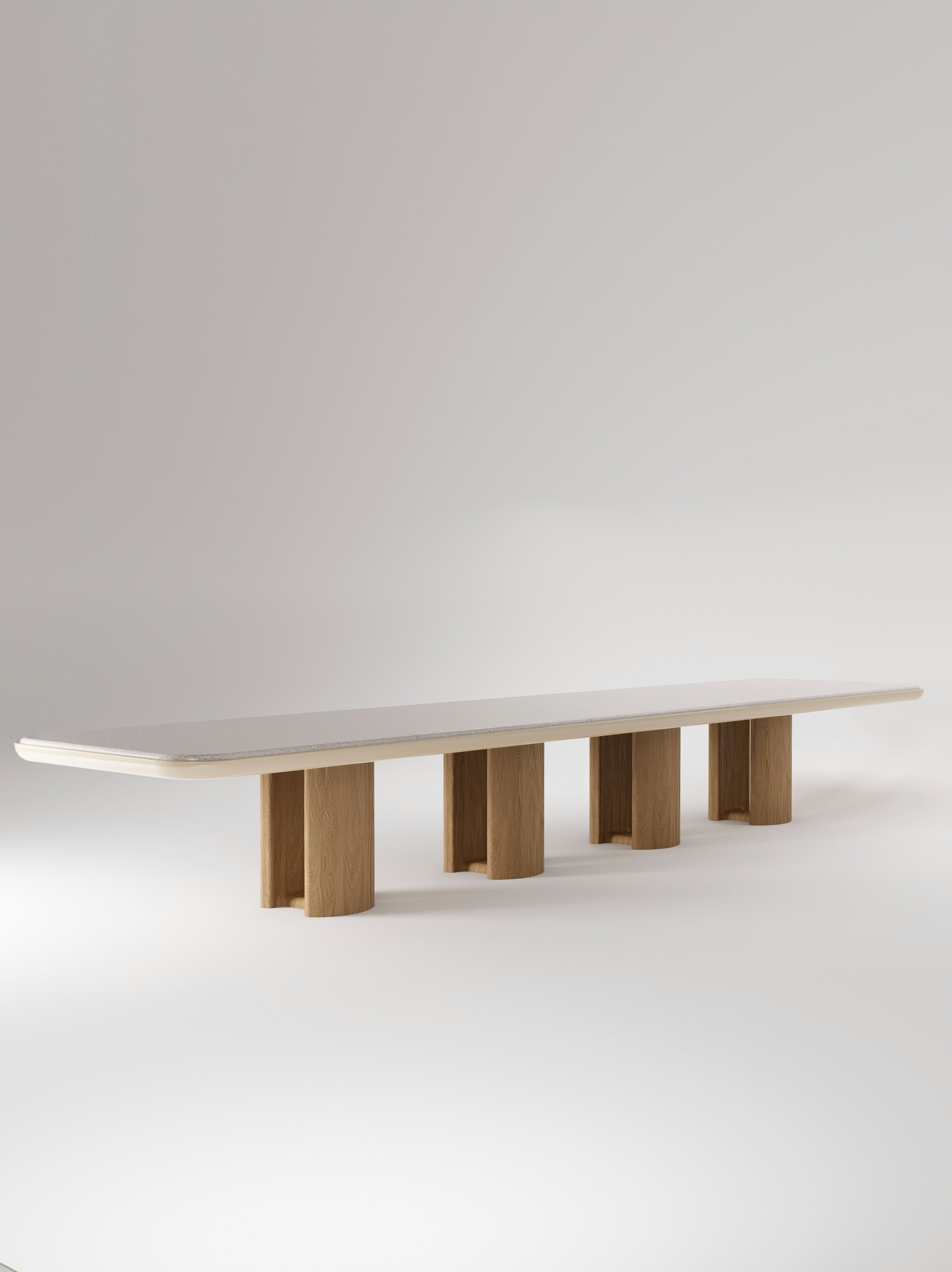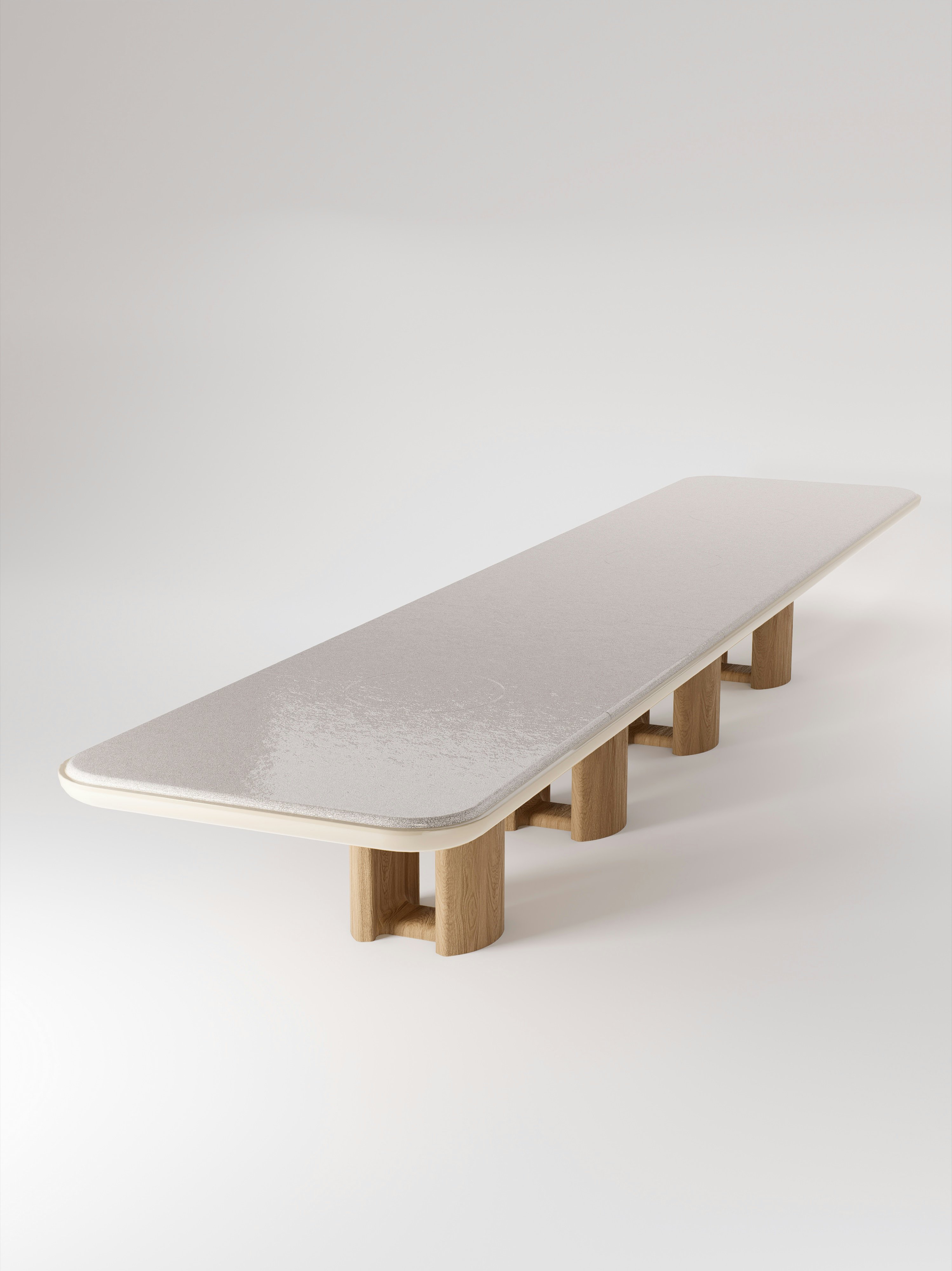 Selene dining table pictured in natural oak, white lacquer edging and a full glazed crackle lava stone tabletop.
