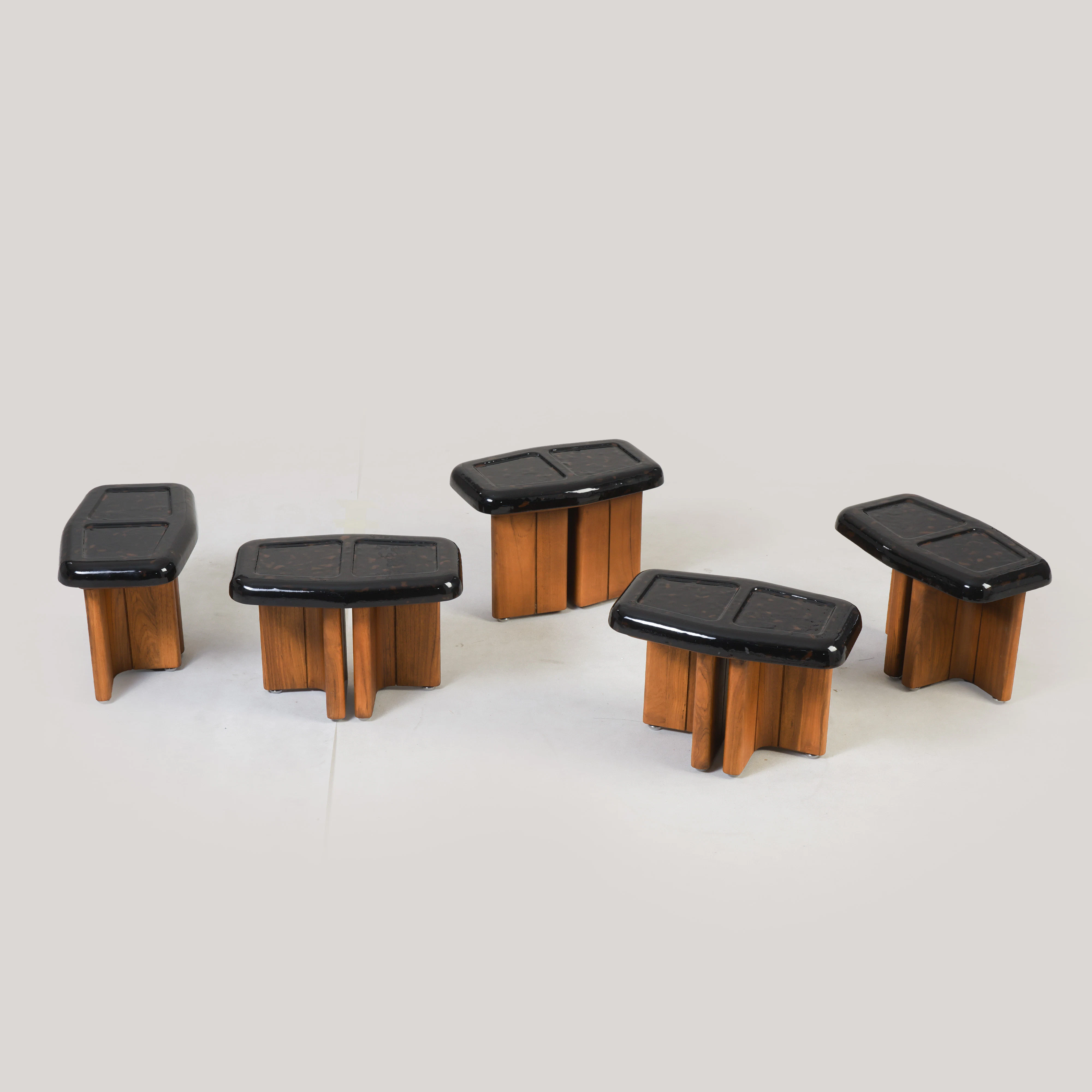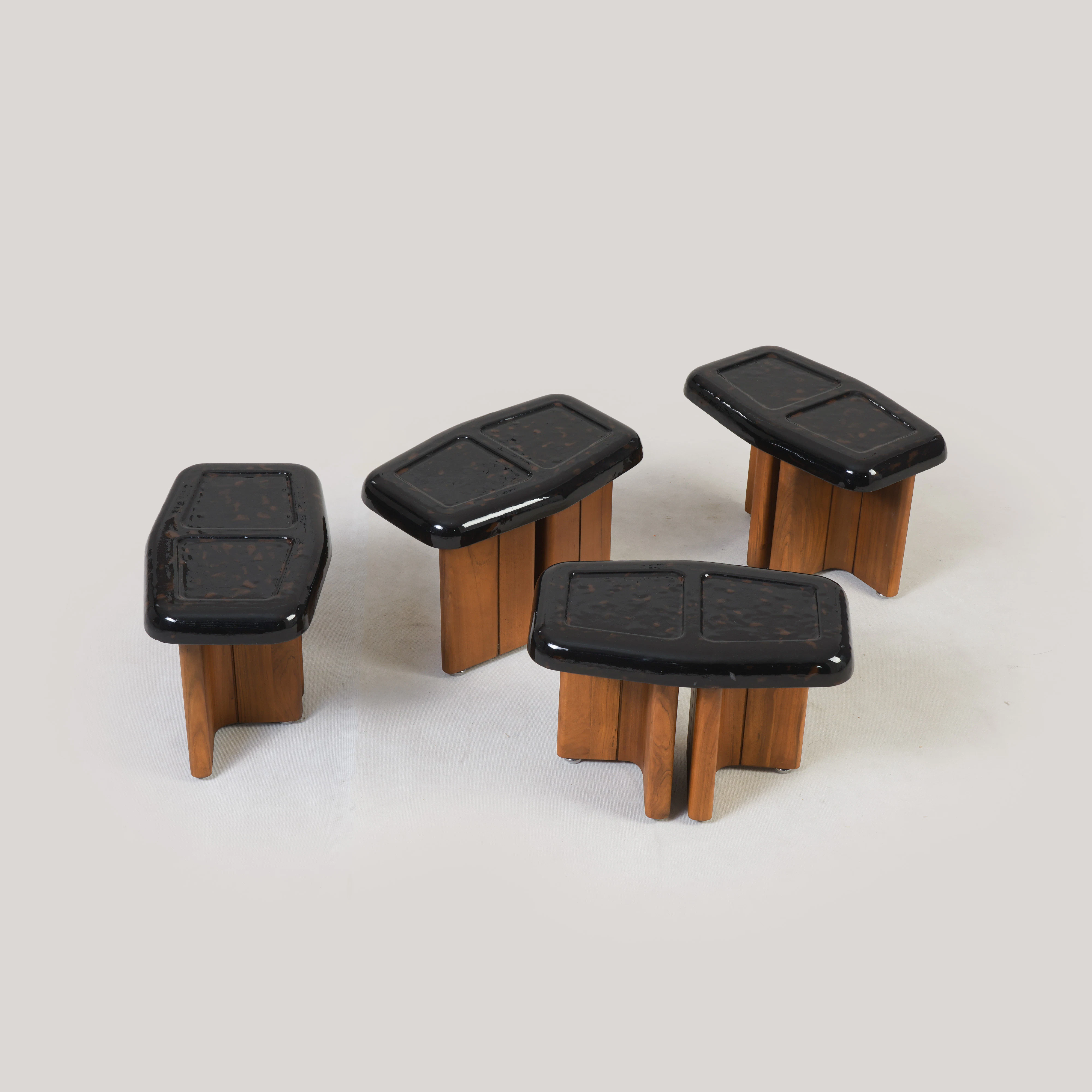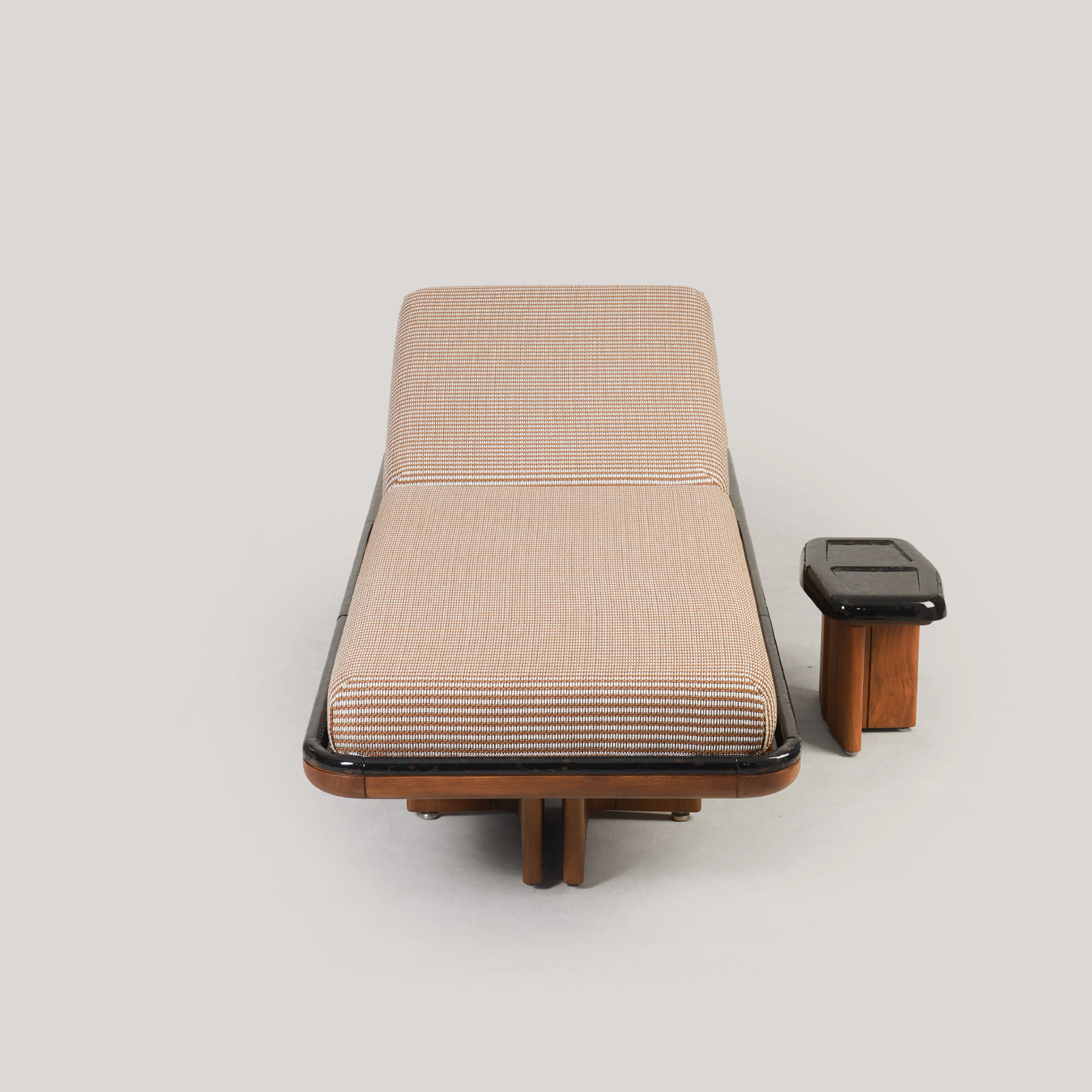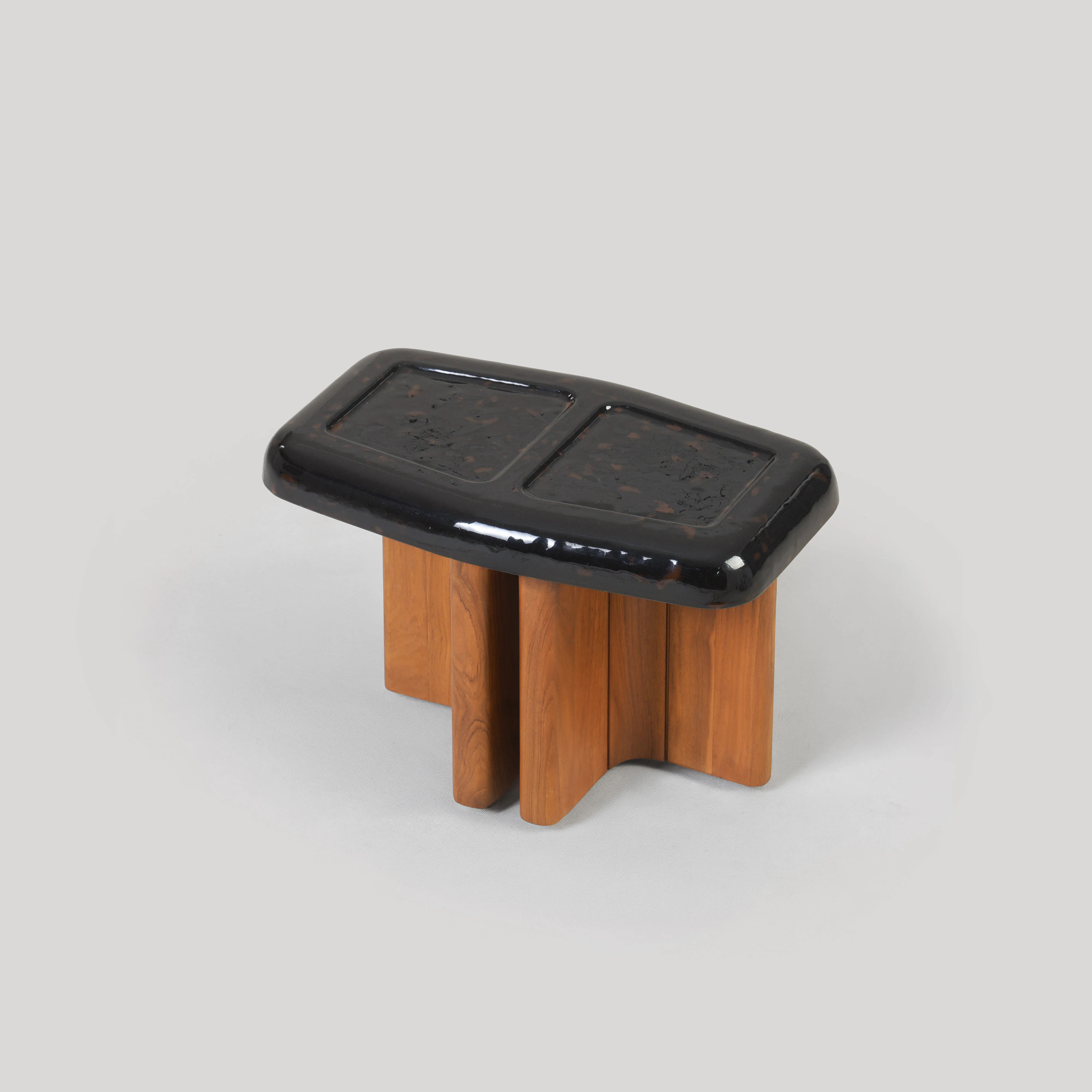 Side table pictured in dark teak with a lava stone crème brûlée tabletop.